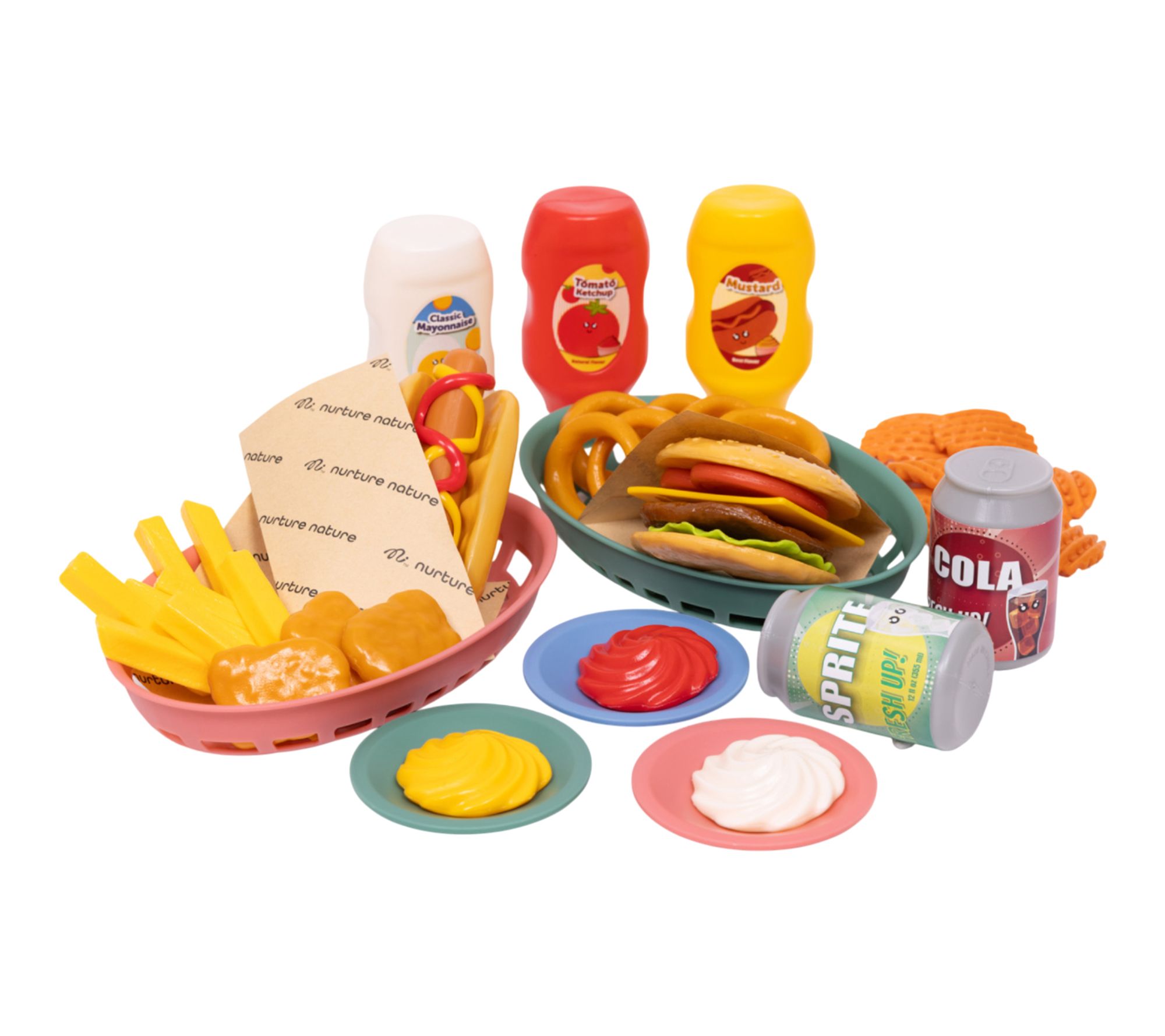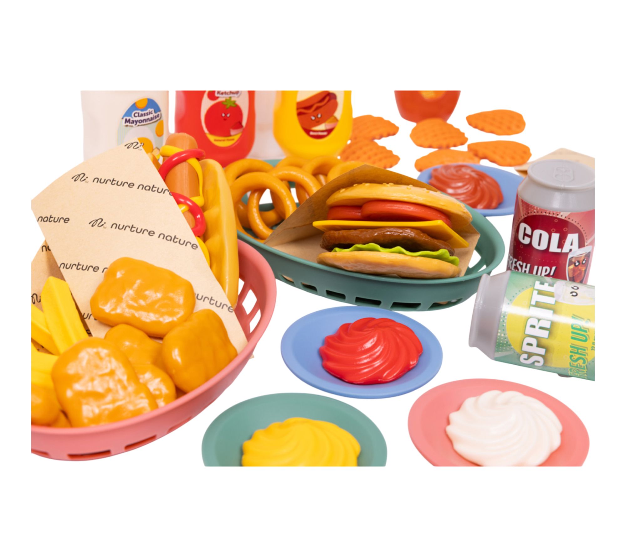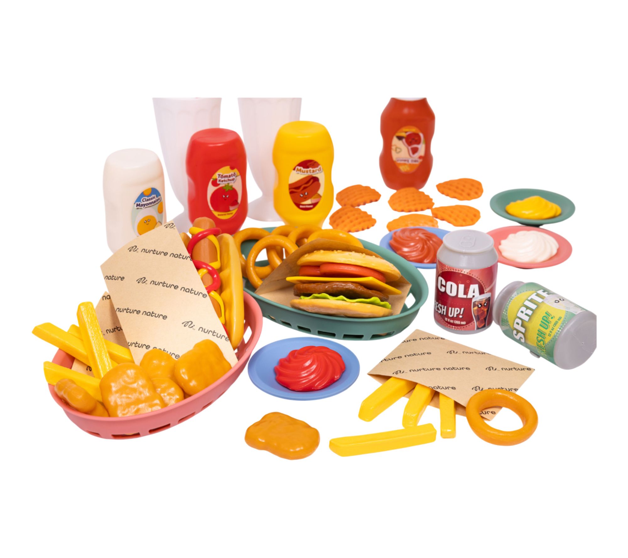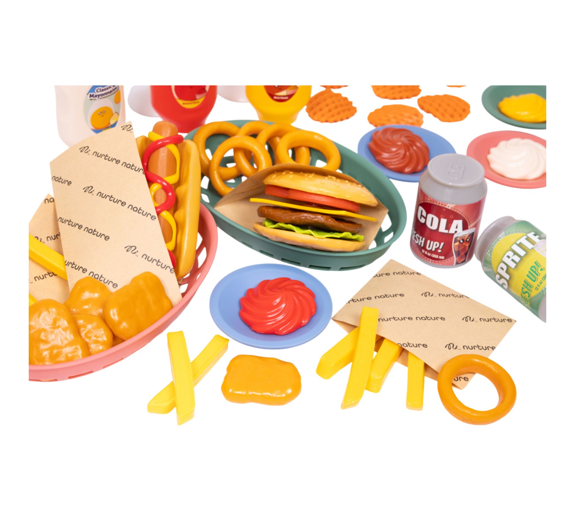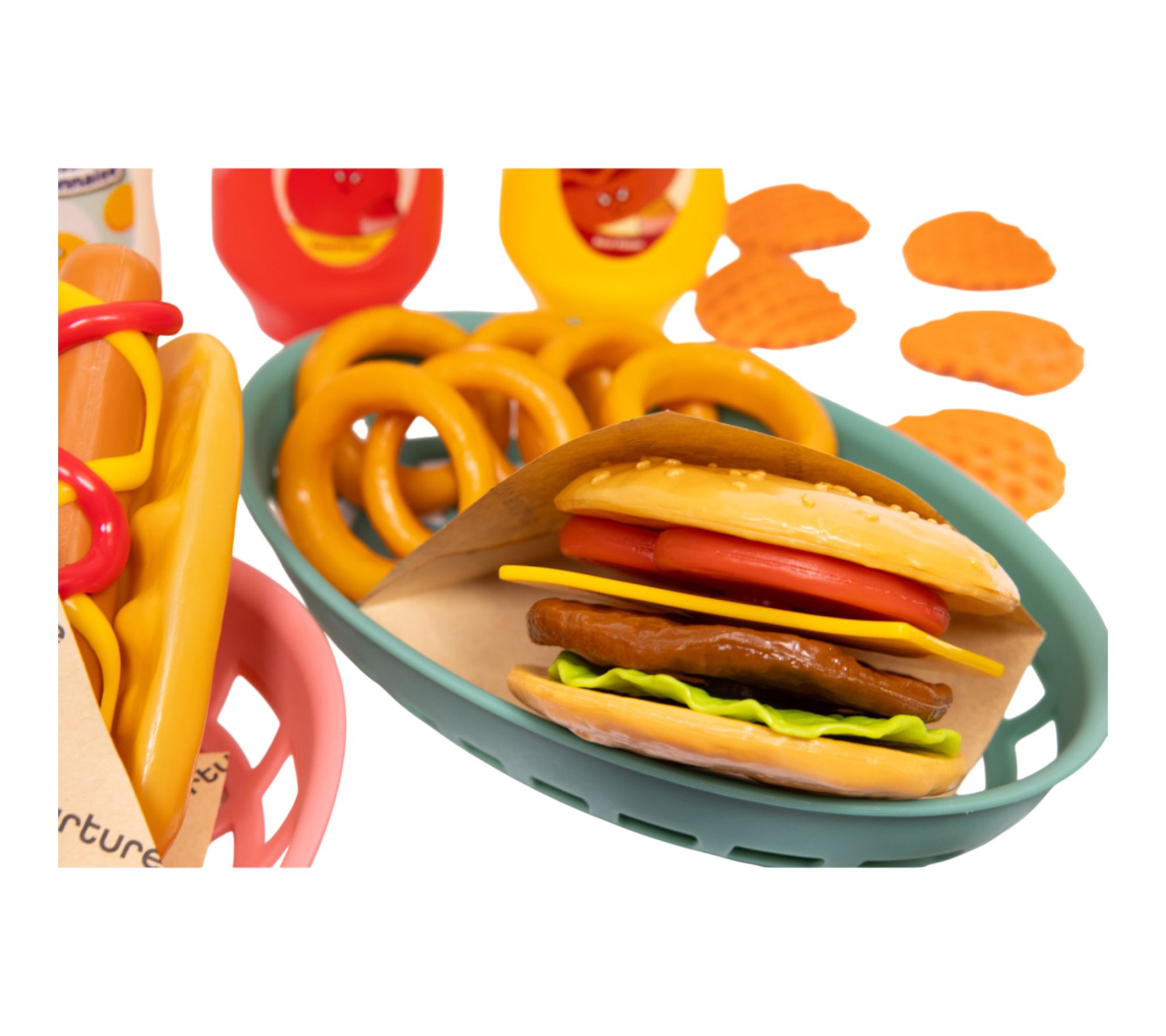 • Includes 56 food pieces: 4 condiments, 2 cups, 2 straws, 2 pop cans, 4 plates, 2 baskets, 4 condiment pours, 1 hotdog, 1 hotdog bun, 1 ketchup swirl, 1 mustard swirl, 2 burger buns, cheese, tomato, lettuce, burger, 5 chicken nuggets, 8 fries, 6 onion rings, 6 waffle fries