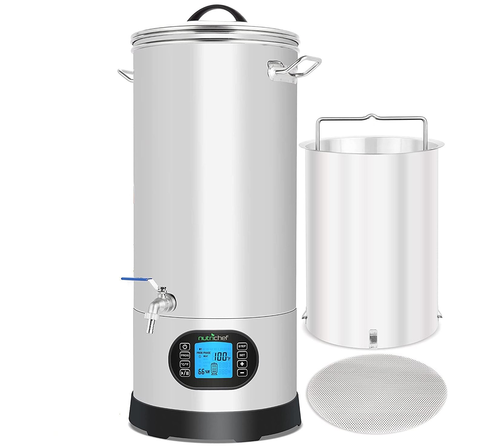 Mashup to 17lbs. of Malt 9 Gallons Maximum Capacity Heavy Duty Single Wall, Stainless Steel Construction Adjustable Program Controller (Switchable from Fahrenheit to Centigrade) Programmable Brew Recipe Automatic Multi-Step Time and Temperature Schedule Adjustable 10 Step Wattage Setting Max Wattage 1600w Extra Large Waterproof LCD Screen Octagonal Wort Draining Stand for Inner Malt Pipe No Hole Handle Design for Lifting Inner Malting Pipe No Grain Leaking into Wort Detachable Filter Screen in Malt Pipe Visible Transparent Glass Lid with Thermometer Hole Plugs Into Standard Wall Outlet Includes Recipe Book for Belgian Wit, IPA, Kolsch, Pale Ale, Pils, Red Ale, Coast Beer, Weissbier, all in 25 Liters Capacity Includes All Necessary Installation Components and Hardware;Stainless Steel Kettle with Program Controller, Glass Lid, Inner Malt Pipe, Filter Screen, Lifting Handle