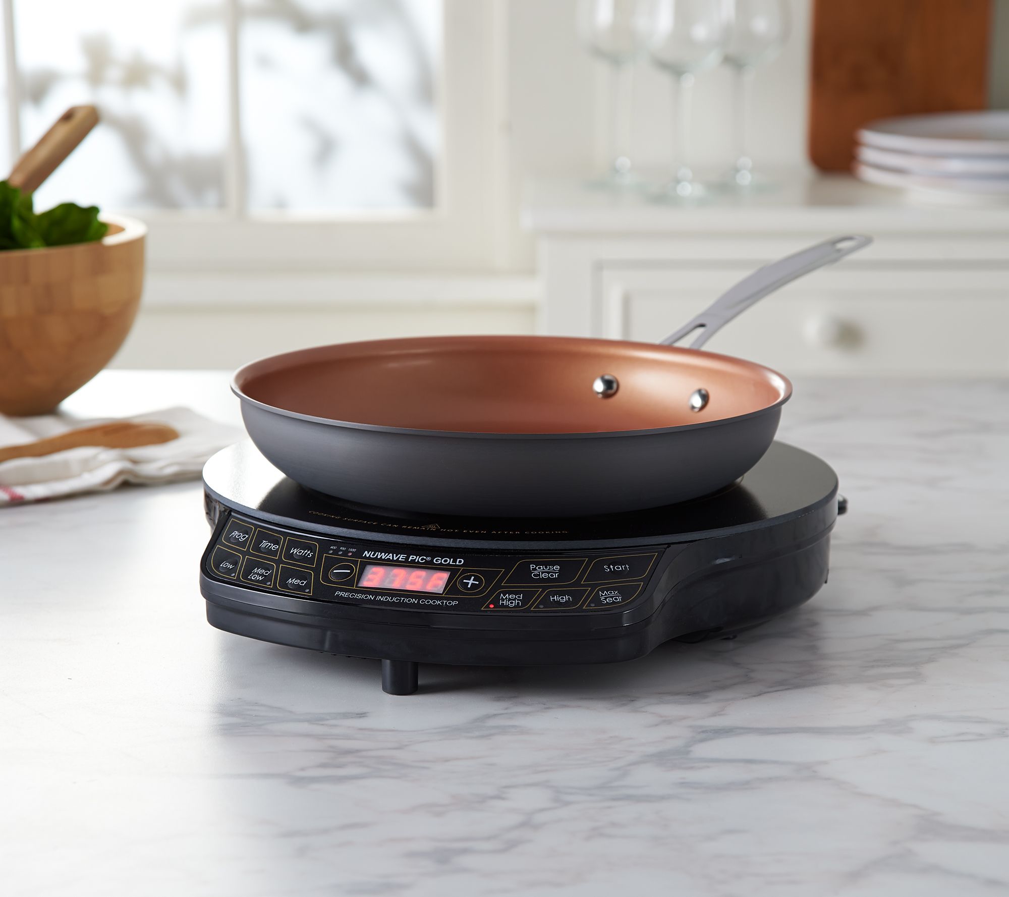 Cooking gold. You can cook quickly and easily with the NuWave Precision Induction Cooktop Gold. Simply adjust the temperature of the cooktop and let it transfer heat to the included 10-1/2" frying pan to make all your favorite meals at home or on the go. With a nonstick pan, cleanup is just as easy. From NuWave.