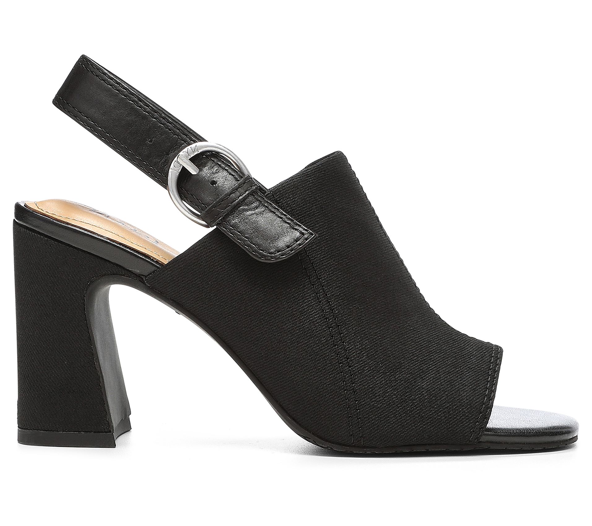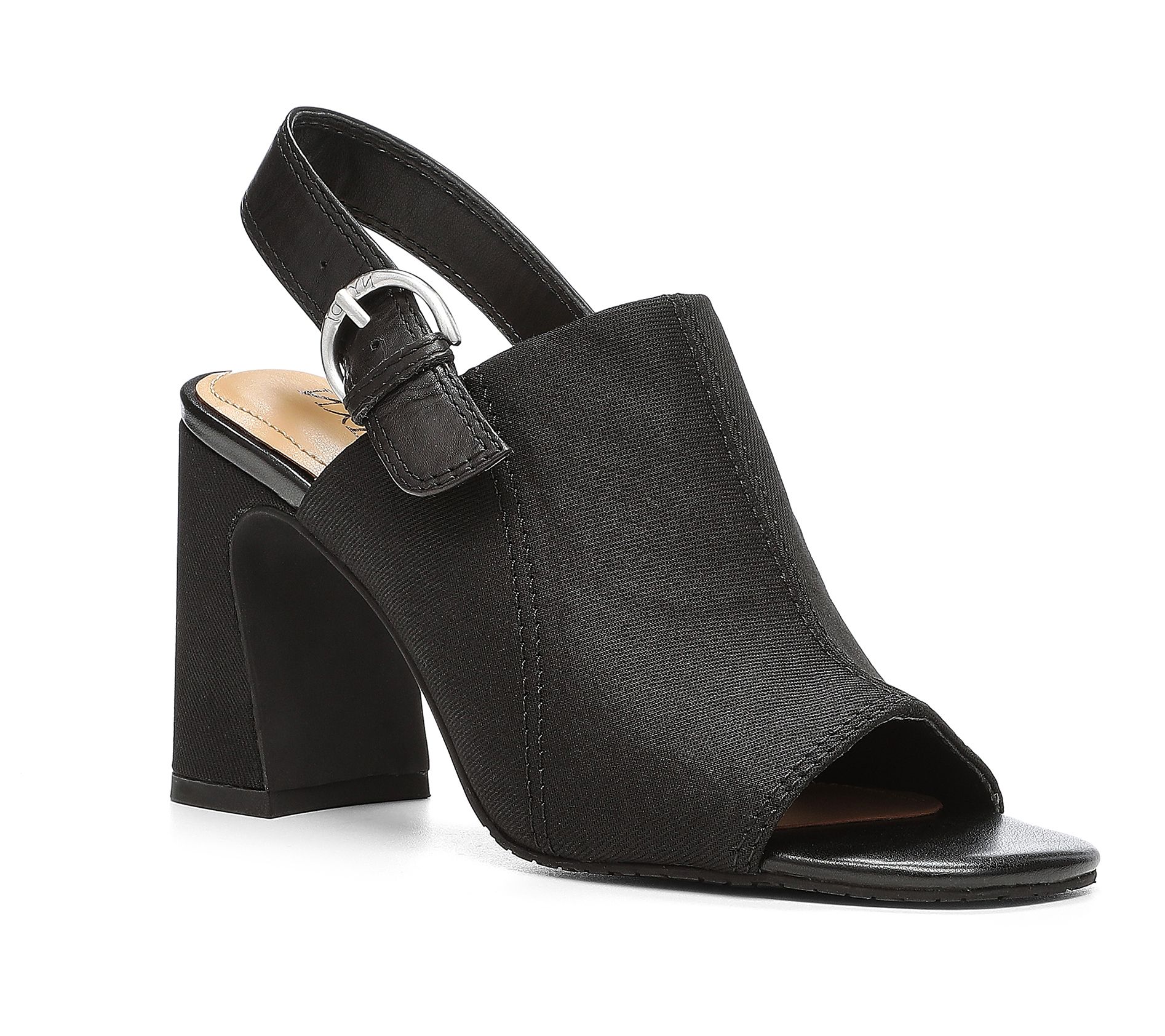 • Slingback strap with elastic and buckle closure, flared block heel, squared toe