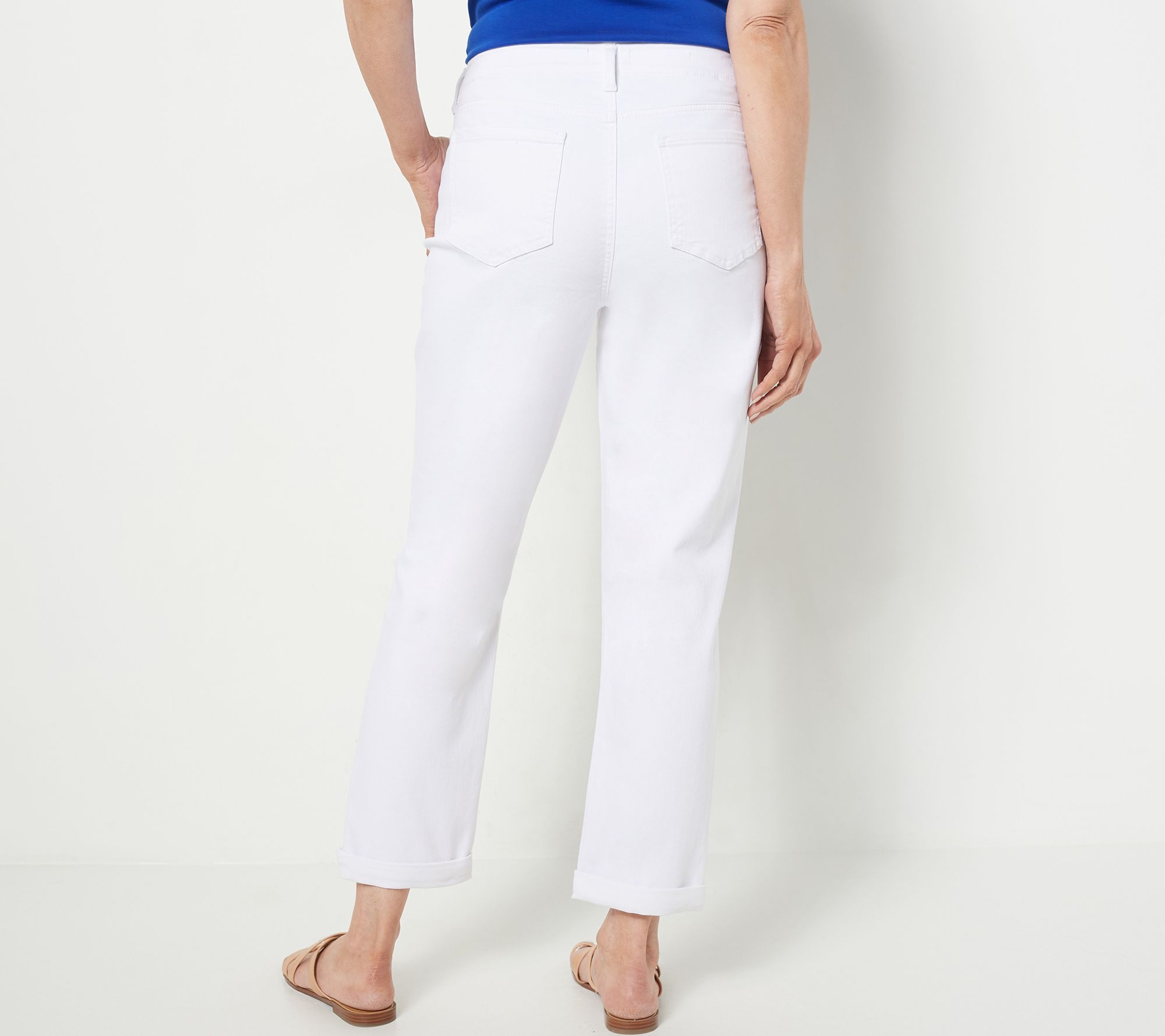 Woven, Cool Embrace(R) Denim, Girlfriend Jeans with Wide Waistband, Zip-Fly Front w/ Button Closure, 5-Pocket Styling, Adjustable Rolled Cuffs and Lift Tuck(R) Technology. *NOT a QVC Fit* Select one size down for your perfect fit. Semi-Fitted: Follows the lines of the body with added wearing ease; At Waist;Slim. Inseam: 26.5". Content: 77% Cotton/ 21% Coolmax(R) Polyester/ 2% Lycra(R) Elastane Care: TGIO/MWCGC/WWLC/ONCBWN/LD/WIIN/DNDC. Imported. (S).