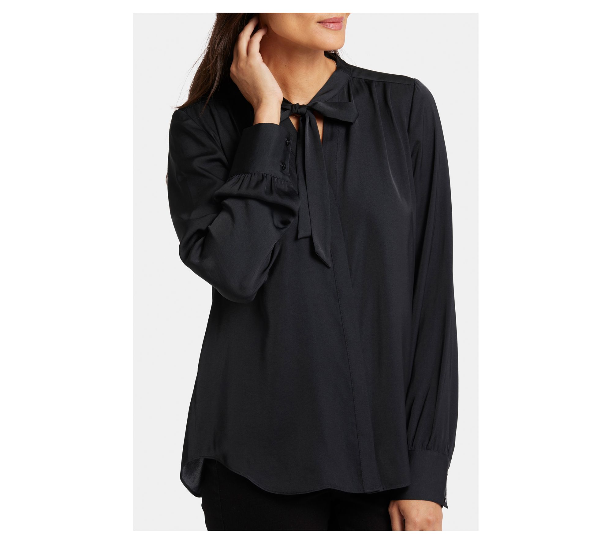 NYDJ's tie-neck blouse makes an elegant statement. With a versatile neck tie that can be styled up or left down, and long blouson sleeves, this blouse exudes sophistication. The glossy satin fabric makes it perfect for both casual and formal occasions, effortlessly pairing with your favorite jeans or trousers for a chic and polished look. From NYDJ.