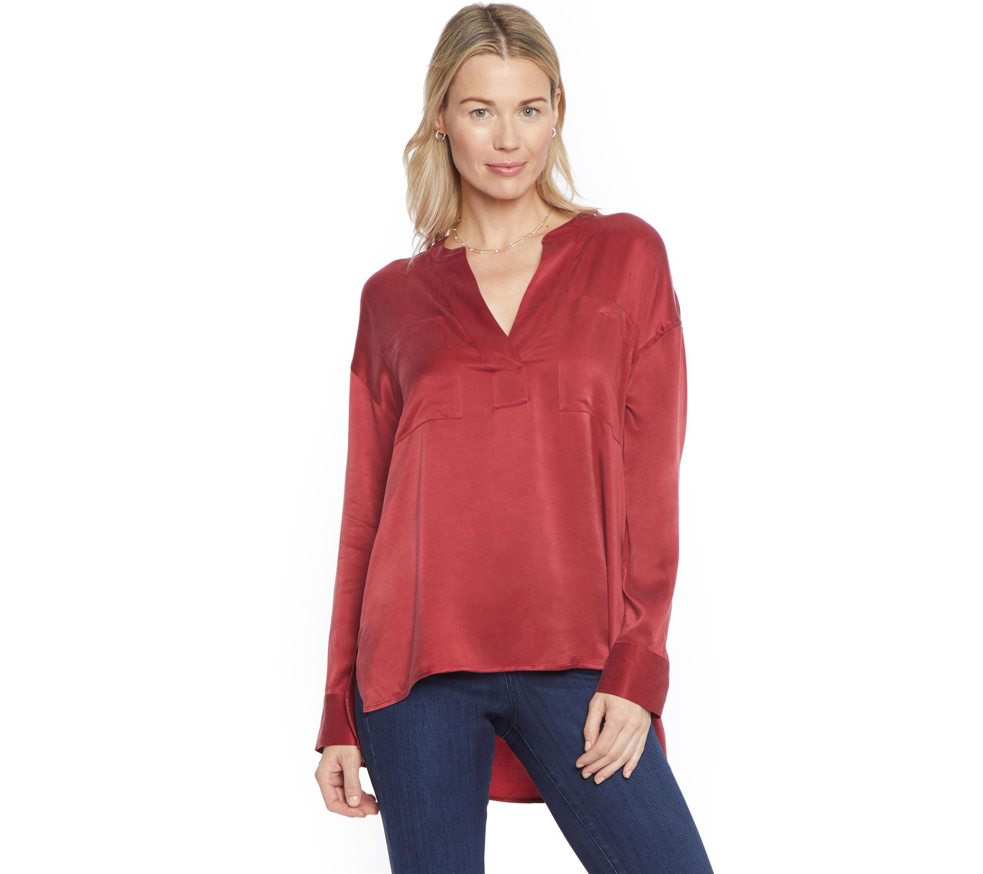 An elevated take on a casual classic, this charmeuse Henley features a chic high-low silhouette and split neckline. How pretty! From NYDJ.