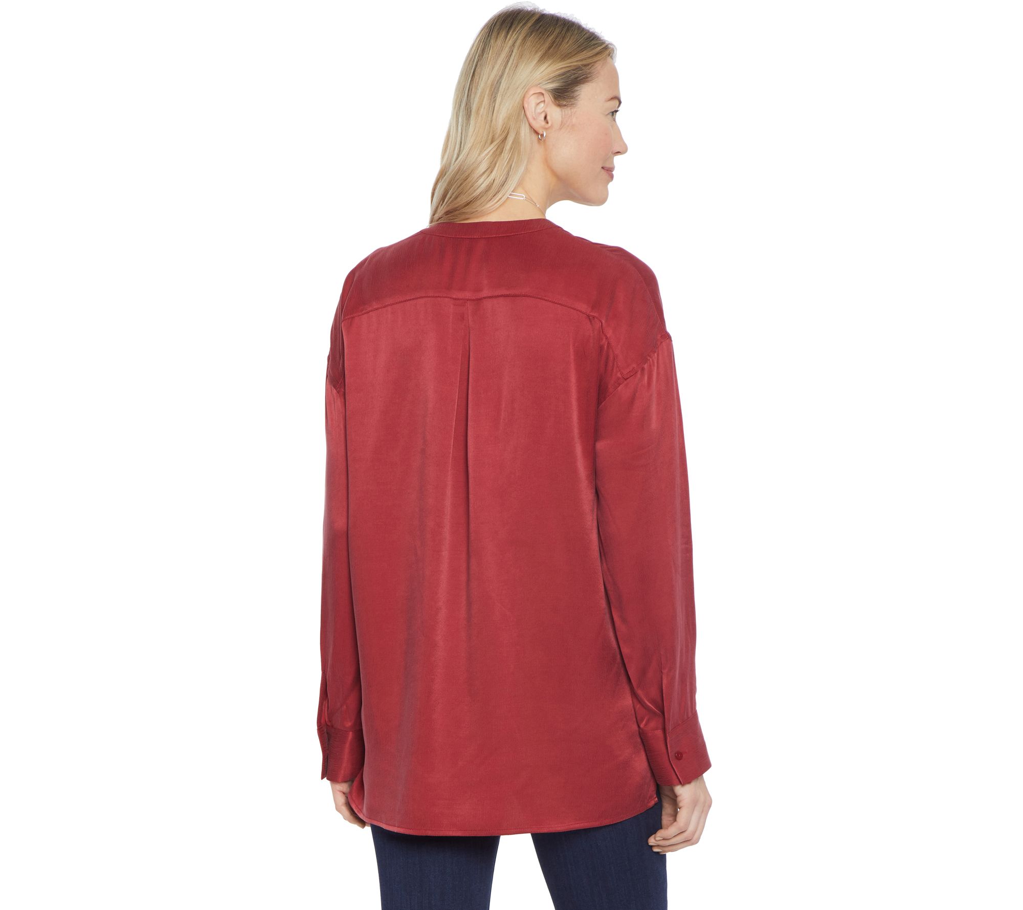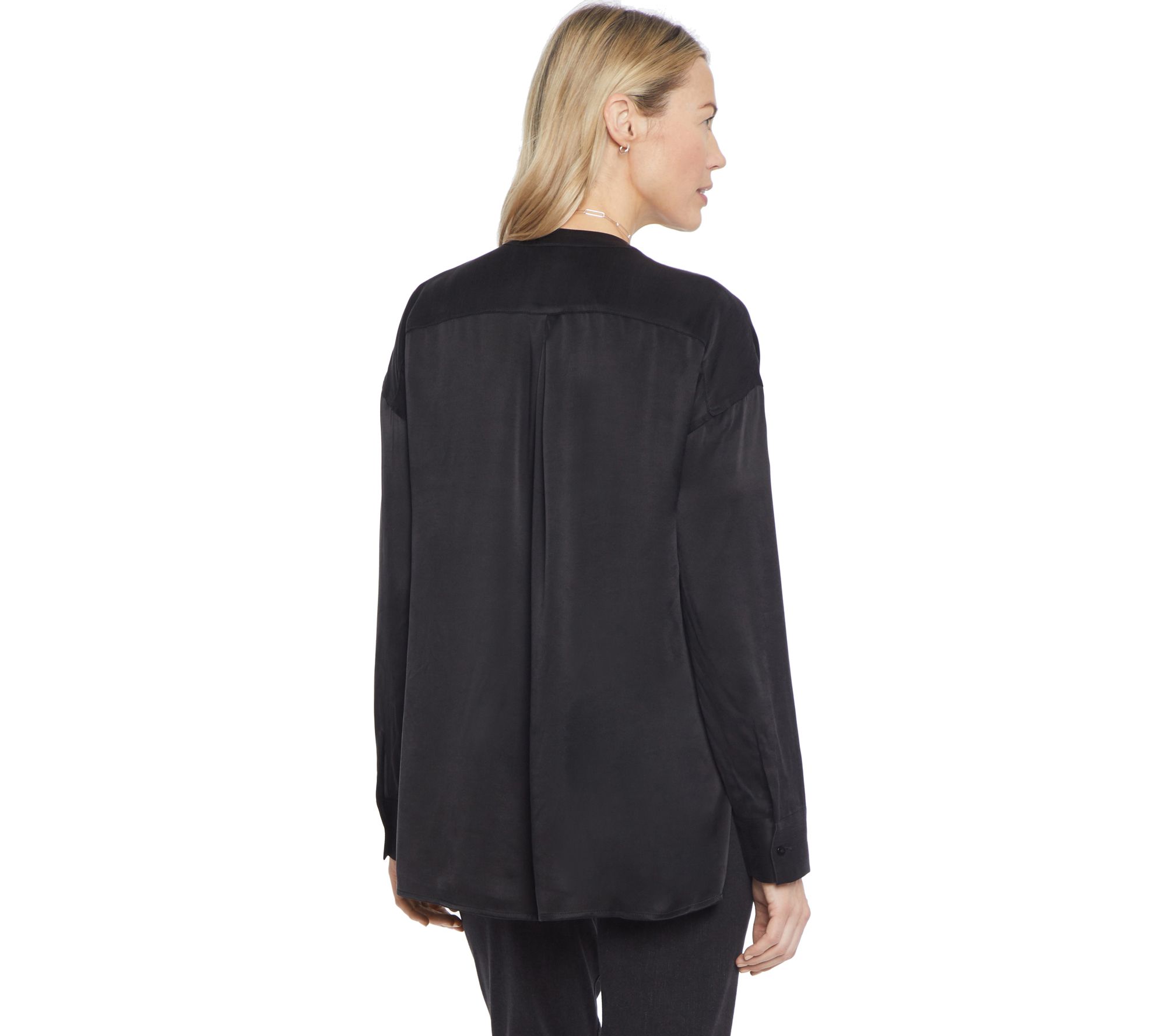 • Features: lightweight charmeuse, high-low hem, split Henley-inspired neckline, front patch pockets, long sleeves, button cuffs, side slits