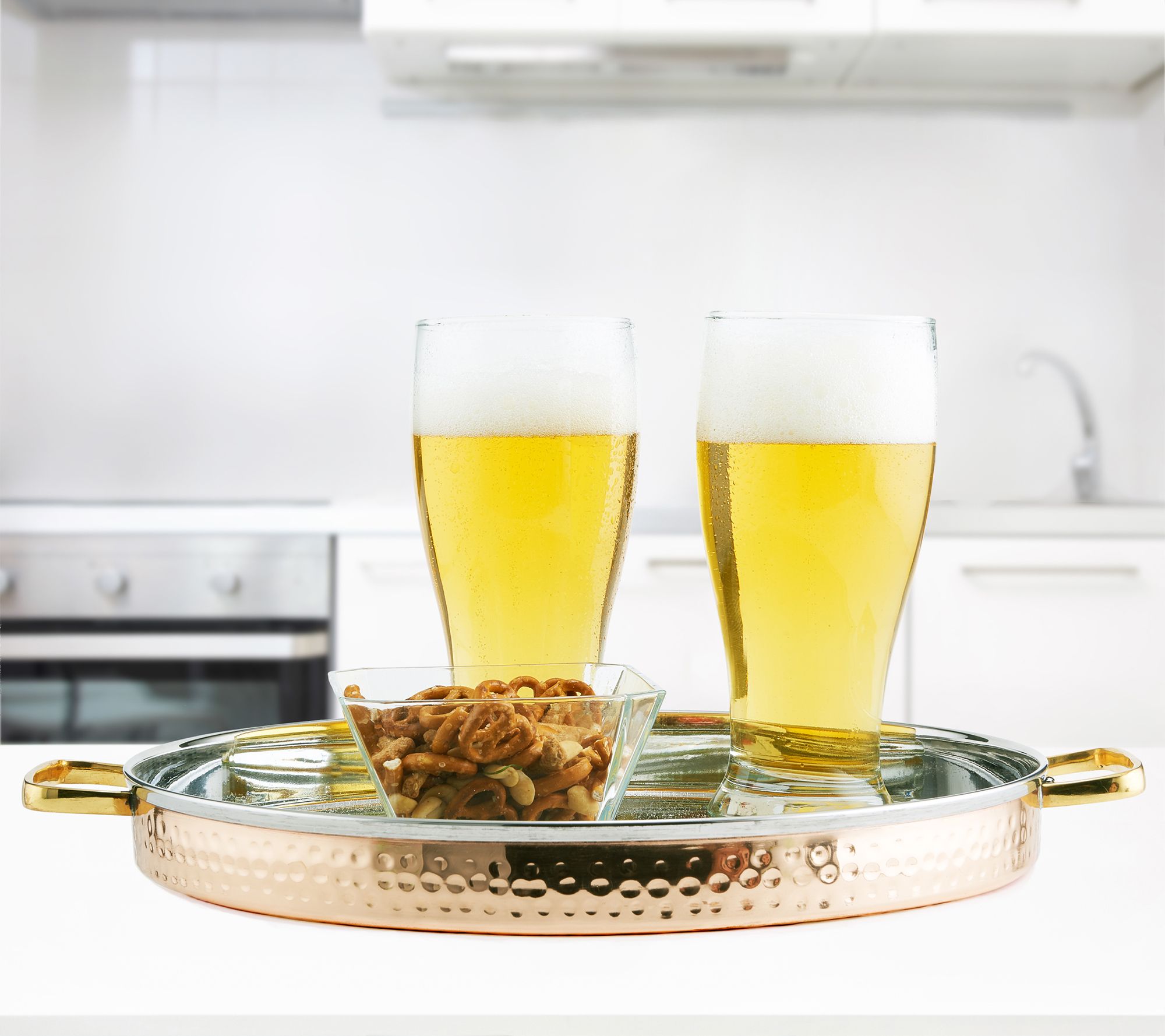 Service with style? That's a yes and yes when you add this hammered copper and stainless steel round tray to your serving collection. From Old Dutch International.
