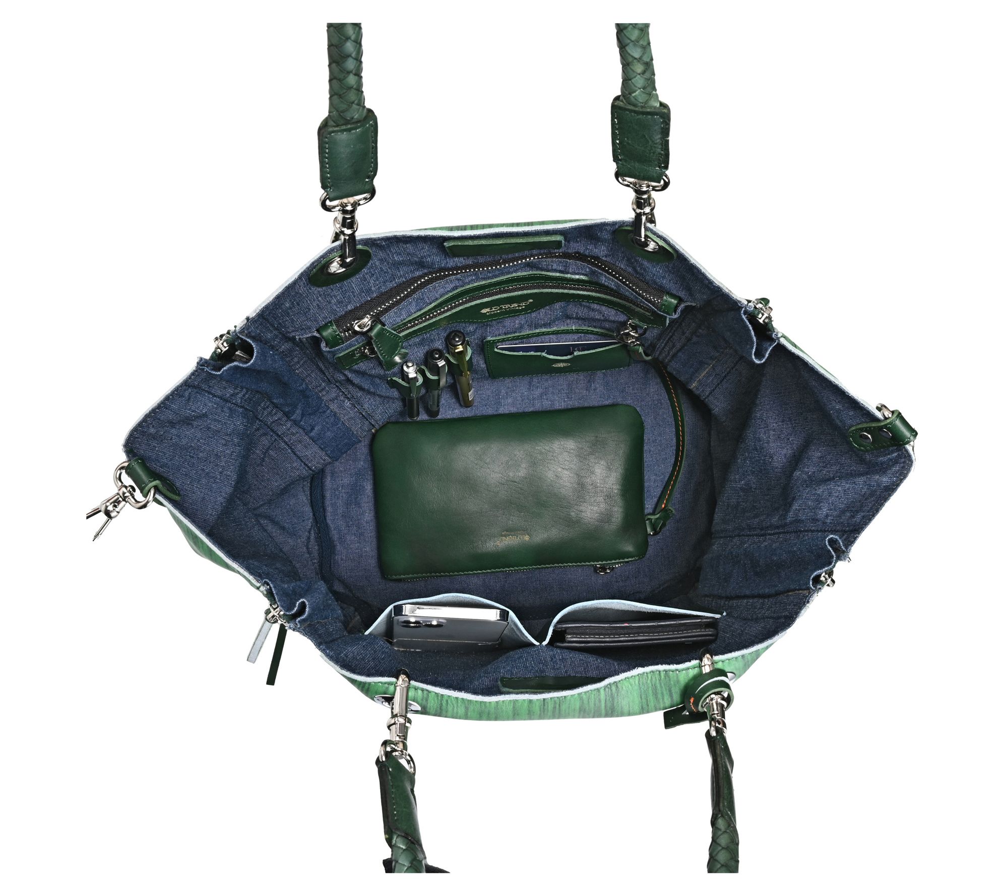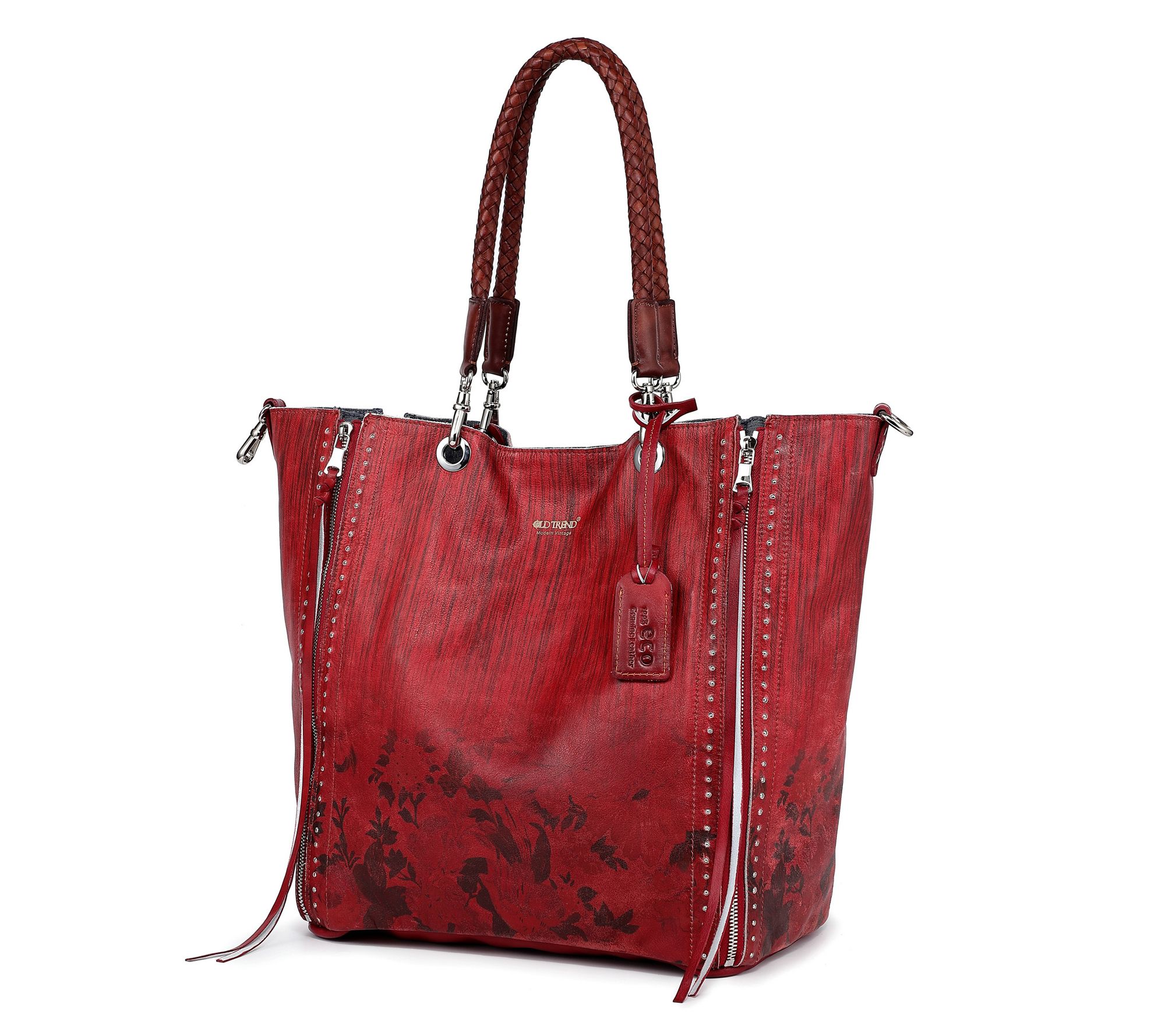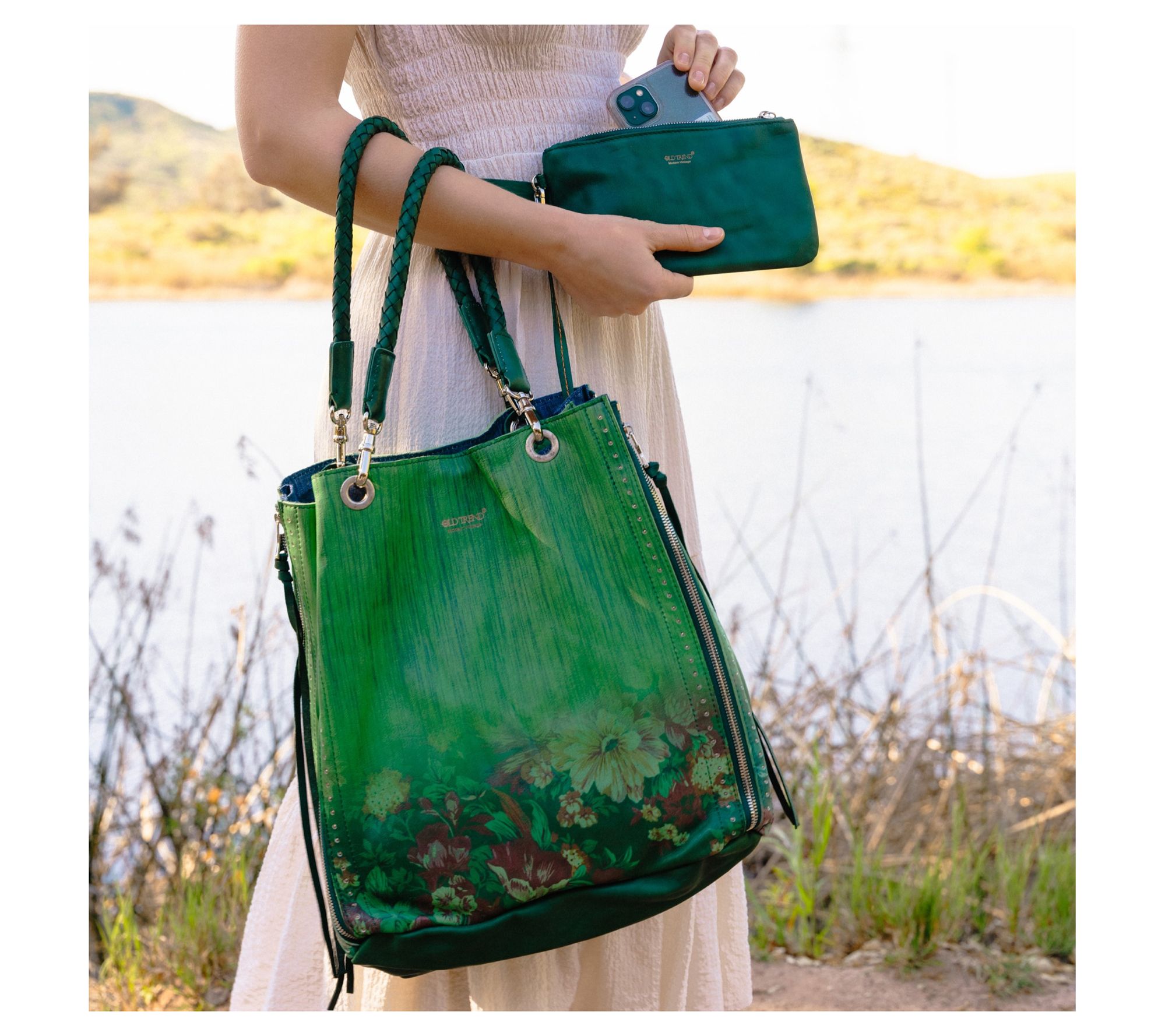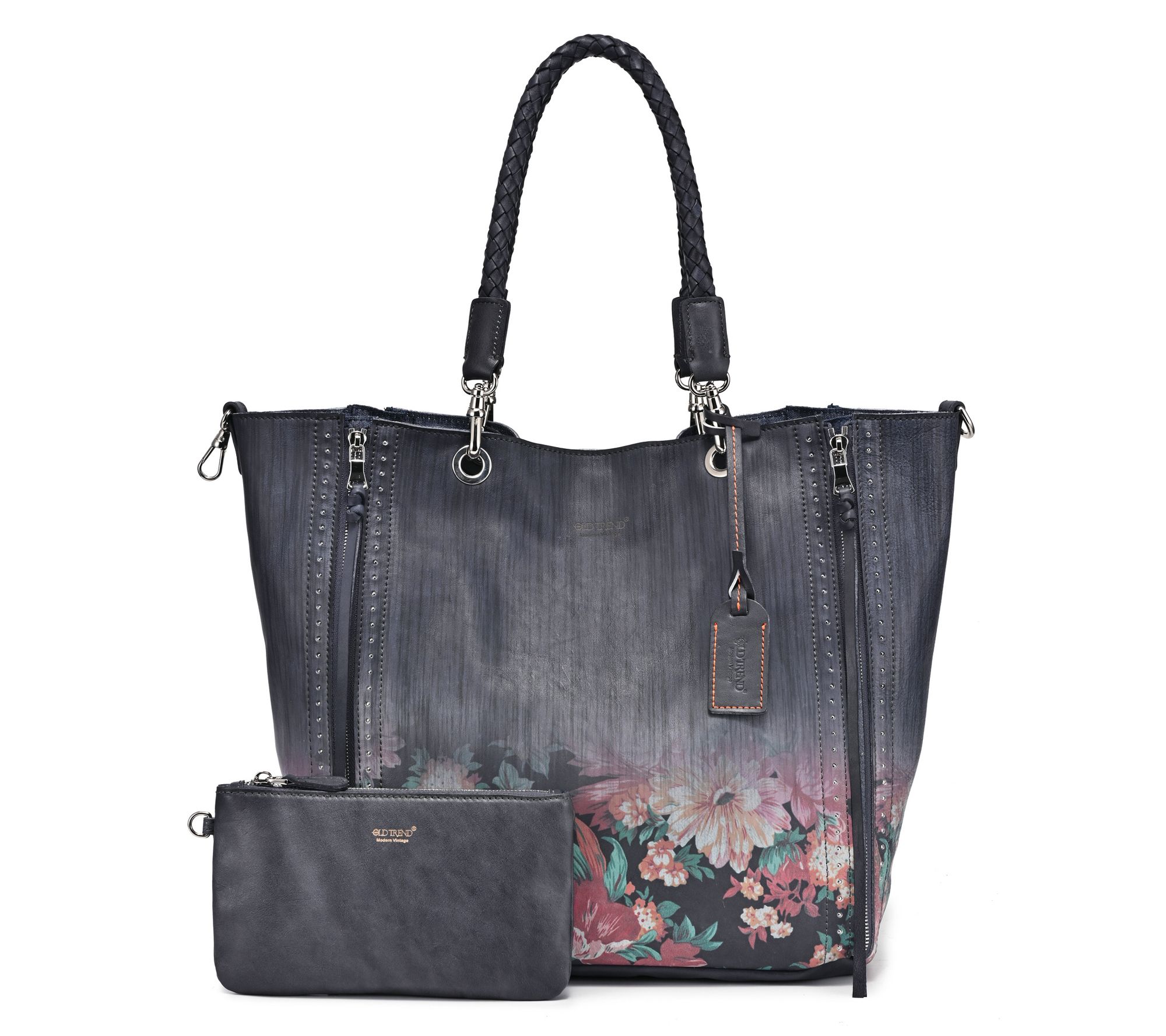 Interior cotton lining, embossed Old Trend logo, two zipper pockets, two slip pockets, one card holder, three pen or pencil slots, multi-purpose key-clasp, detachable pouch