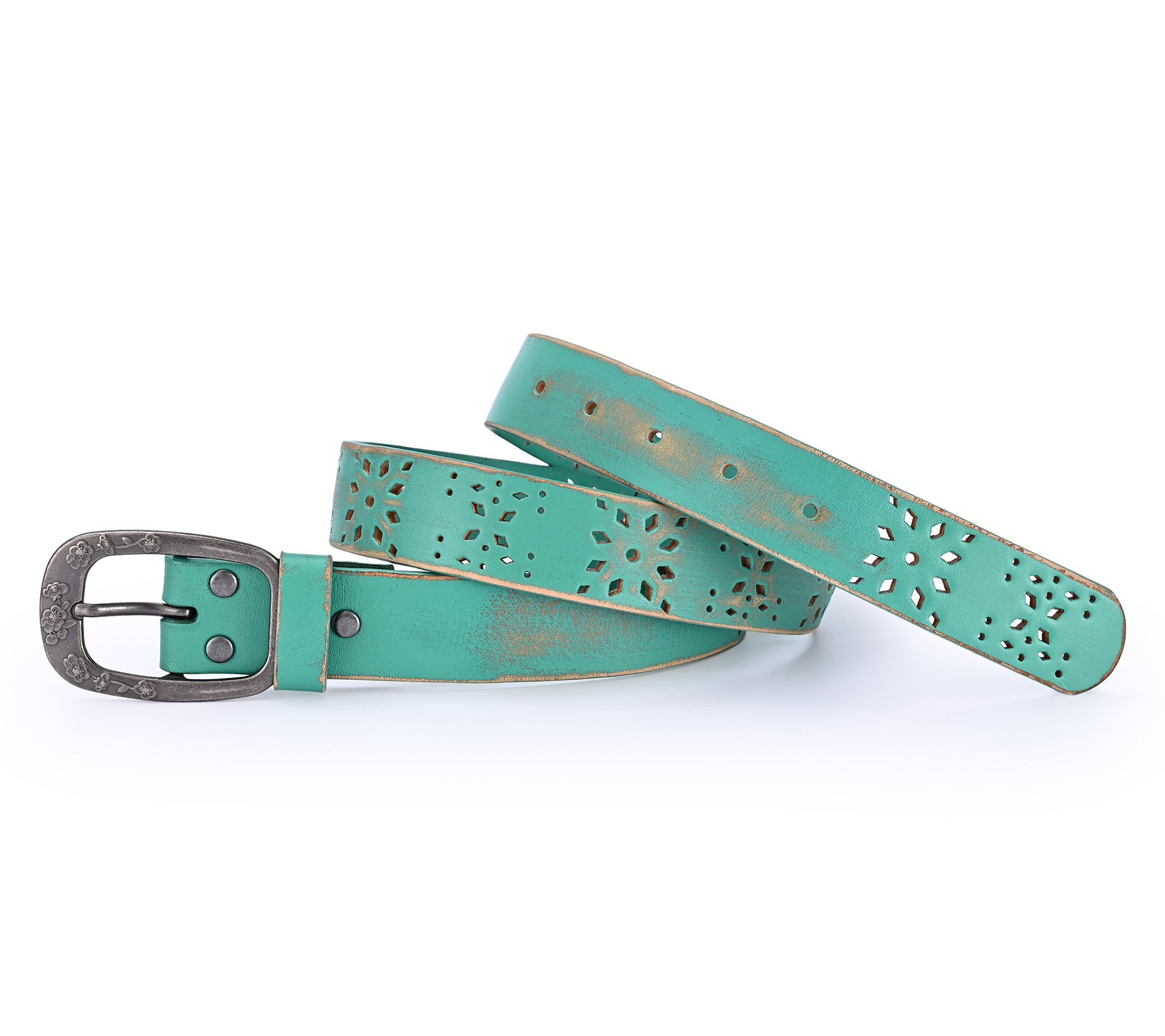 Transform your everyday look with the Blooming Crocus leather belt. The intricate perforated floral design brings a rustic charm to your favorite outfits. Whether you're brunching with friends or wrapping up a busy workday, this belt adds a serene elegance that transitions effortlessly. From Old Trend.