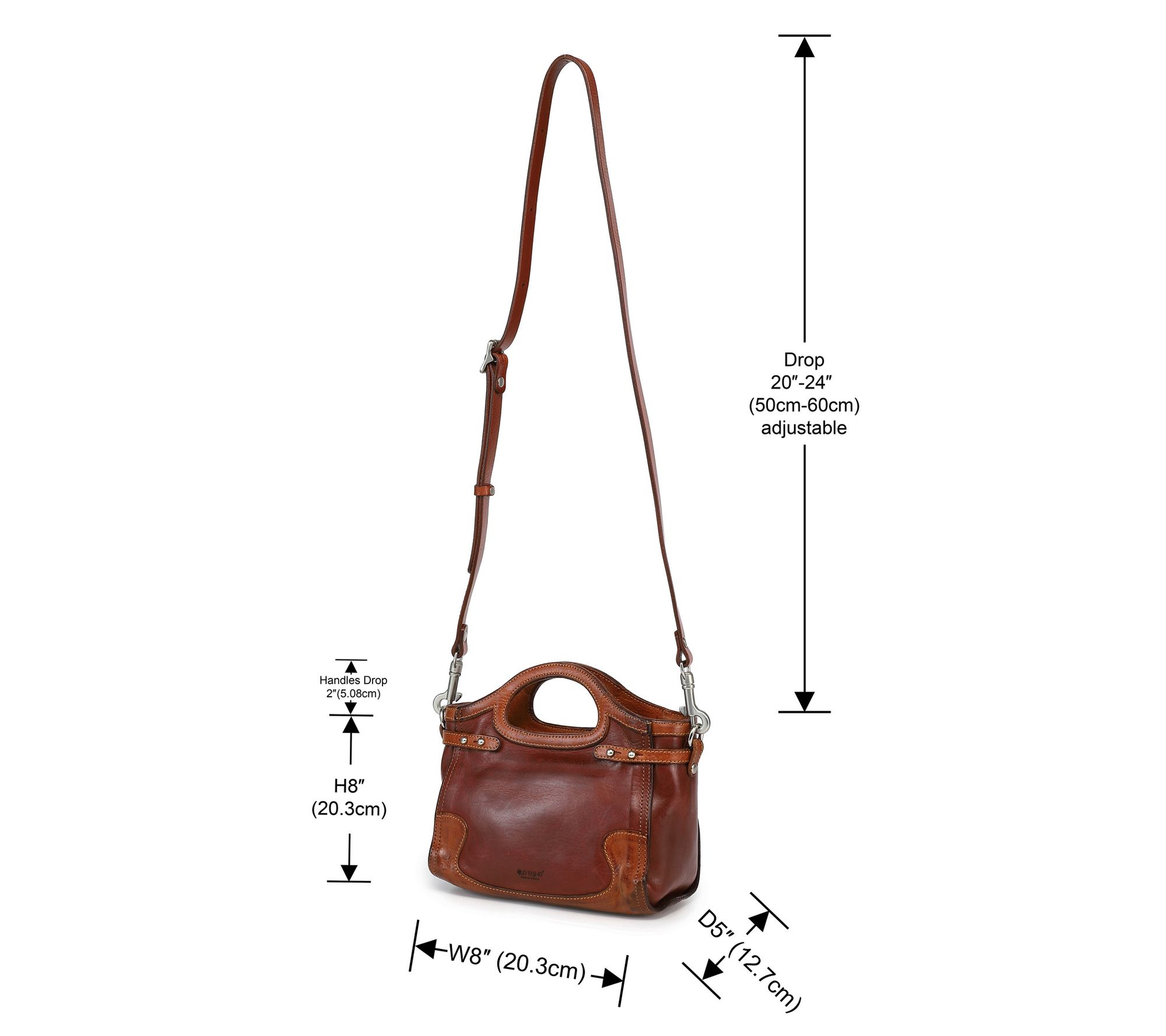 Measures approximately 8"W x 8"H x 5"D with a 3" handle drop and a 22" strap drop; weighs 1.2 lbs