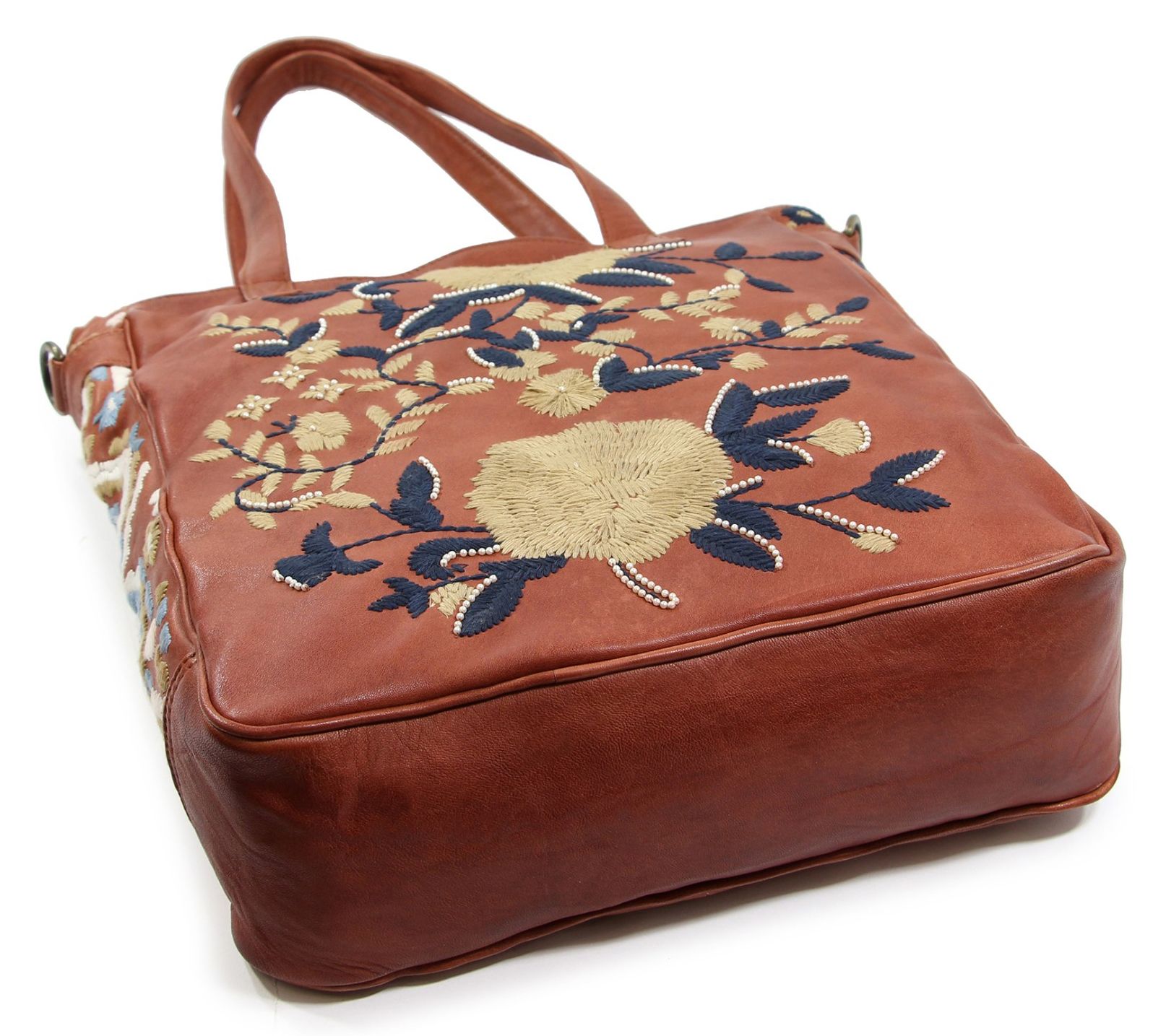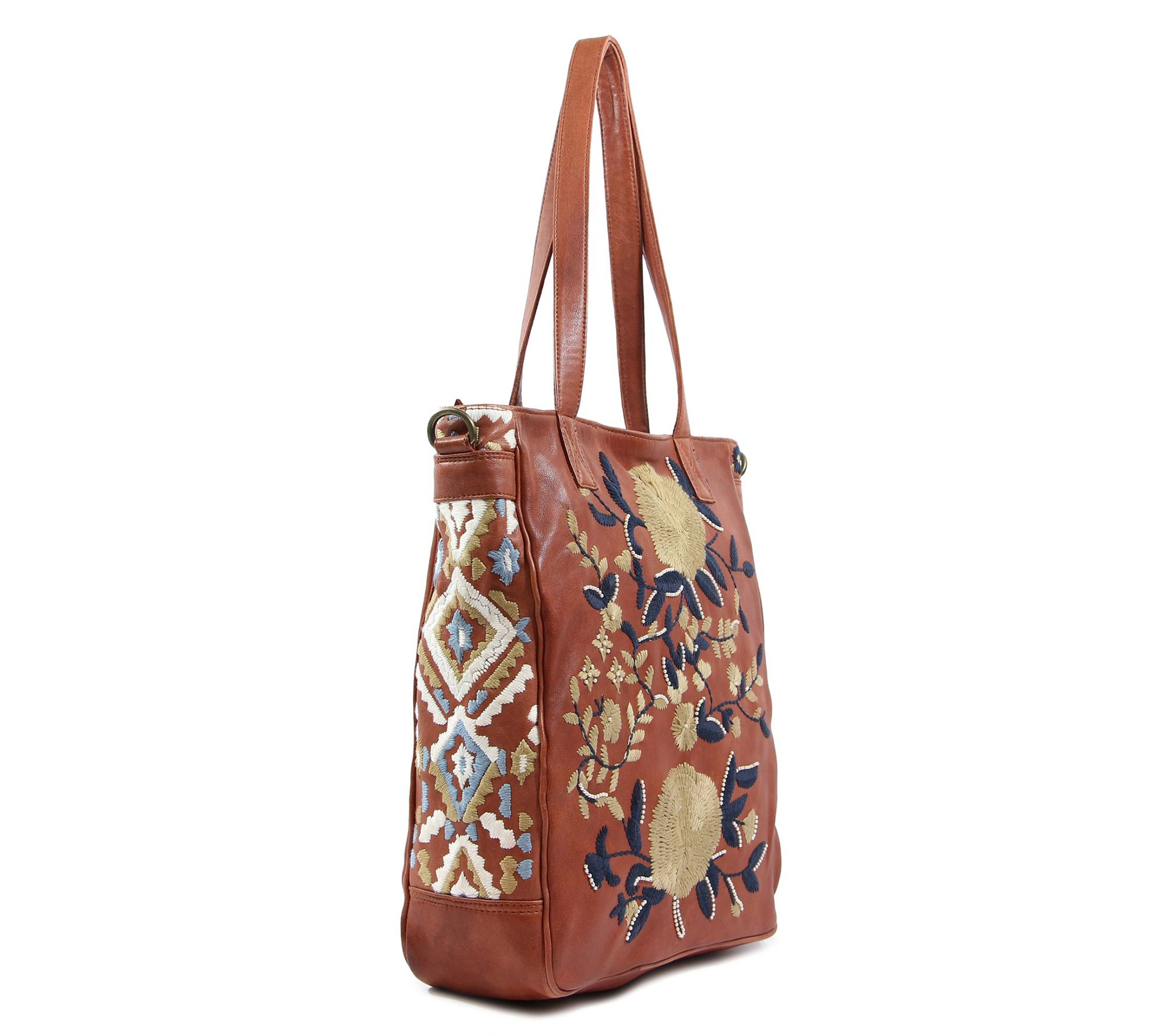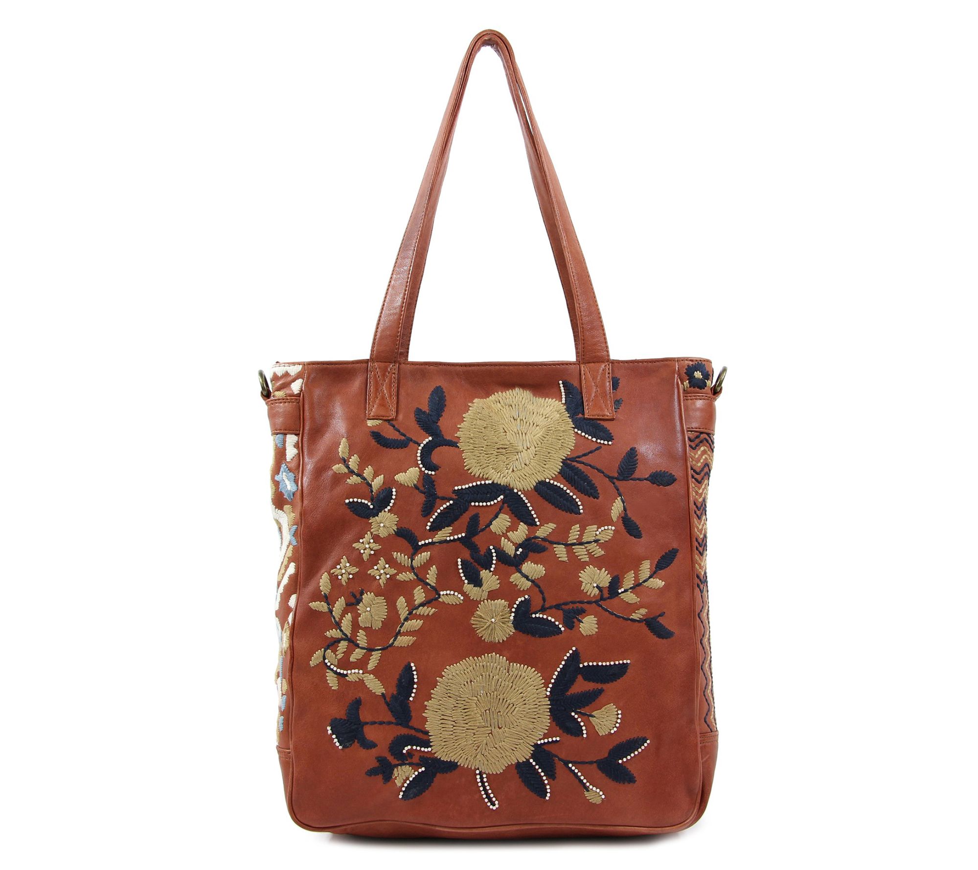 Embrace a touch of artistry in your everyday with the Flora Soul embroidered leather tote, designed to carry your essentials in style whether you're heading to brunch or planning a weekend shopping trip. Beautiful embroidery lends a whimsical look, while soft leather and spacious interior offer practicality for busy days on the go. From Old Trend.
