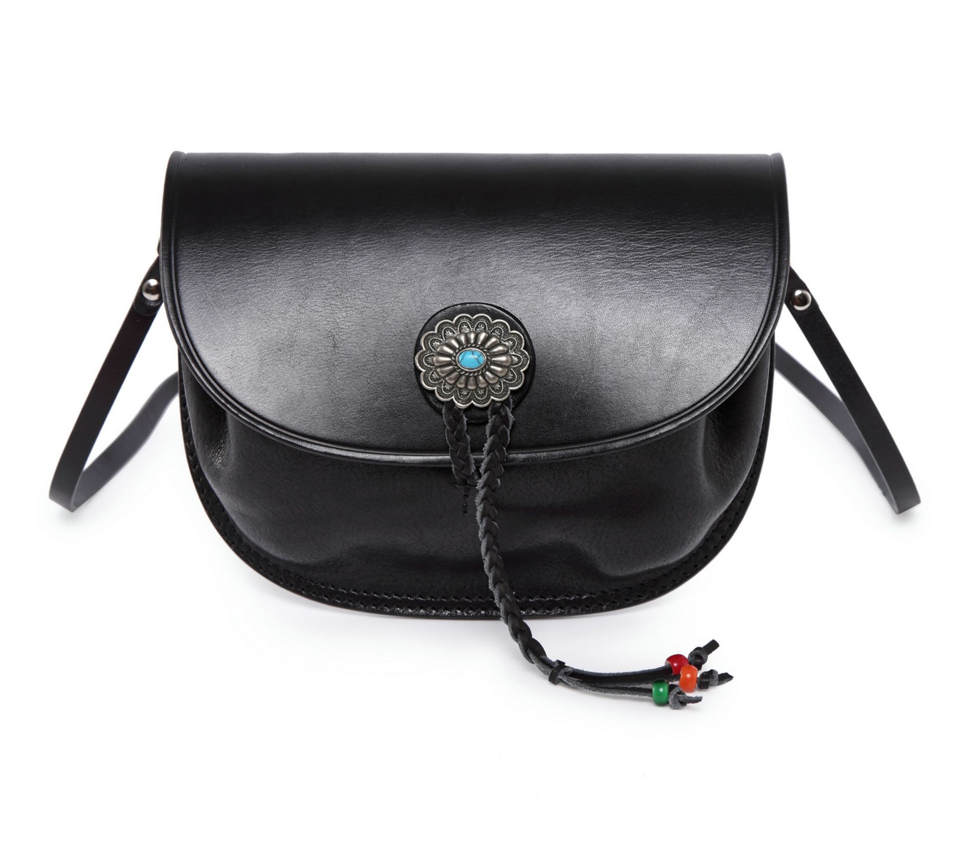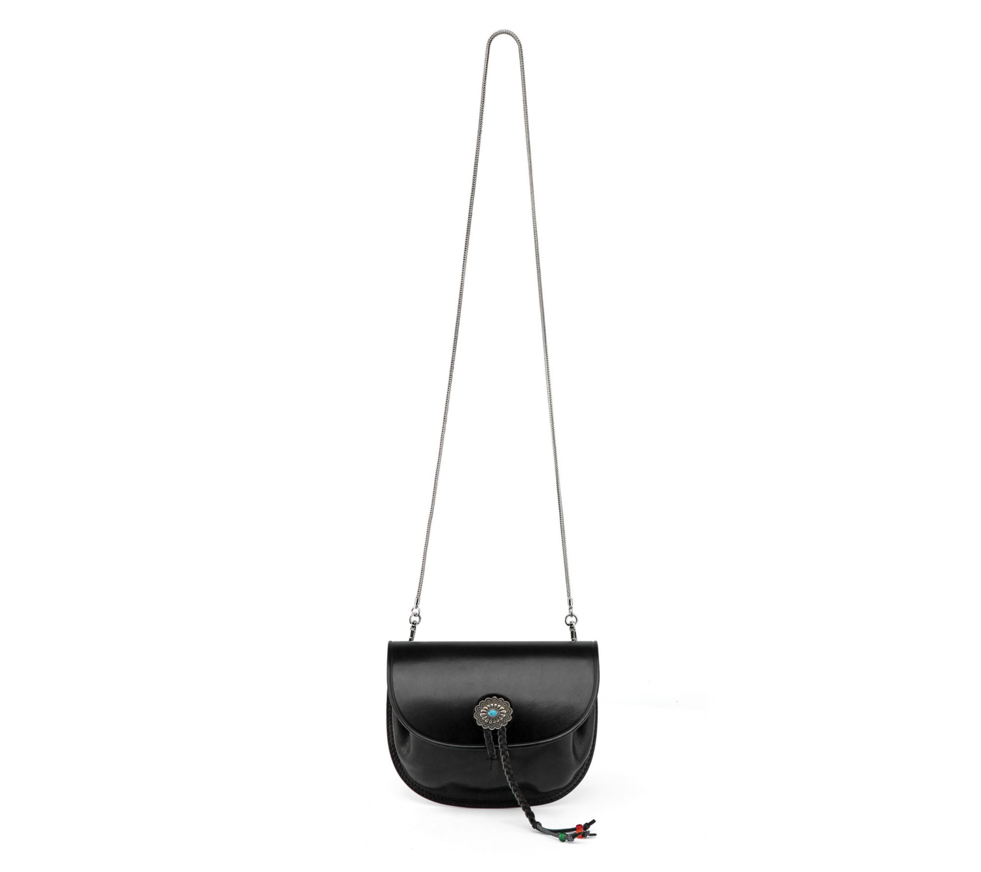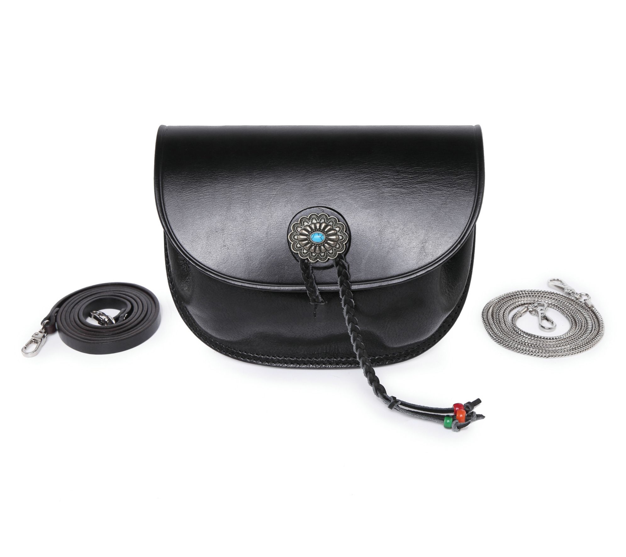 • Toggle clasp closure; silvertone hardware; detachable and convertible straps; decorative emblem and braided tassel
