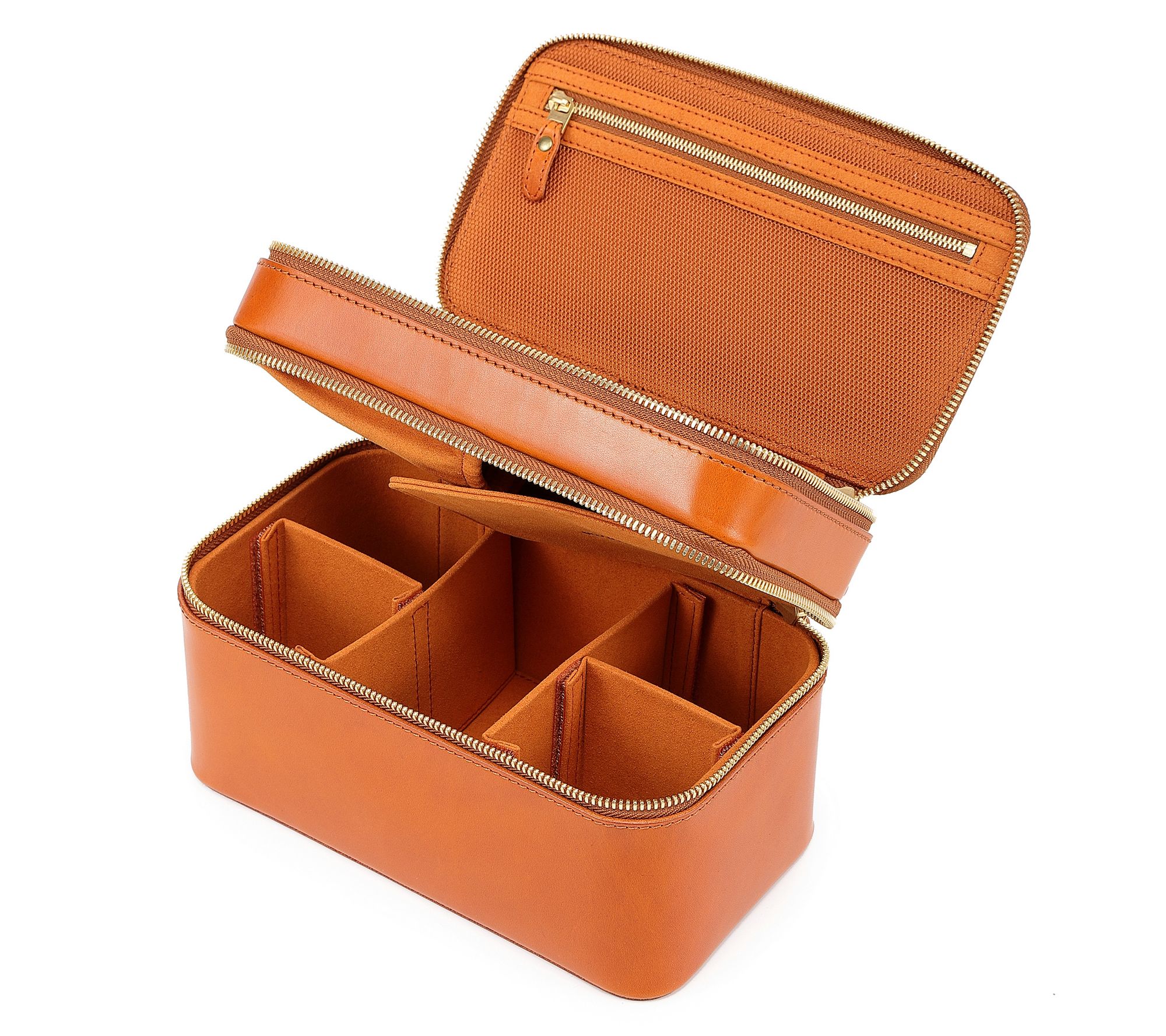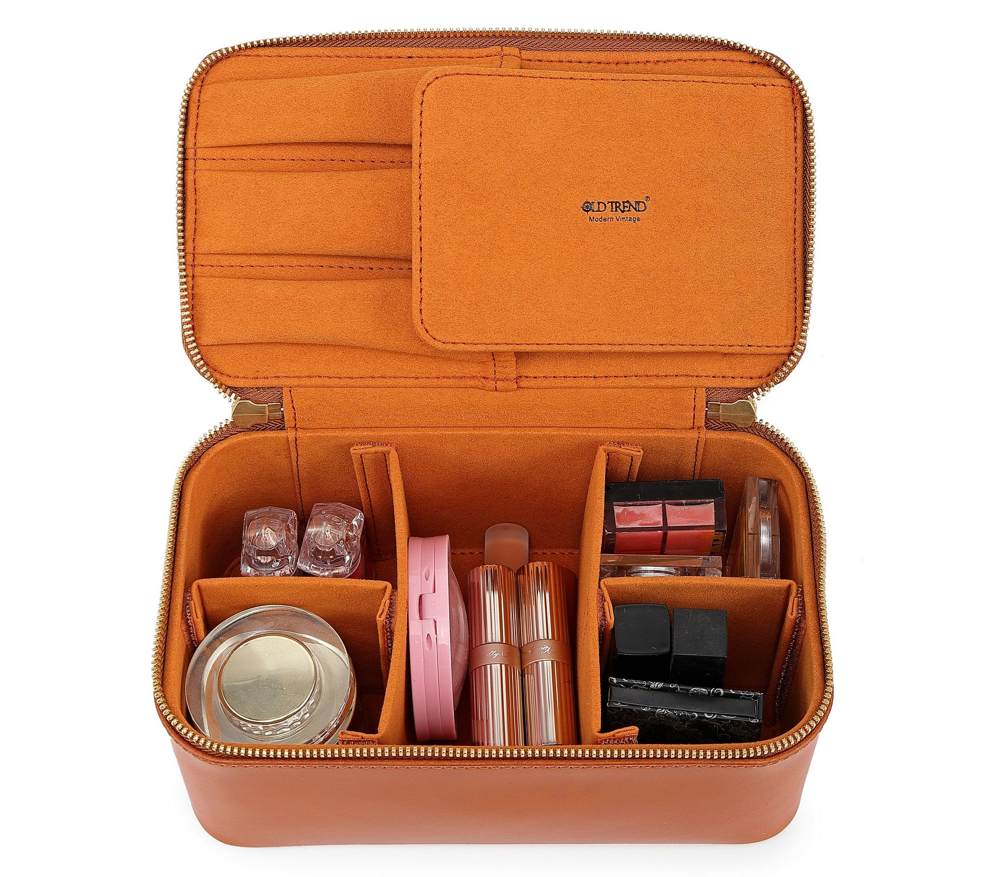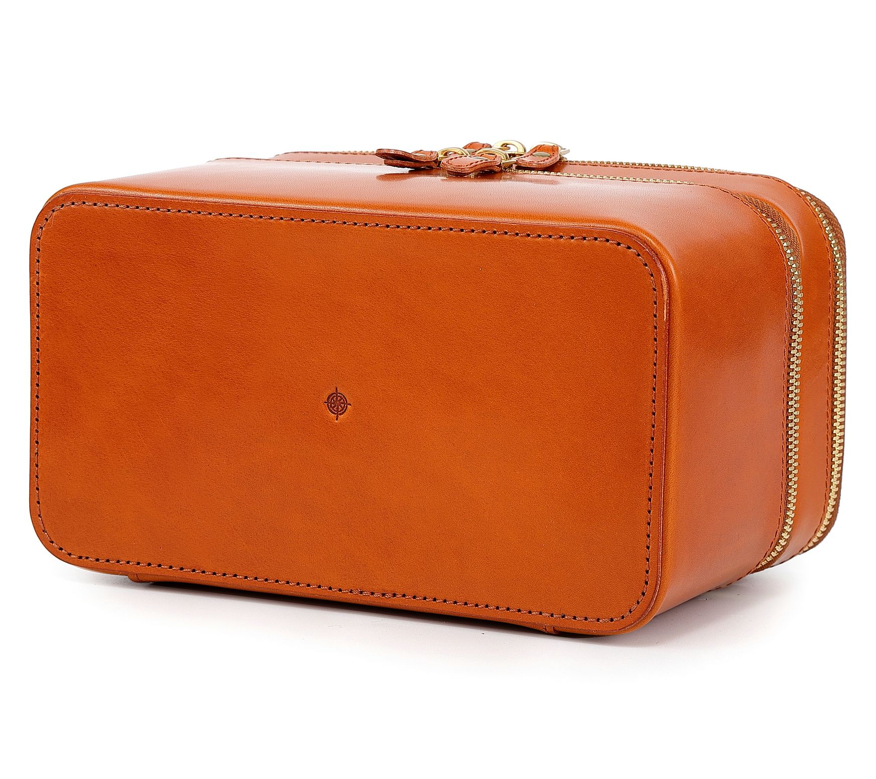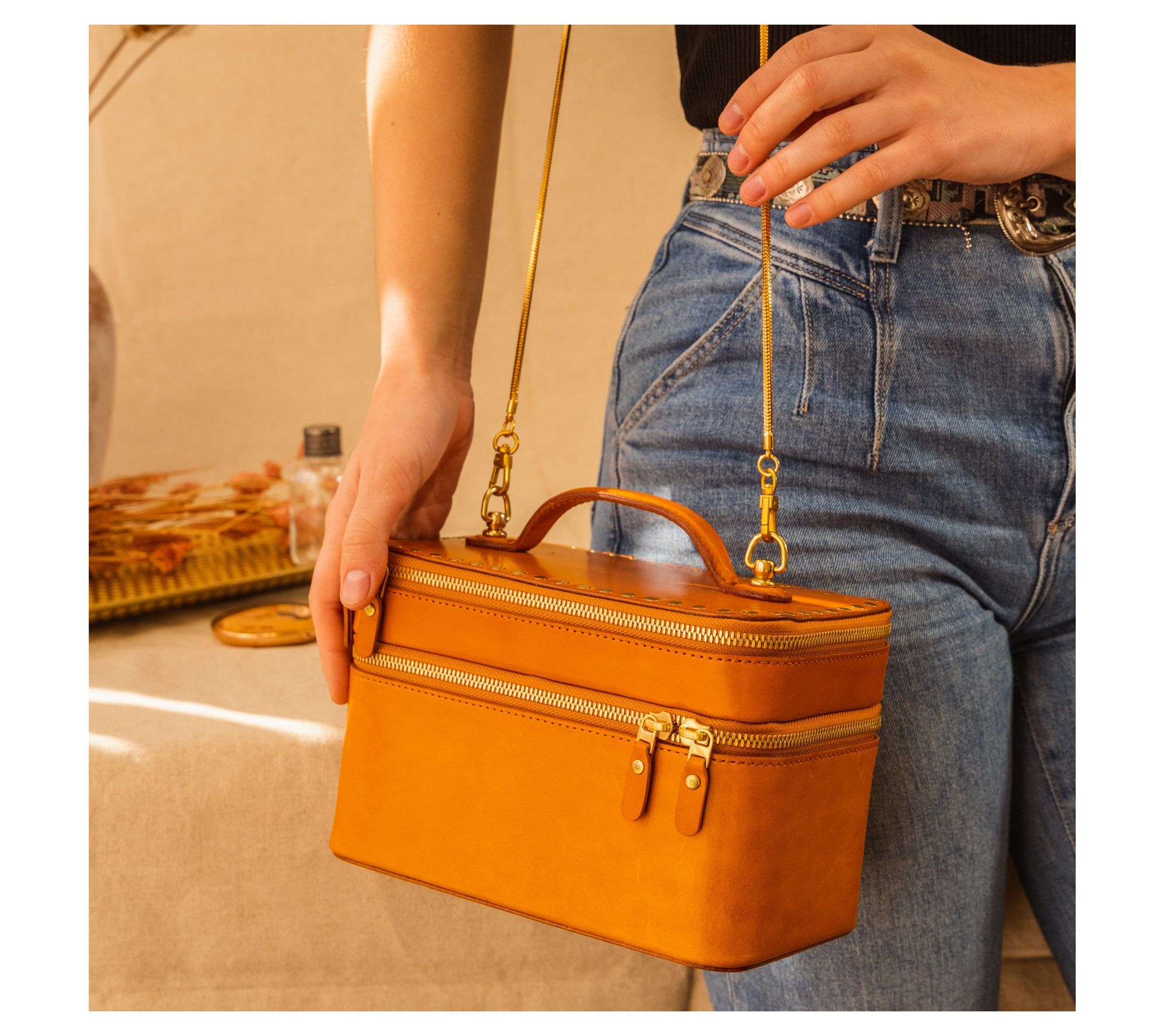Say hello to the Ixia train case from Old Trend, where jet-set luxury meets travel efficiency. This chic vanity trunk, crafted from smooth dyed leather with brass accents, combines elegance and durability in one stylish package. With a secure zip-around closure, removable shoulder chain, and loads of interior pockets and compartments, your beauty essentials stay perfectly organized wherever you roam. From Old Trend.