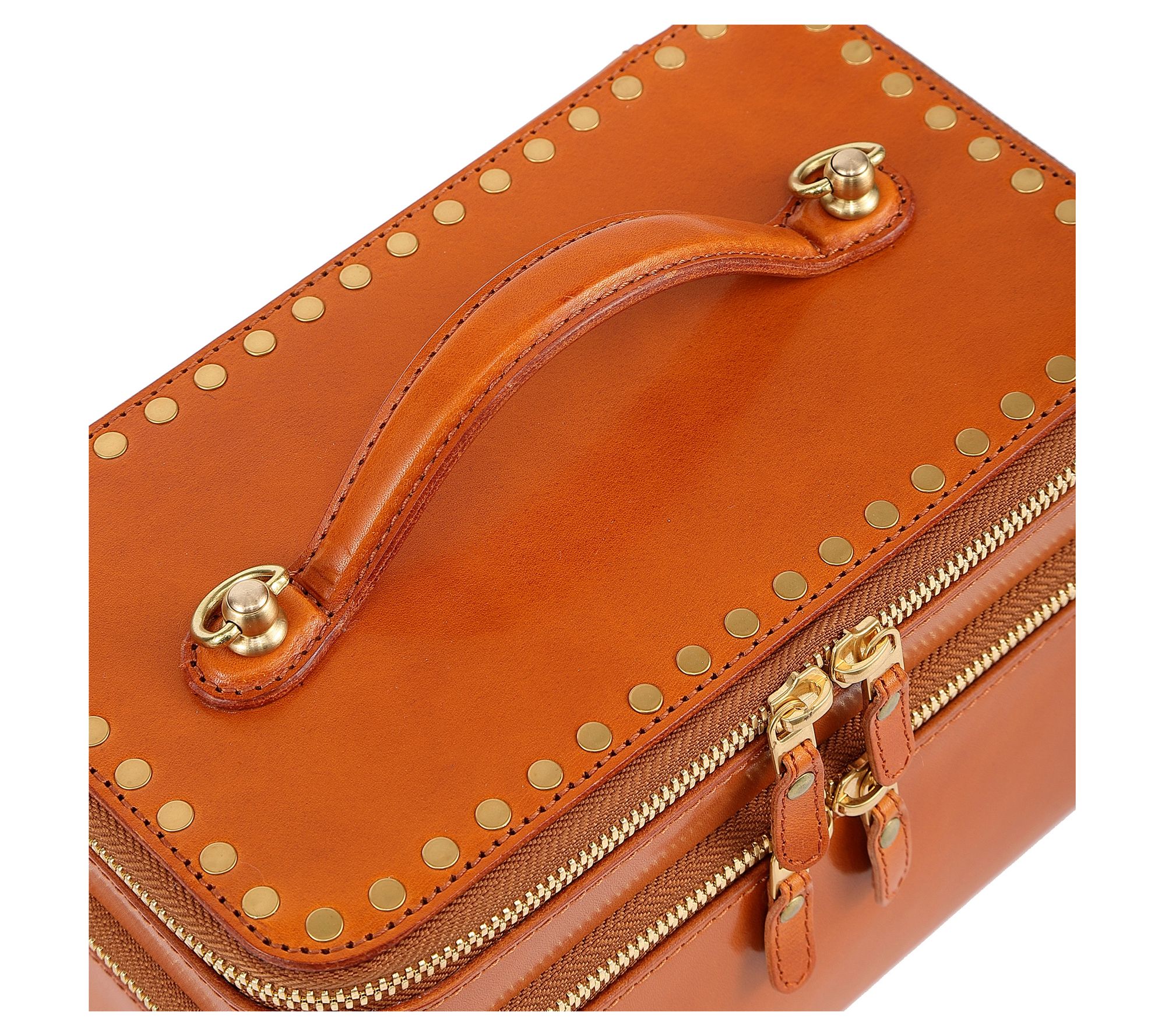 • Box silhouette, zip-around closure, brass studs and hardware, travel handle, goldtone chain strap