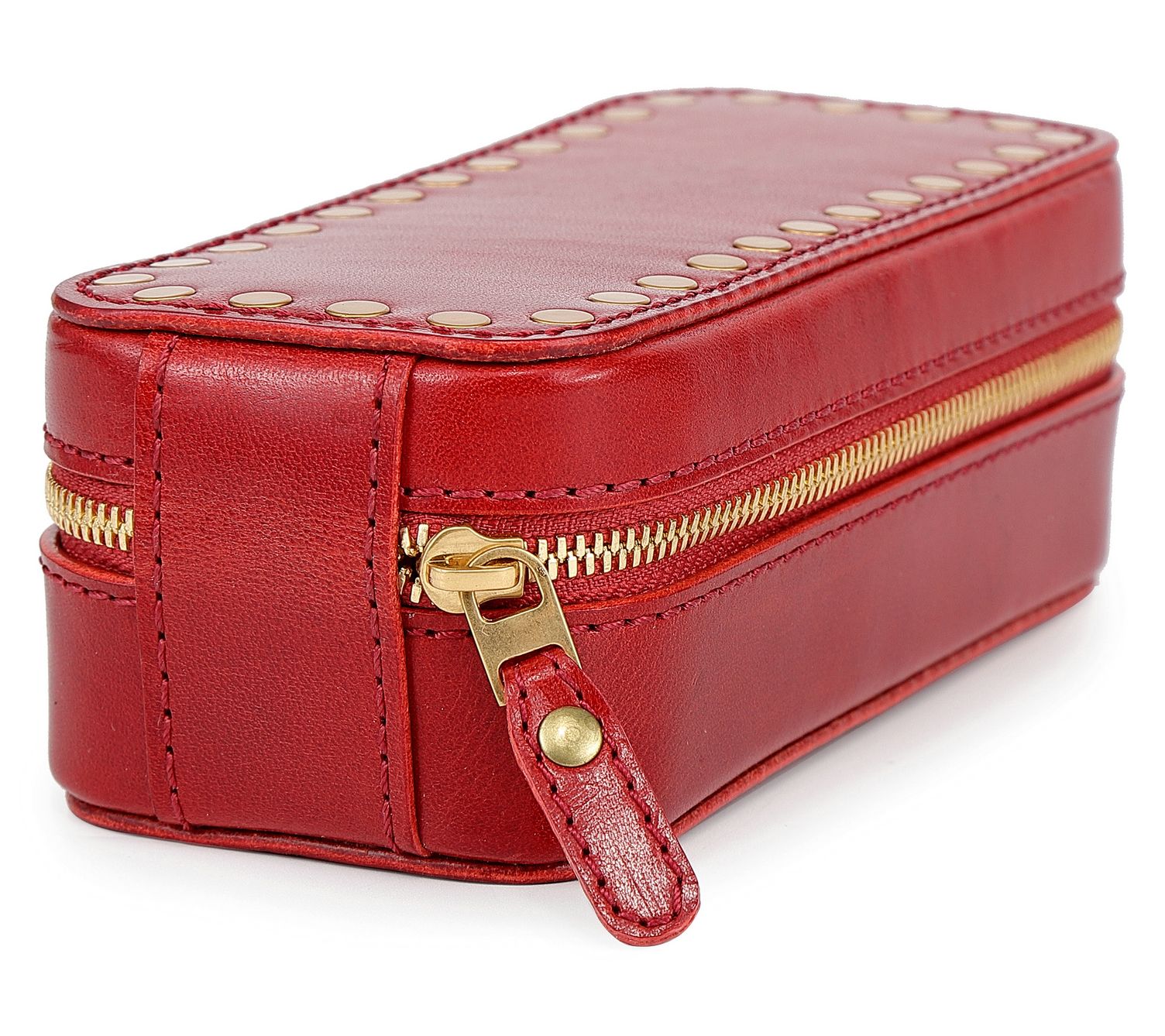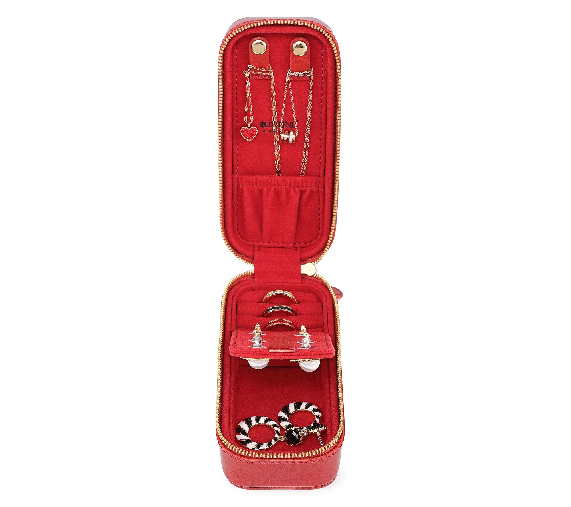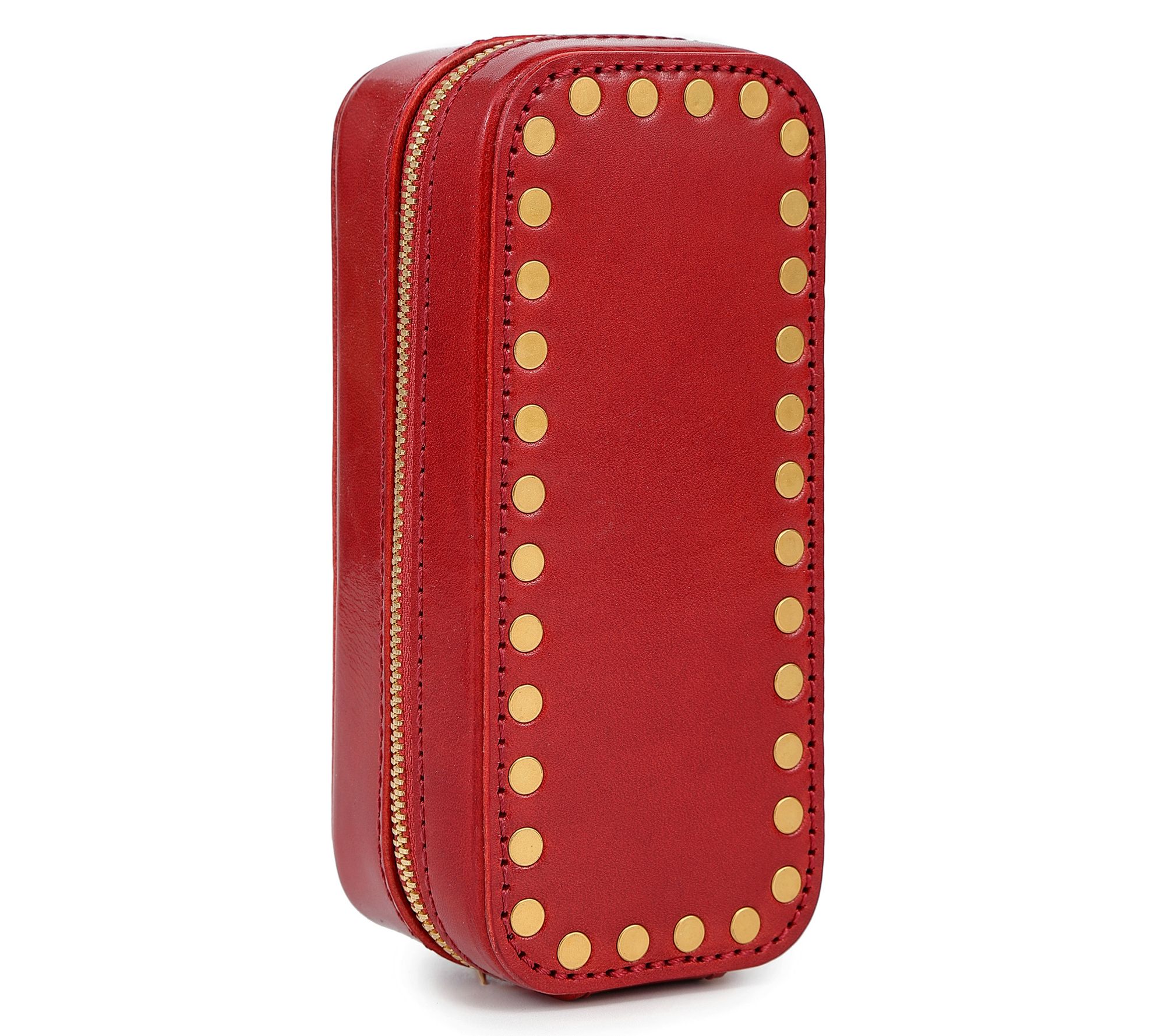 • Secure lid flap; interior earring holders; brass studded exterior; spacious compartment with modular customizable dividers; 15 earring holders; 2 necklace straps; 4 ring rolls; elastic pouch for bracelets, watches, or small pieces