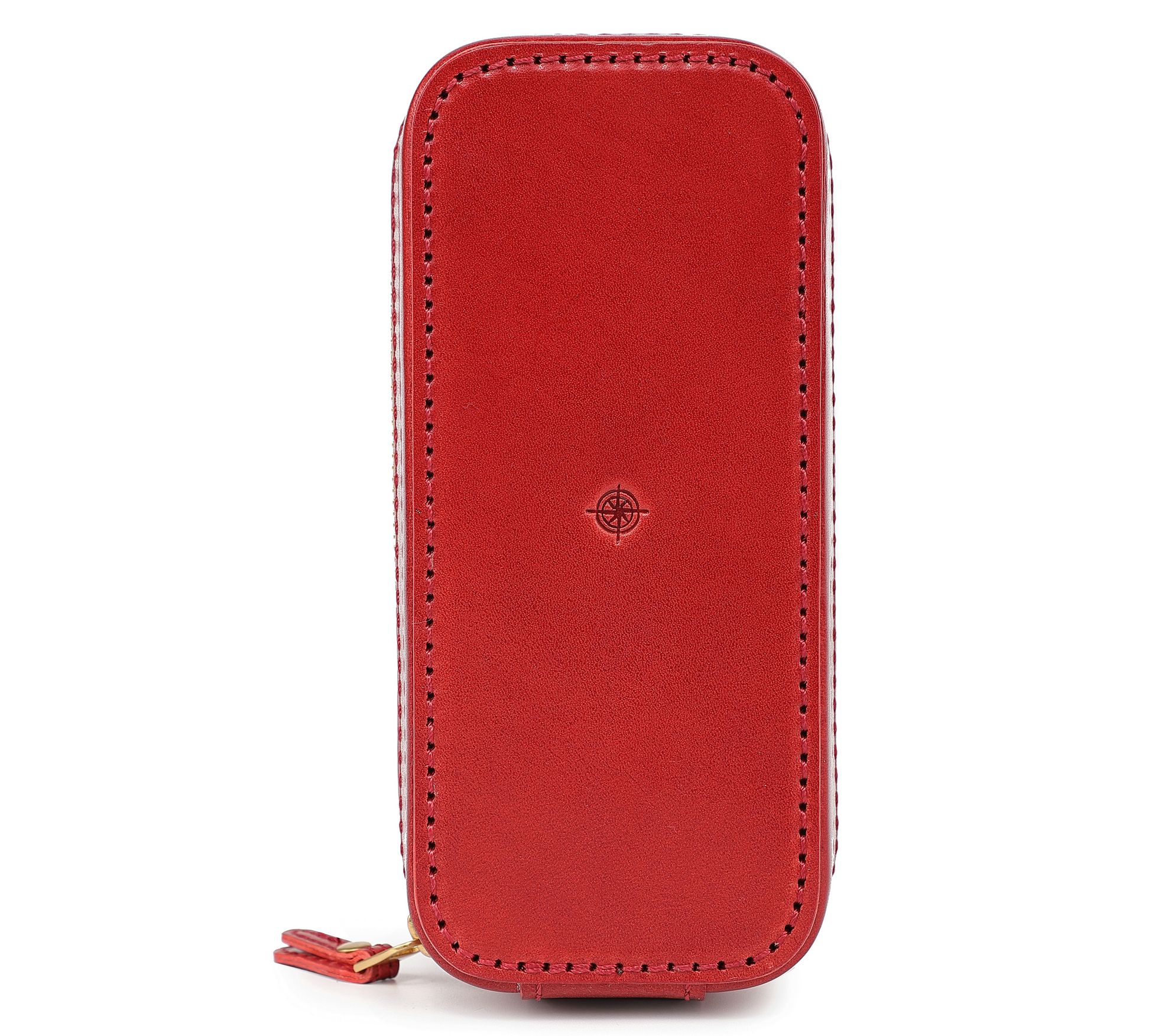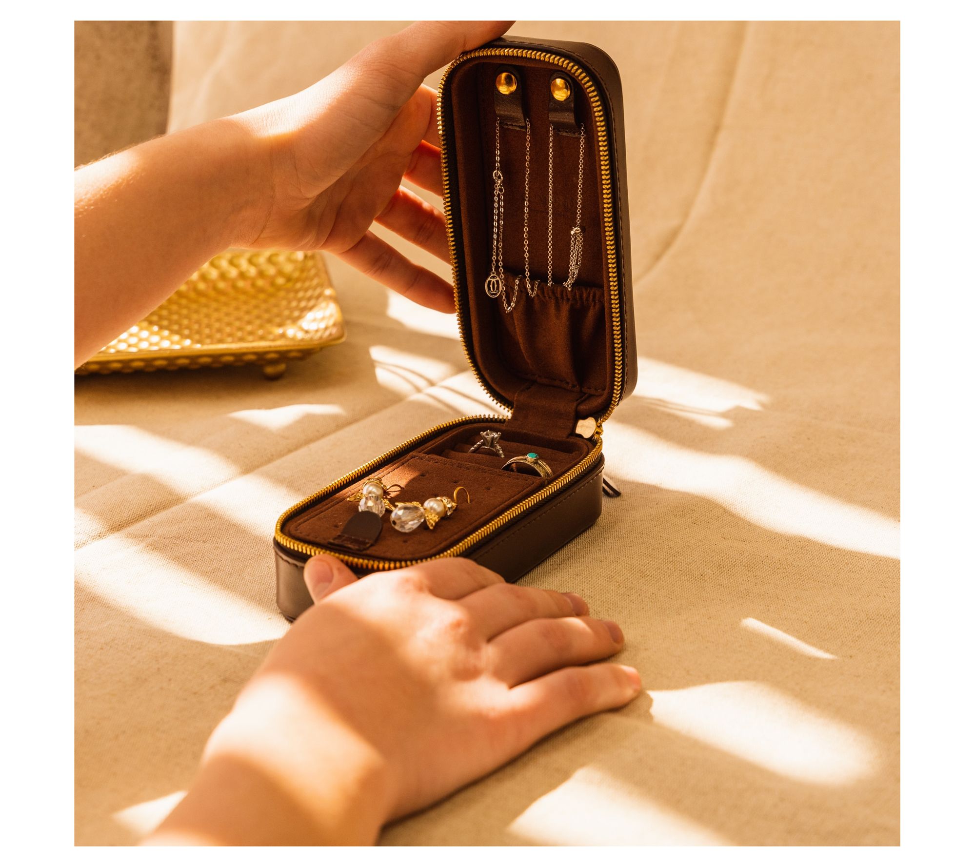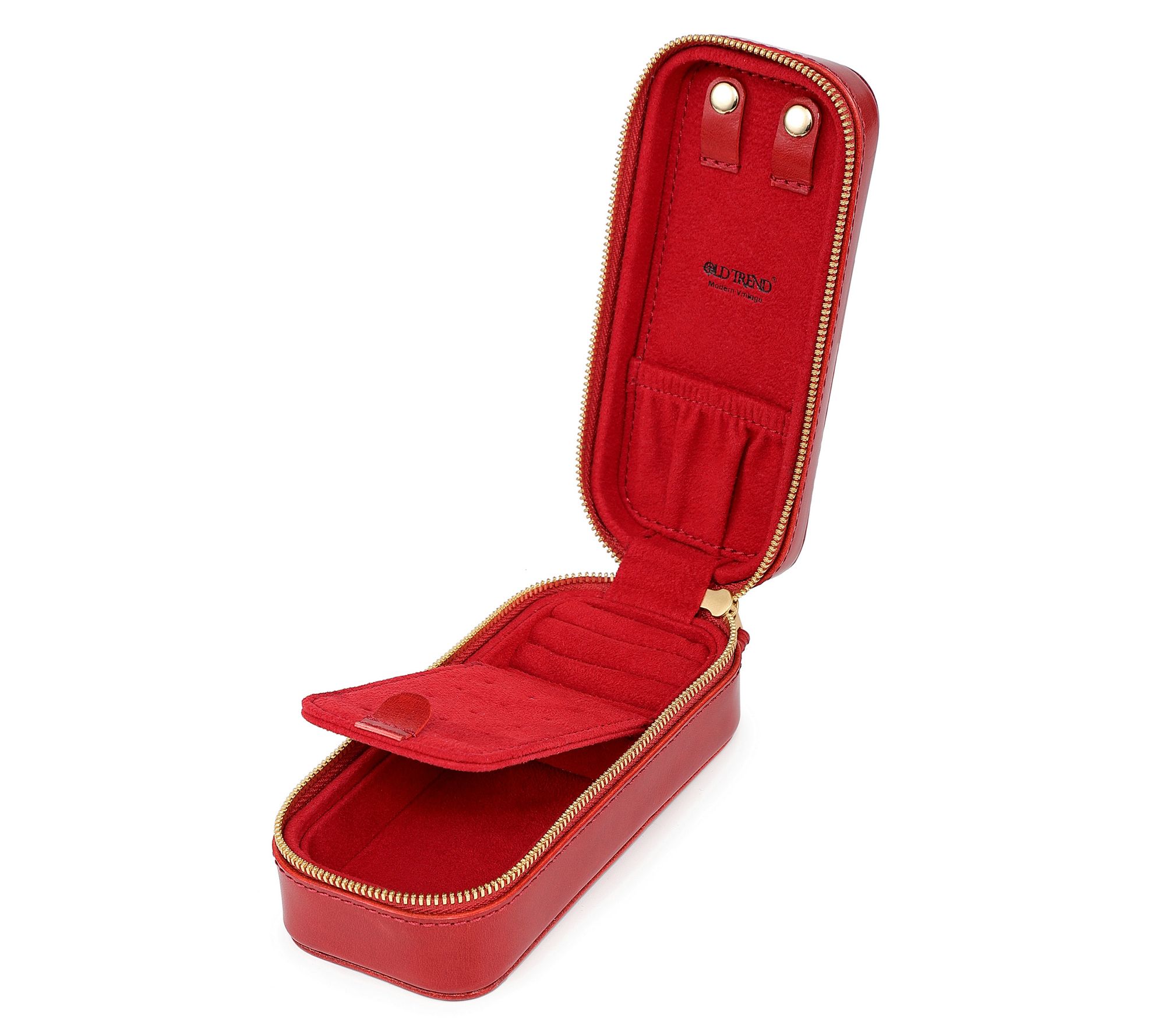 • Secure lid flap; interior earring holders; brass studded exterior; spacious compartment with modular customizable dividers; 15 earring holders; 2 necklace straps; 4 ring rolls; elastic pouch for bracelets, watches, or small pieces