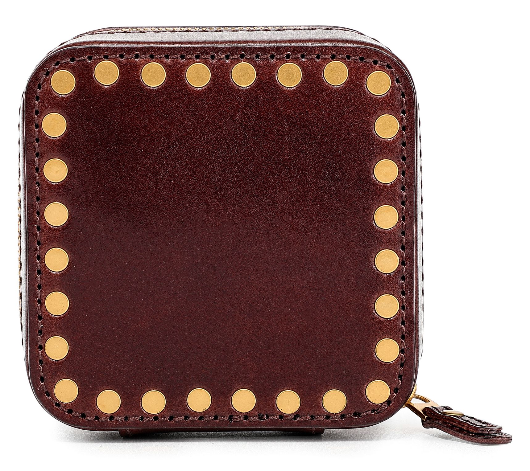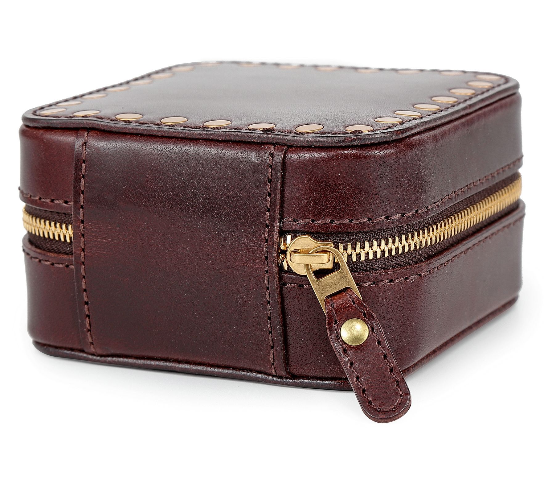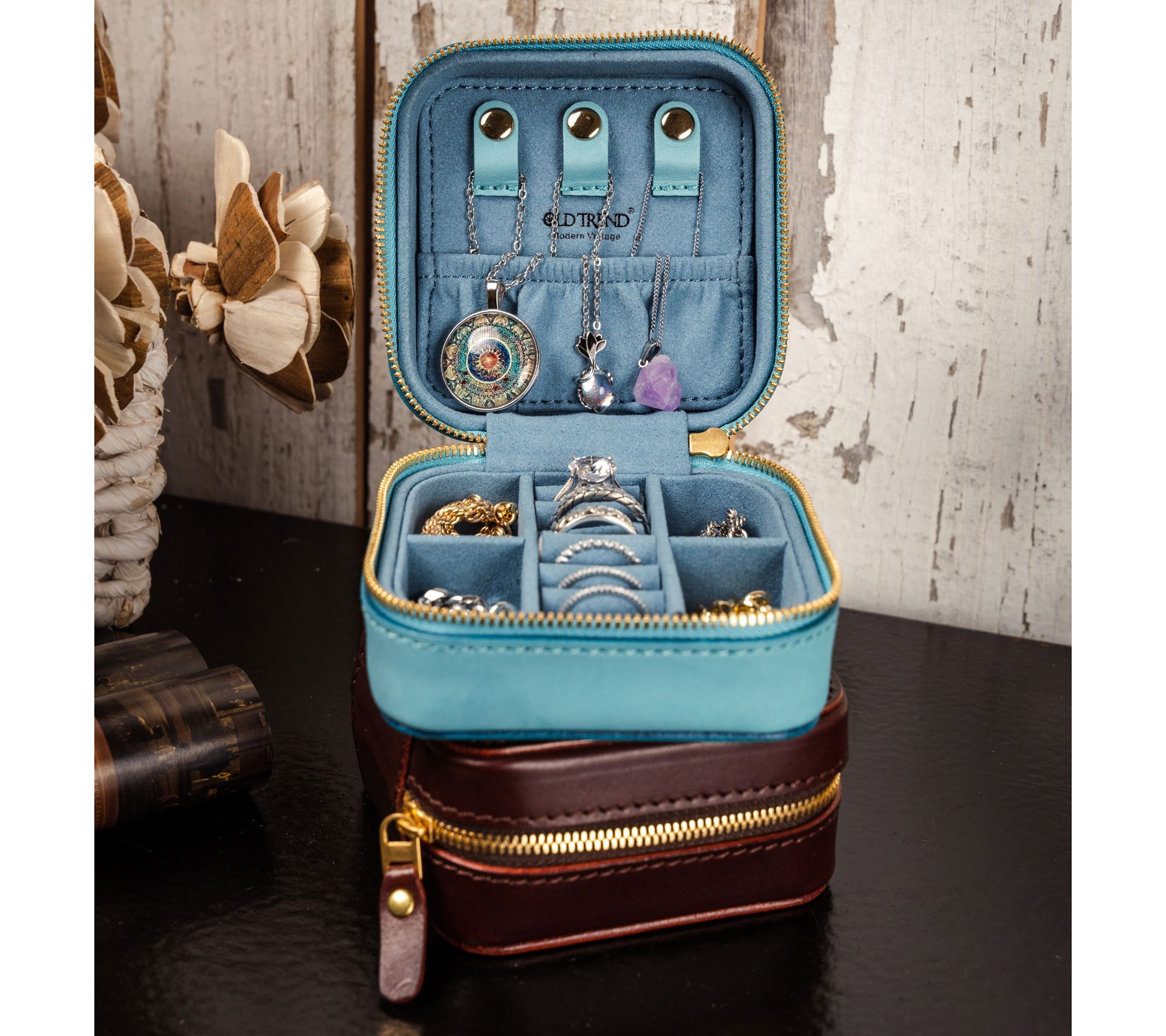 Whether at home or exploring new places, this leather square jewelry box keeps your cherished rings, earrings, and necklaces beautifully organized and secure. Thoughtfully designed with necklace straps, removable dividers, and a compact silhouette, it easily fits on your dresser or in your luggage for stylish storage anywhere. From Old Trend.
