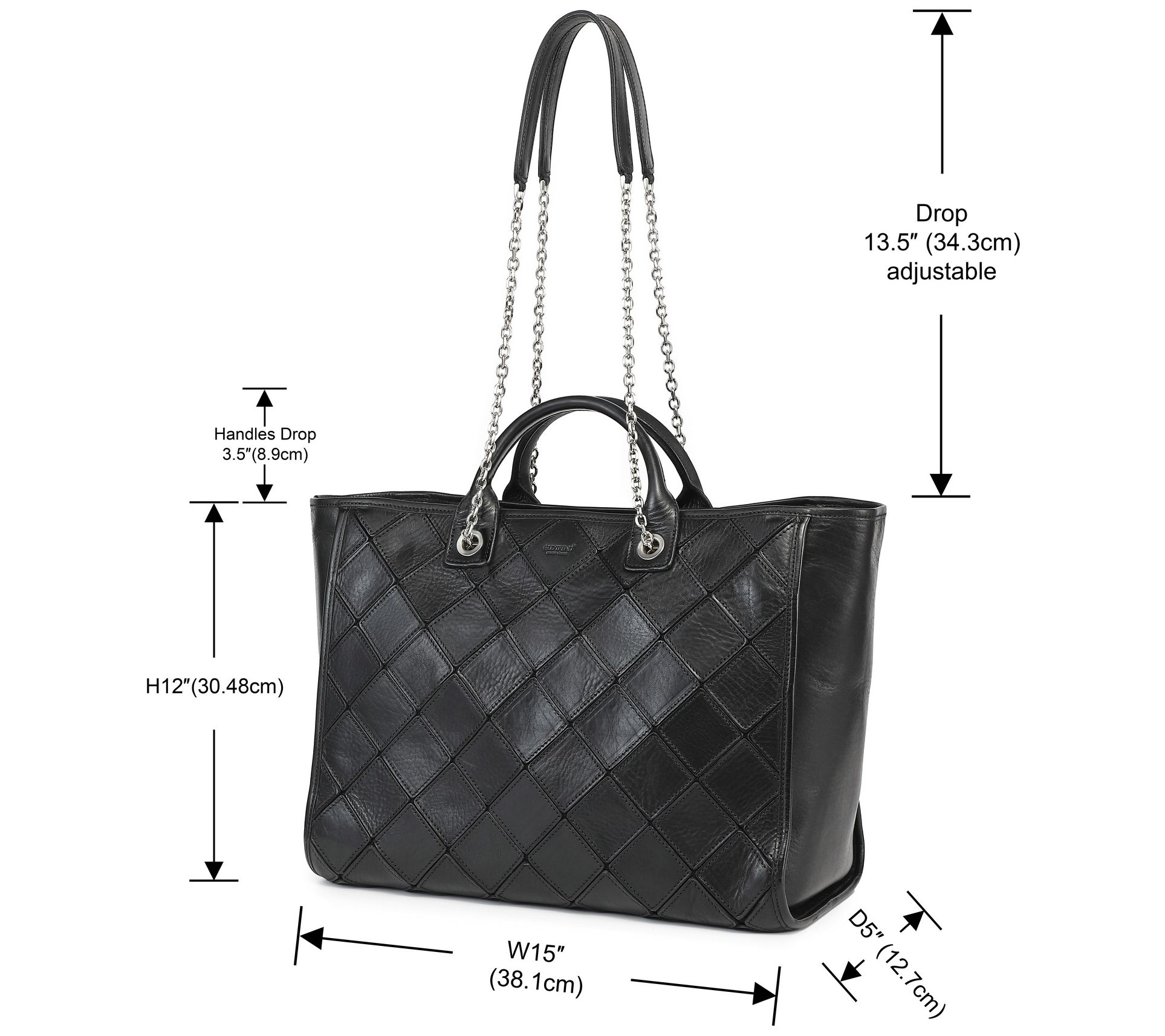Zip top closure; double handles; chain straps; silvertone hardware; protective bottom pad