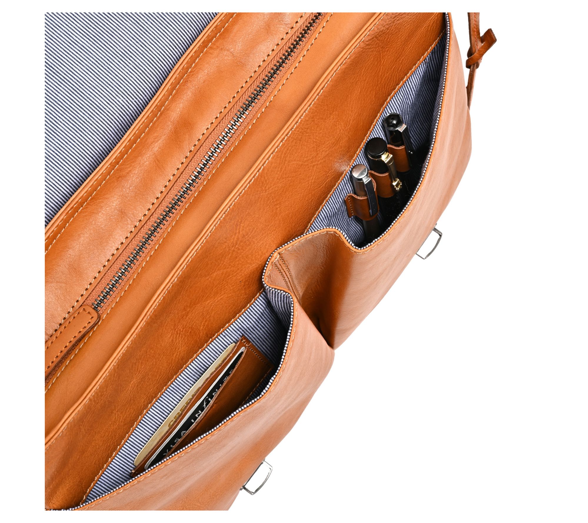 • Buckle closure; single handle; adjustable single strap; exterior zip pocket; two front open pockets with two card holders and three pen slots