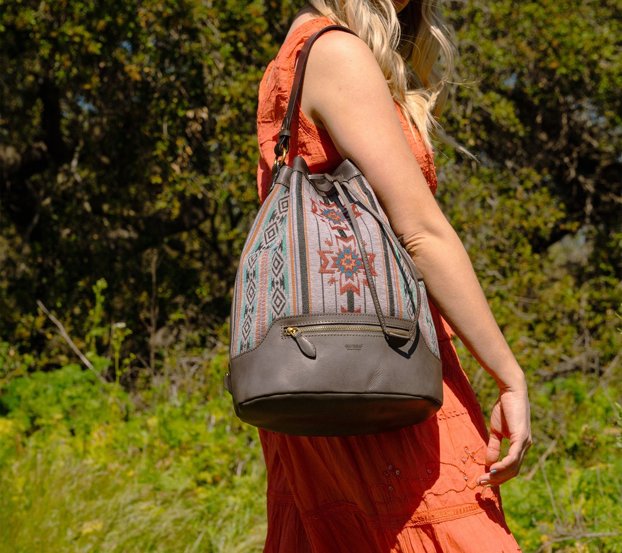 • Drawstring closure; single handle; convertible, detachable, adjustable strap; exterior zip pockets on front and back