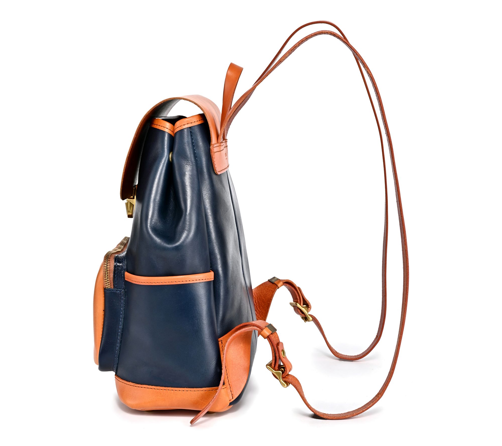 • Zip top and push-lock flap closure; single handle; double adjustable straps; exterior front zip pocket and two side slip pockets; protective metal feet