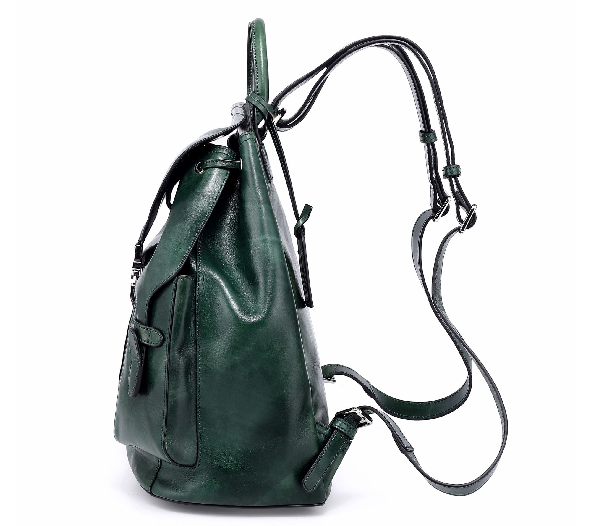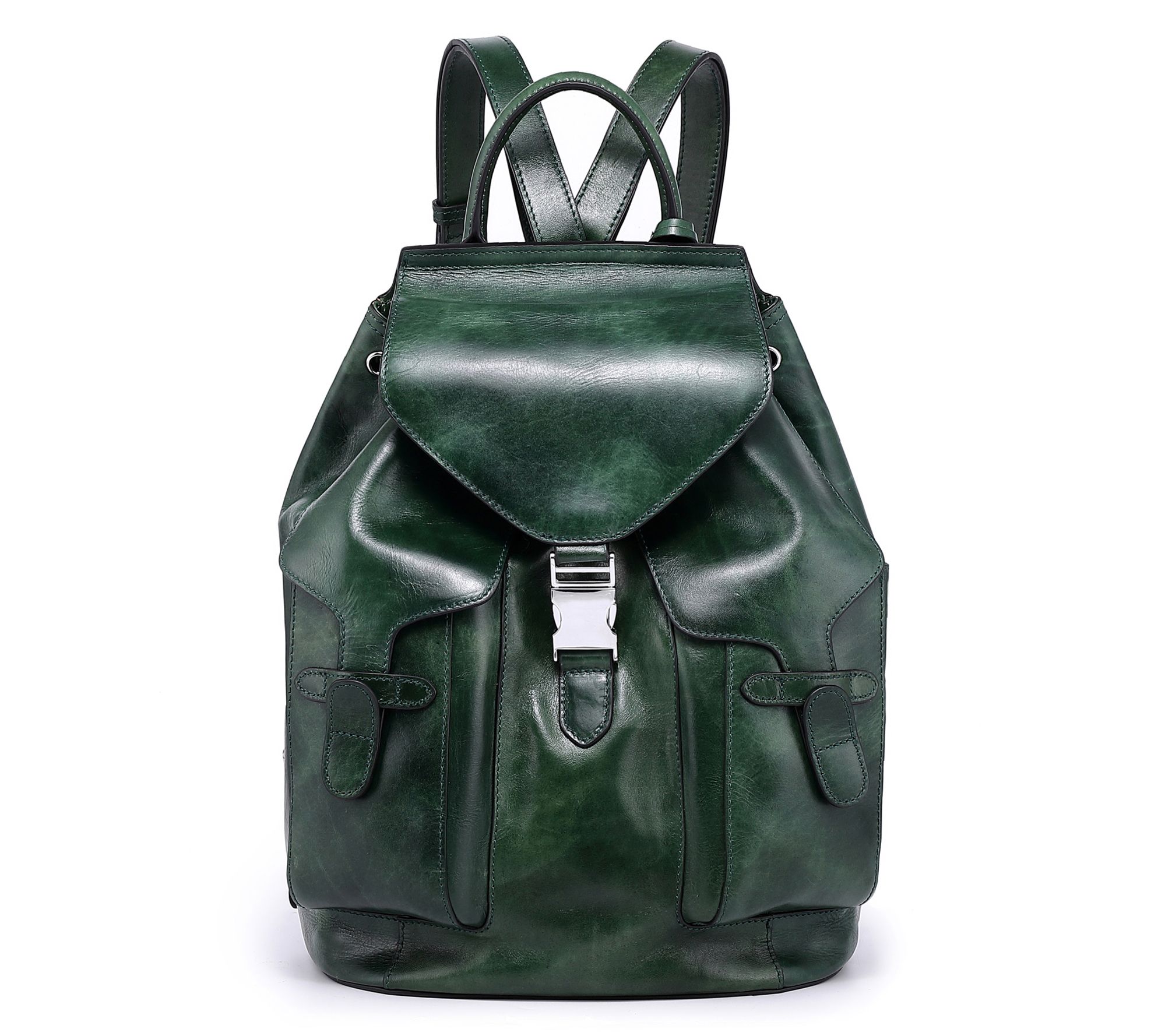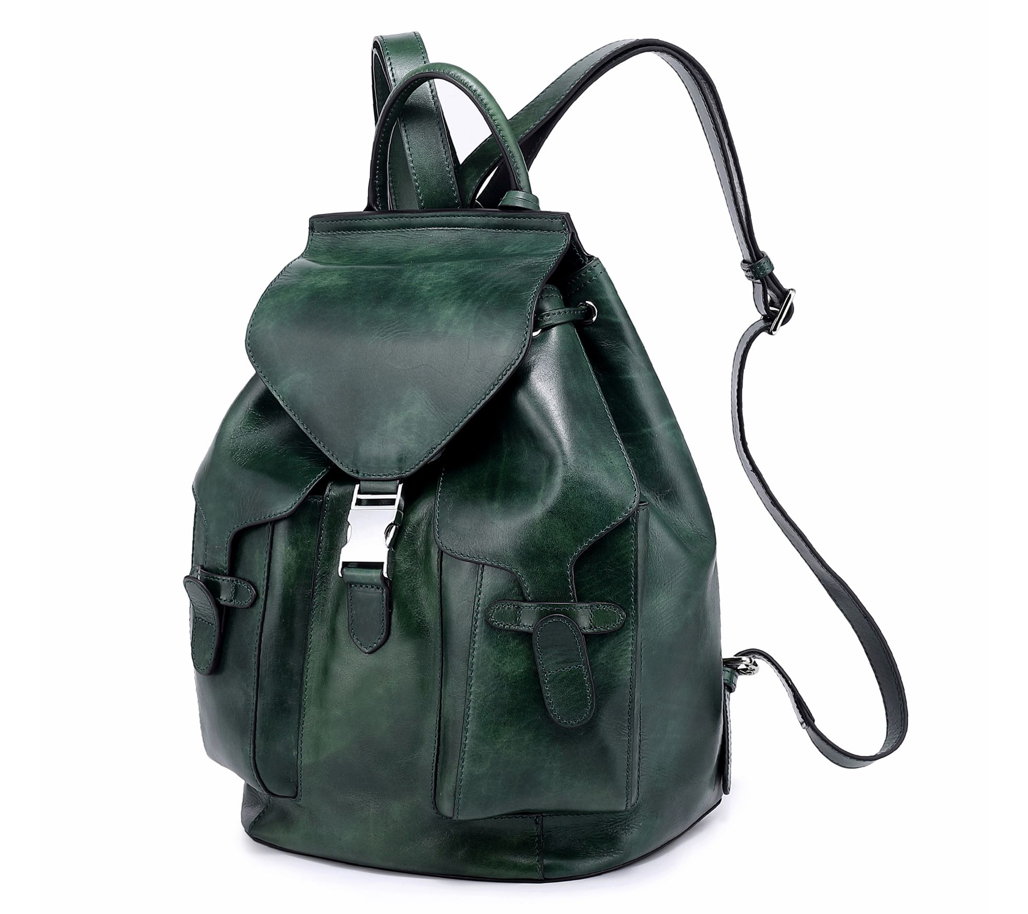 Buckle closure, flap with push-lock clasp, two toggle slip pockets, adjustable shoulder straps