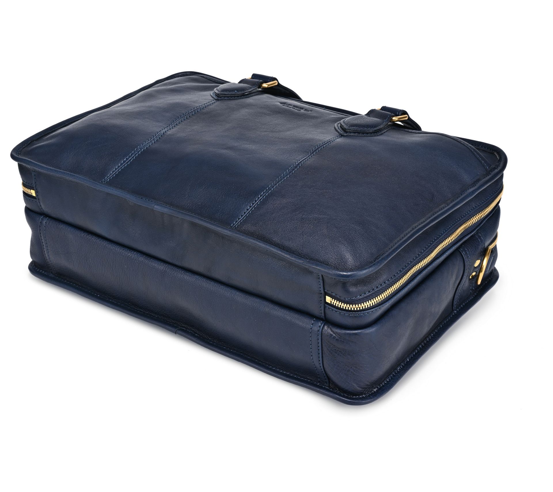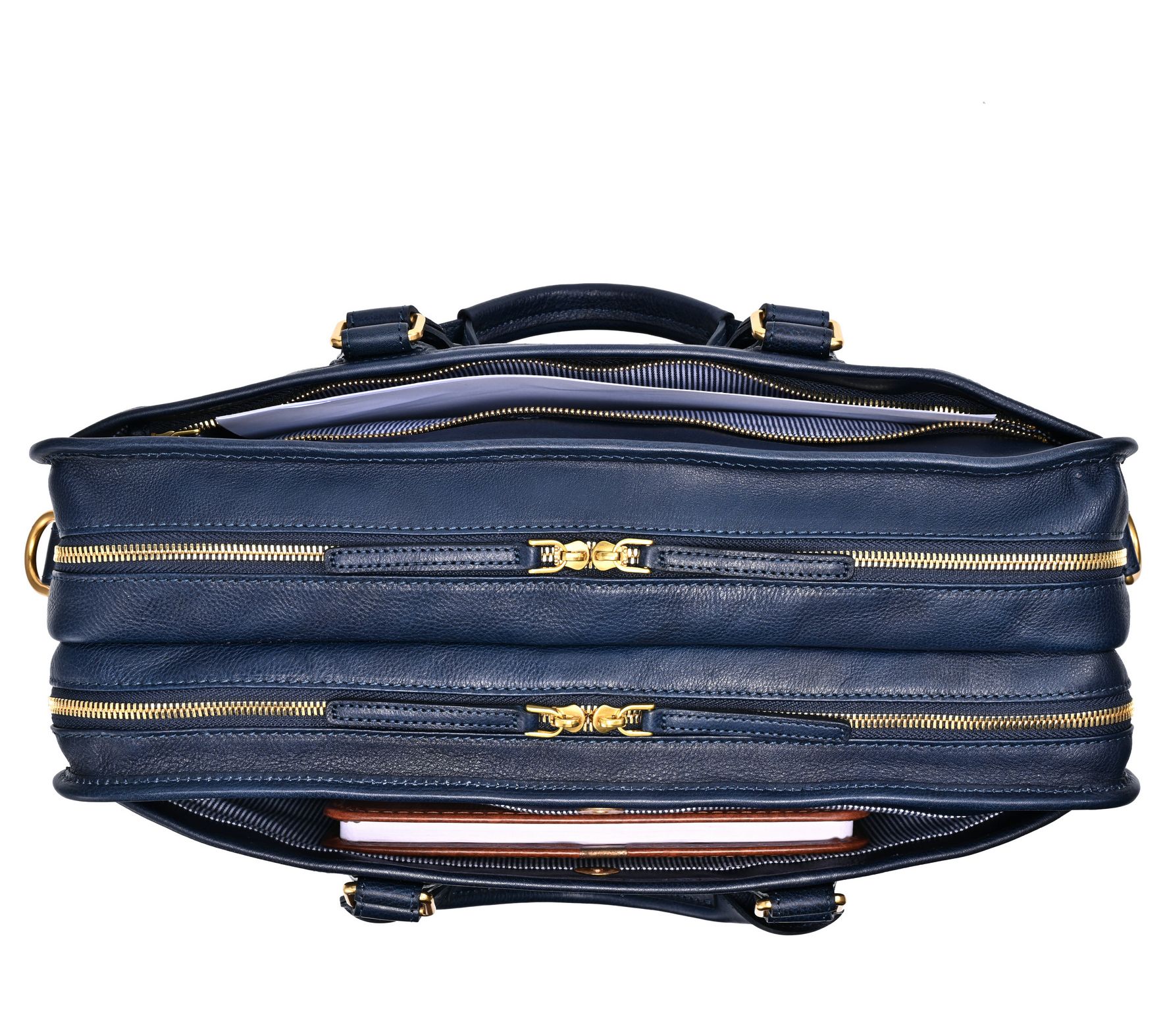Cotton lining with interior zip pocket, padded laptop compartment, four sleeve slots, four pen slots, one document sleeve, three leather open pockets