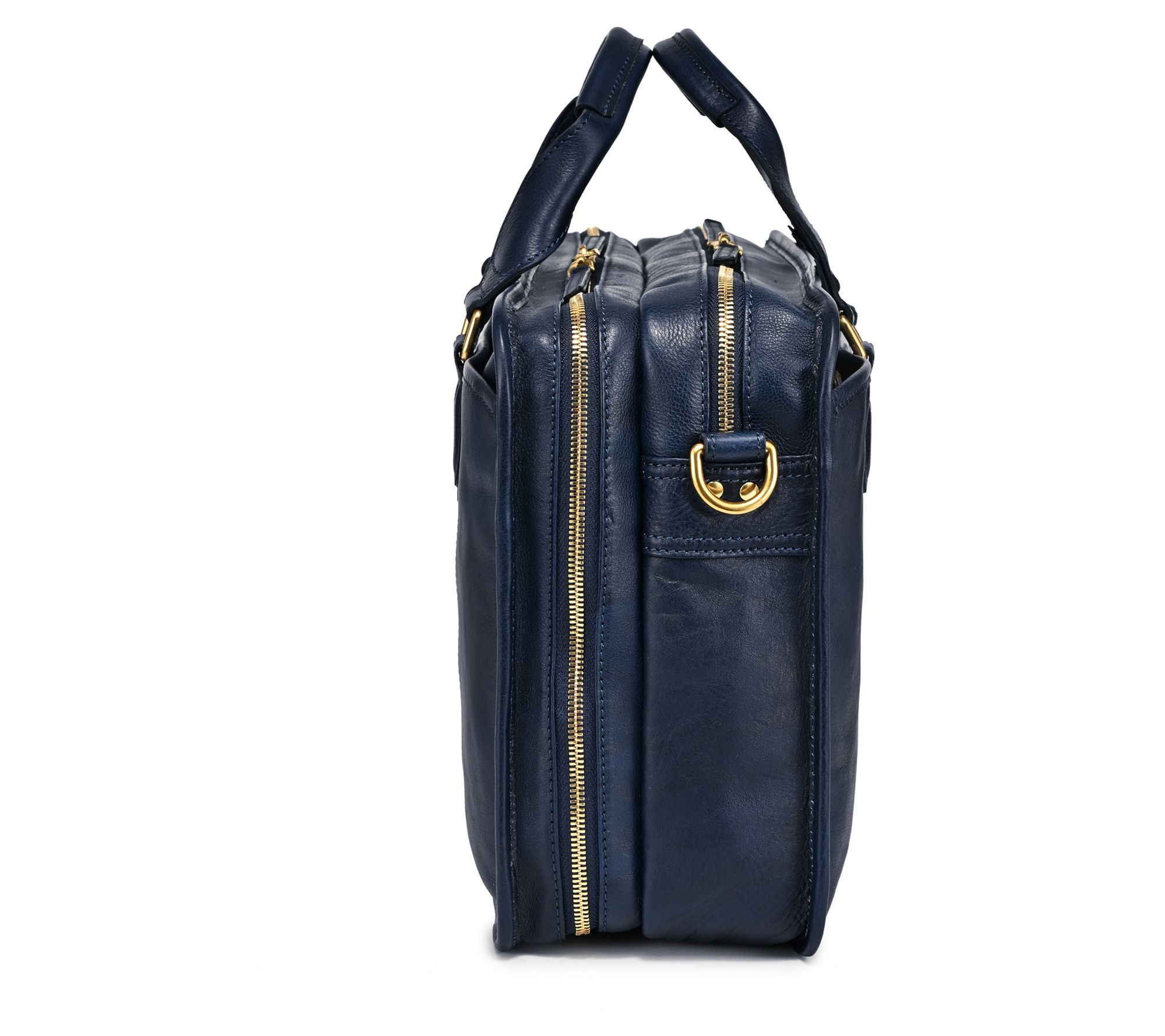 Genuine leather exterior with raw-edge detail, reinforced stitching, solid brass hardware, dual top handles, detachable adjustable shoulder strap, magnetic front pocket, two main zip compartments, rear zip pocket