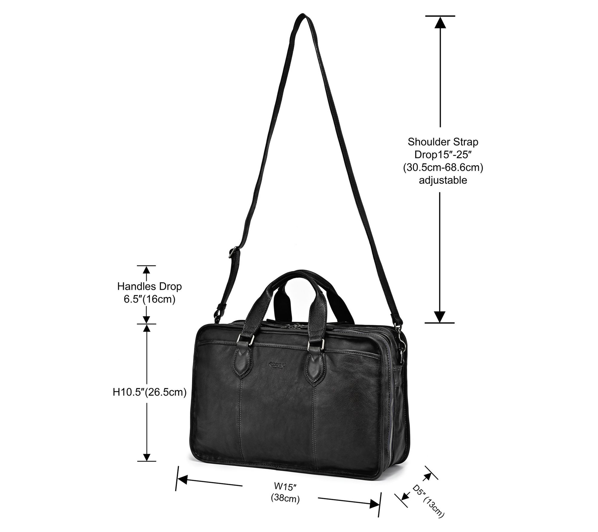Measures 15"W x 10"H x 5"D with a 6.5" handle drop and a 24" strap drop; handle length 13"; weighs 2.2 lbs