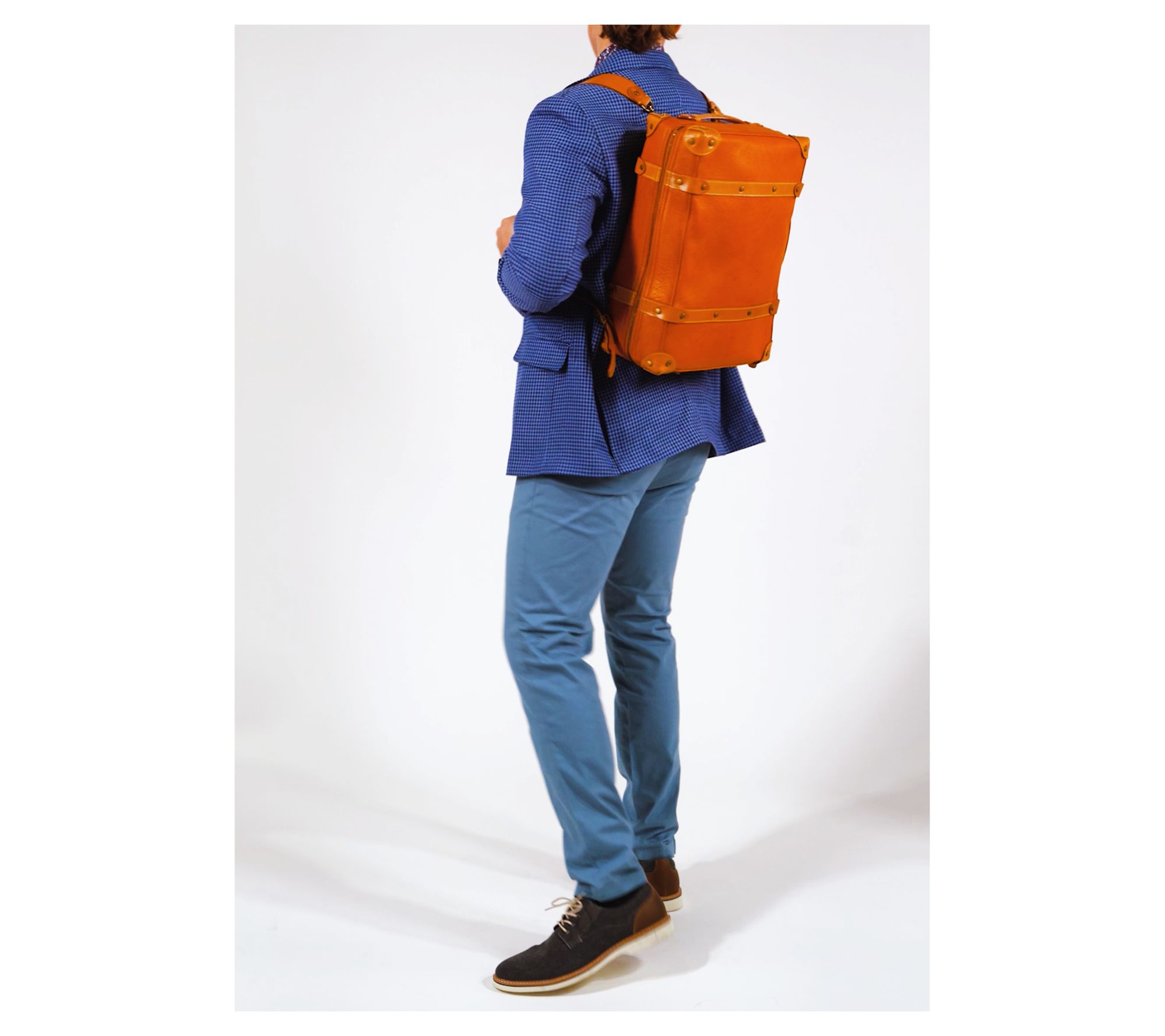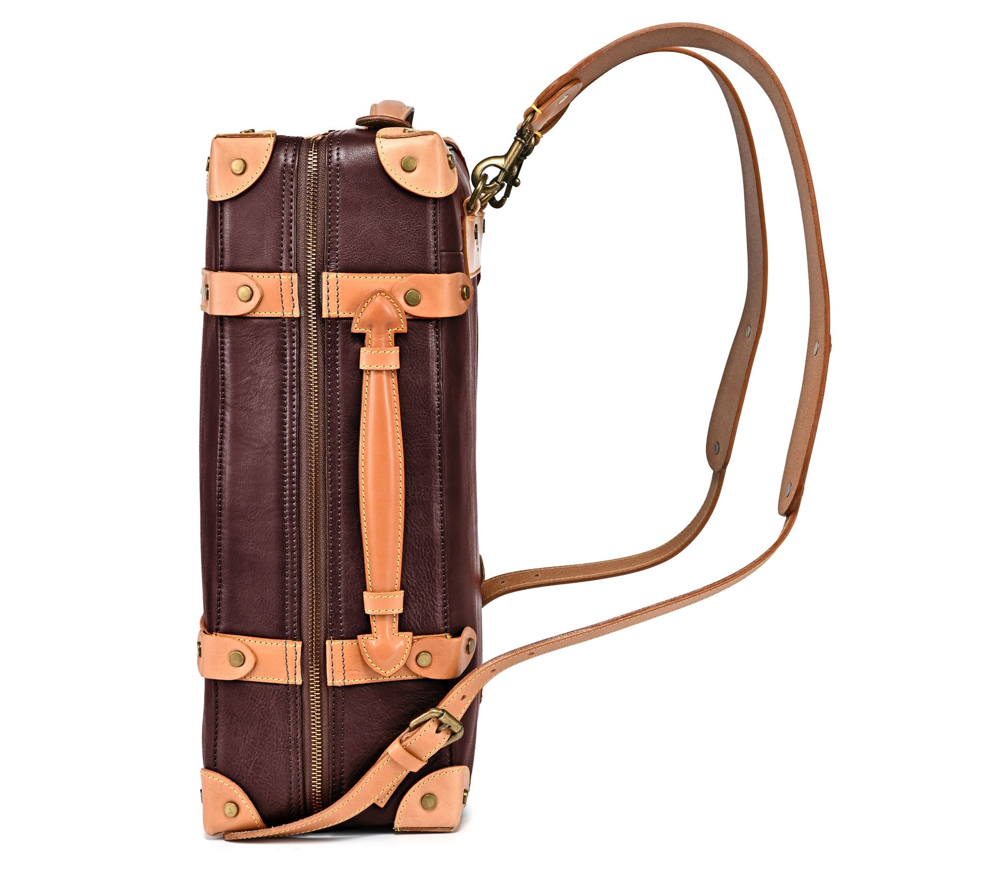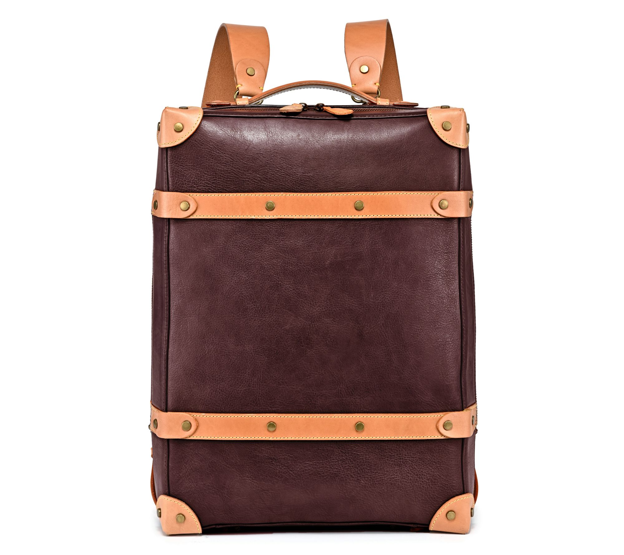 Top handle, adjustable backpack straps, detachable strap, zip closure, trunk silhouette