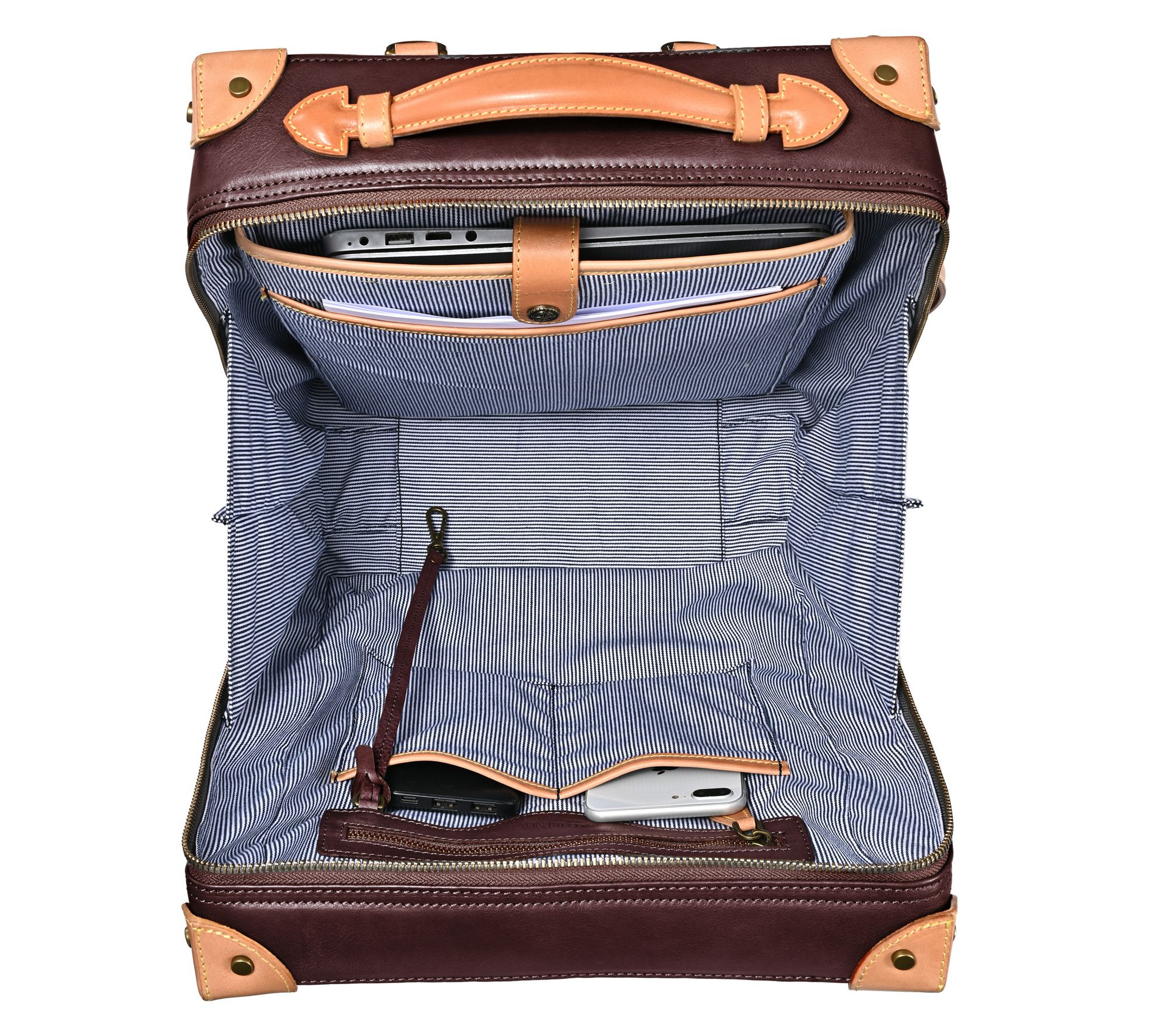Lined jacquard interior, zipper pocket, three sleeves pockets, D-ring, two pen slots, card slot