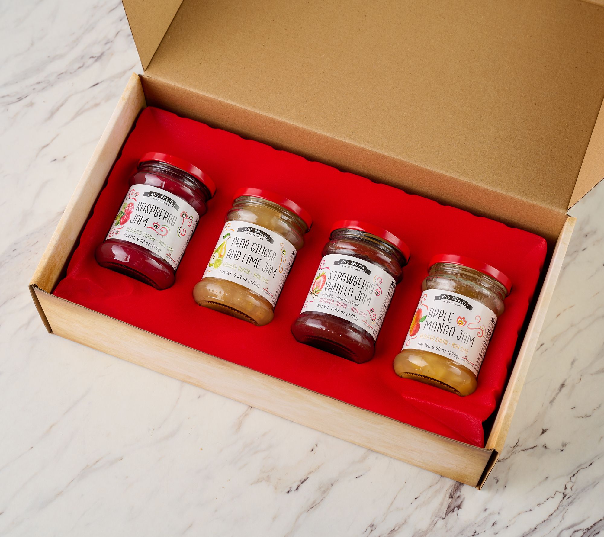• Includes four 9.5-oz jars of European fruit jam: one jar each of raspberry, strawberry vanilla, apple mango, and pear ginger lime