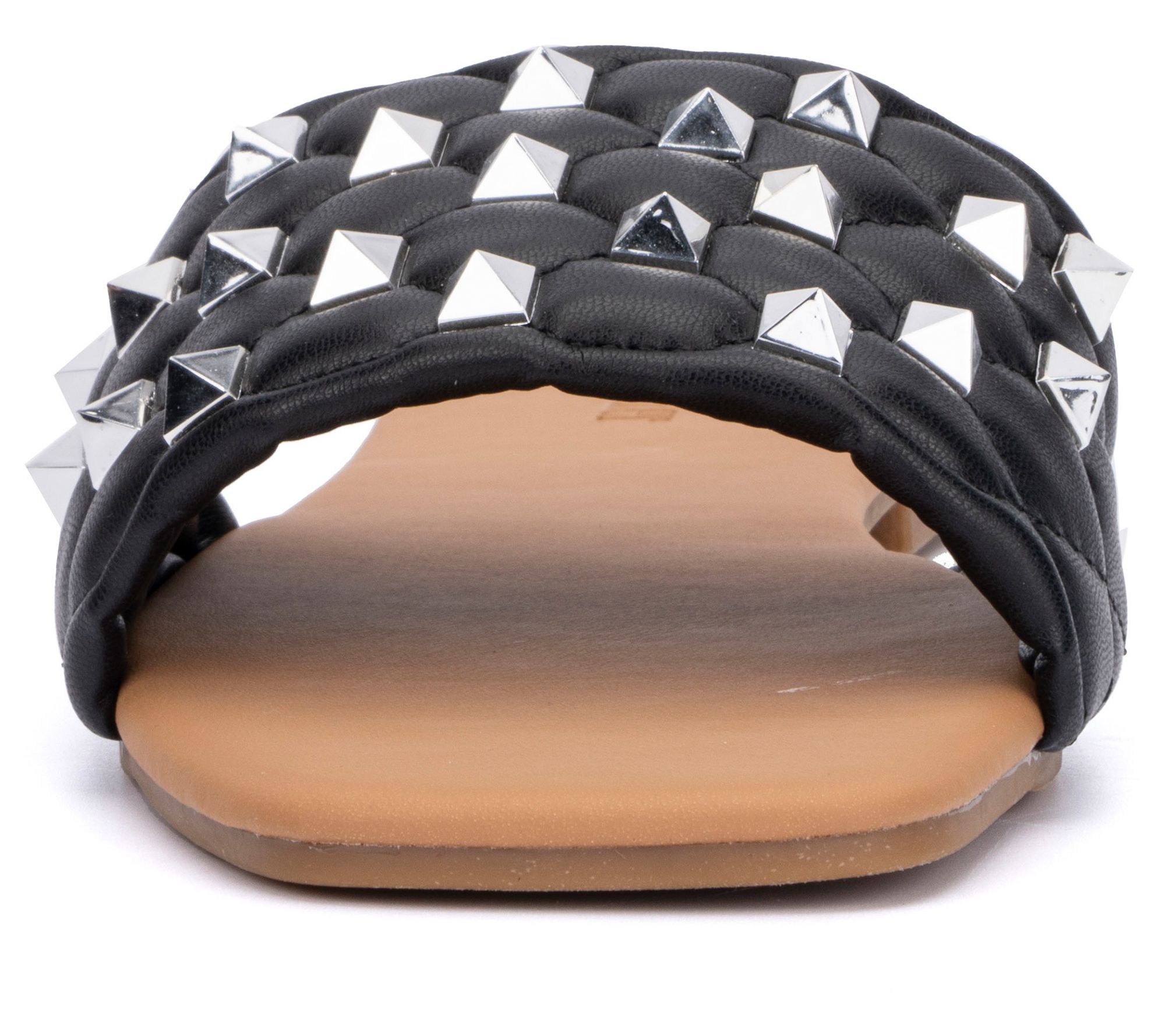 • Slip-on, studded details, quilted strap, square toe