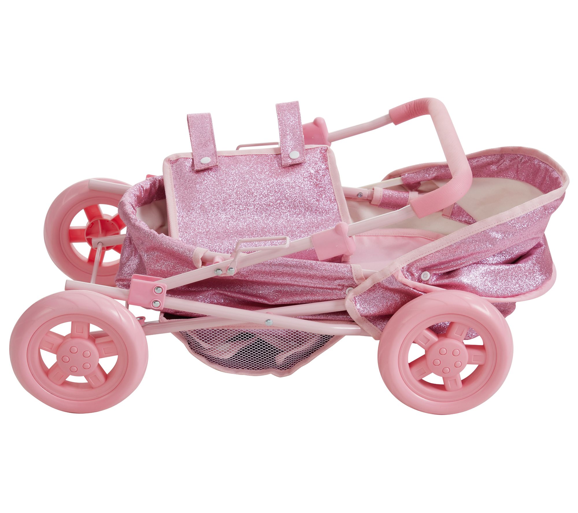 Let your little one take baby dolls and stuffed animals for delightful walks with the Olivias Little World baby doll bassinet pram. This pram-style stroller features a removable cover, a retractable canopy, and all-terrain wheels, making it perfect for indoor and outdoor adventures. The durable hot pink glitter polyester material and collapsible design ensure easy travel and storage. From Olivias Little World.