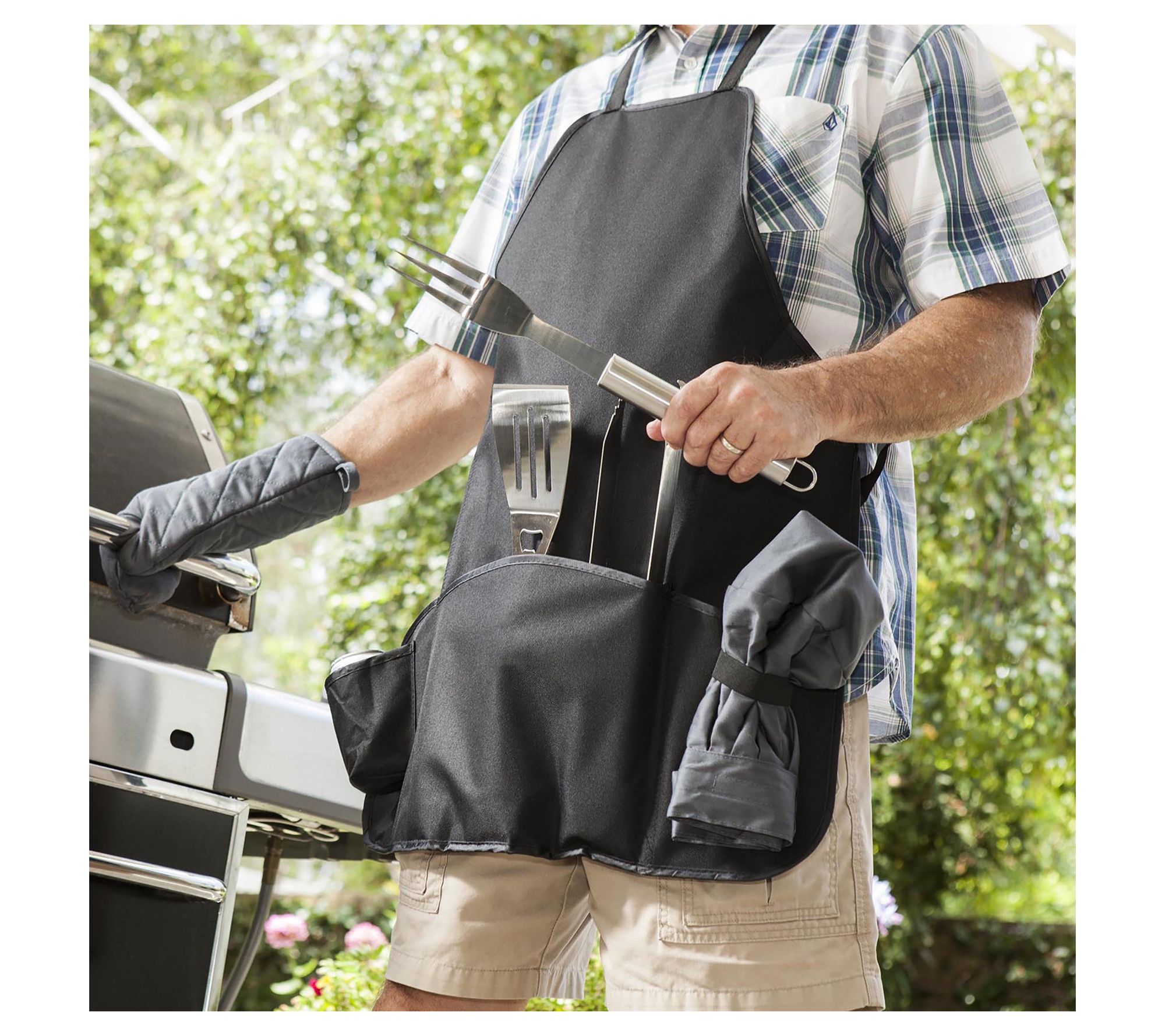 • Converts to a full-sized apron with a deluxe barbecue set stored inside