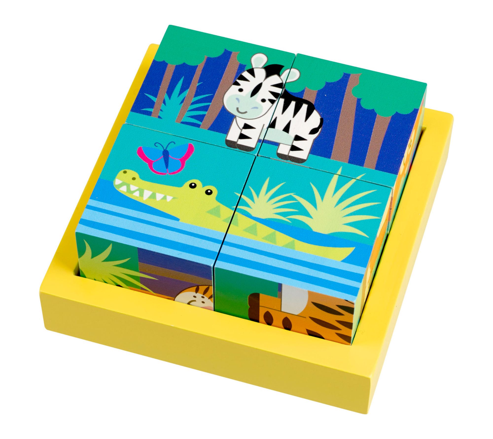 Little hands can dive into a wild world of fun with this wooden jungle animals puzzle. As little ones twist and turn each block, they'll discover six vibrant animal scenes to build, stack, and display -- turning playtime into an adventure in creativity, shape recognition, and motor skill development. From Orange Tree Toys.