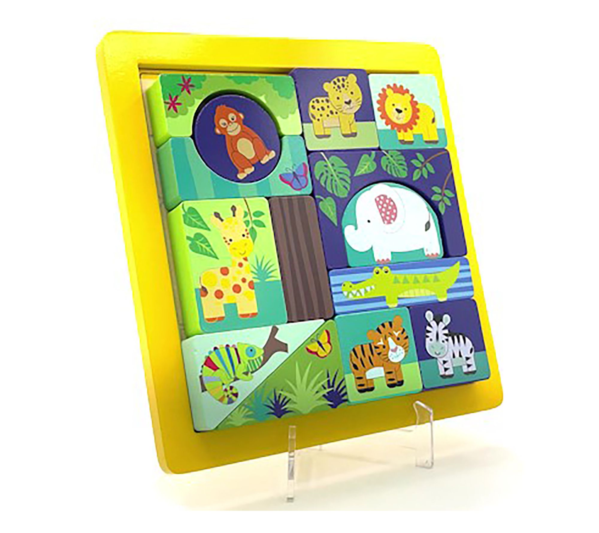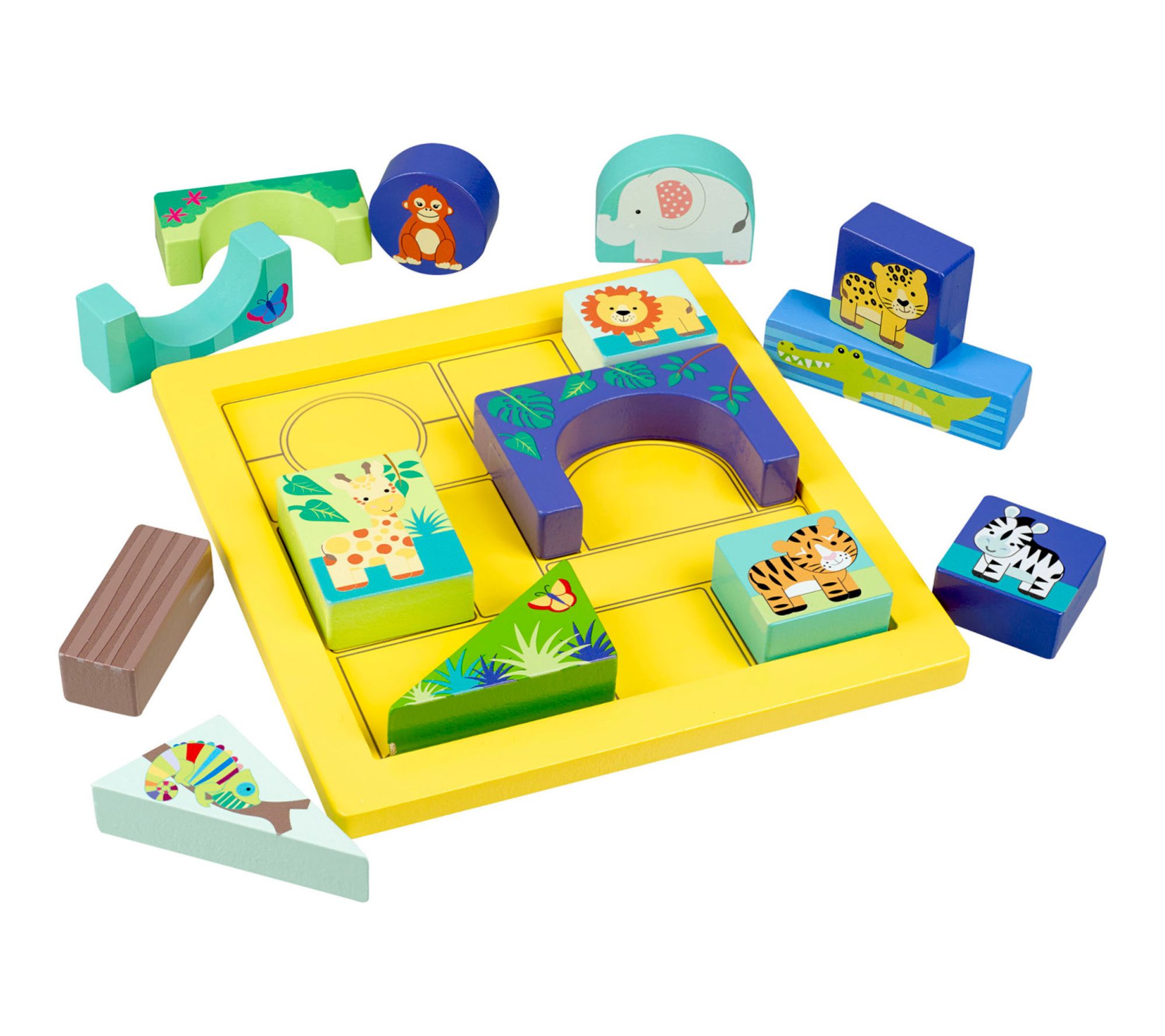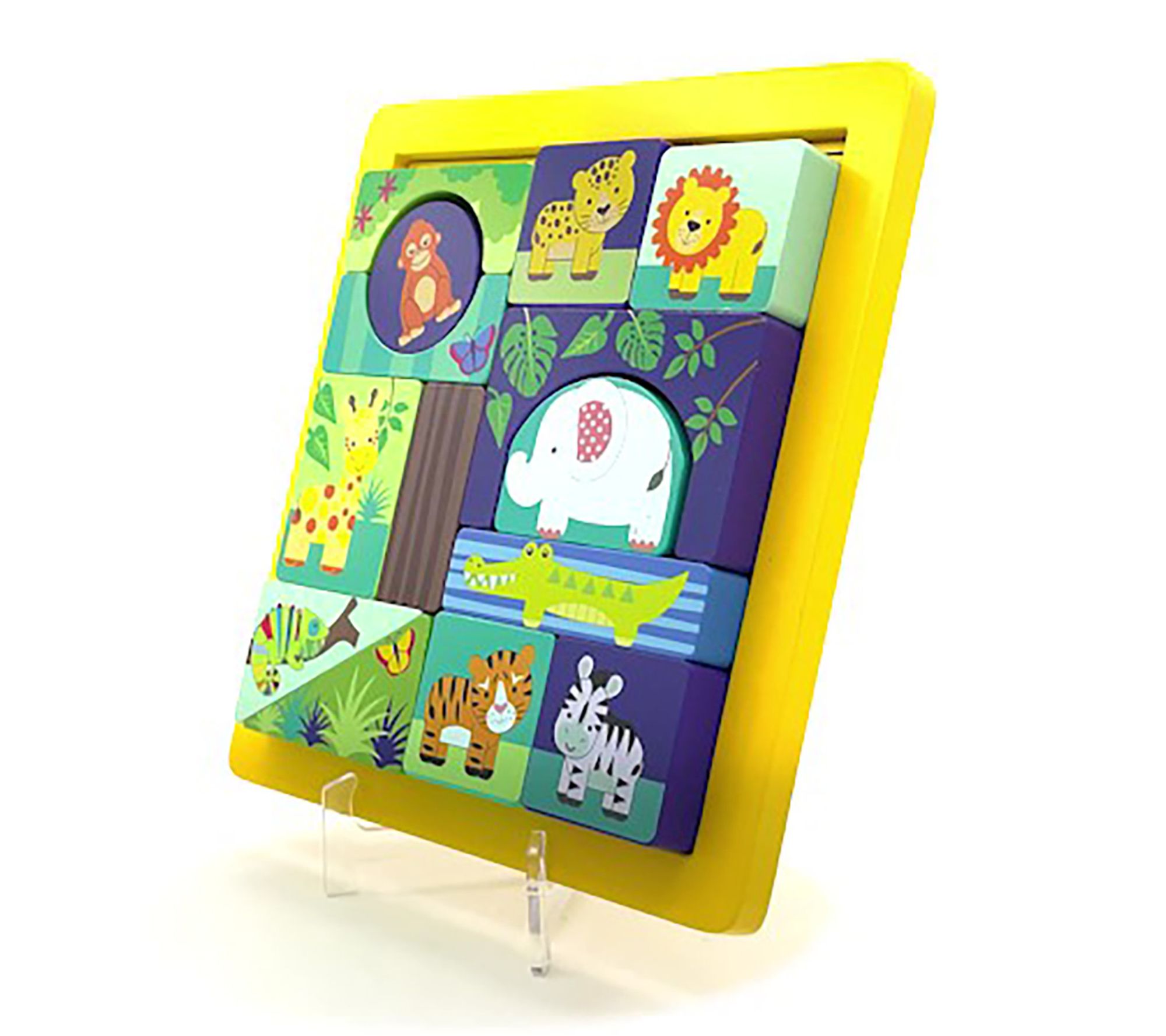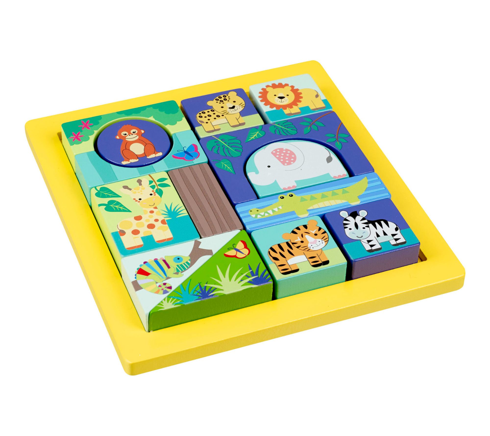 Bright colors and adorable jungle animals invite little ones to build, match, and explore with this engaging block puzzle. As kids piece together different shapes and vibrant animal scenes, they strengthen fine motor skills and embark on imaginative adventures -- plus, everything fits neatly back in the wooden tray when playtime is over. From Orange Tree Toys.