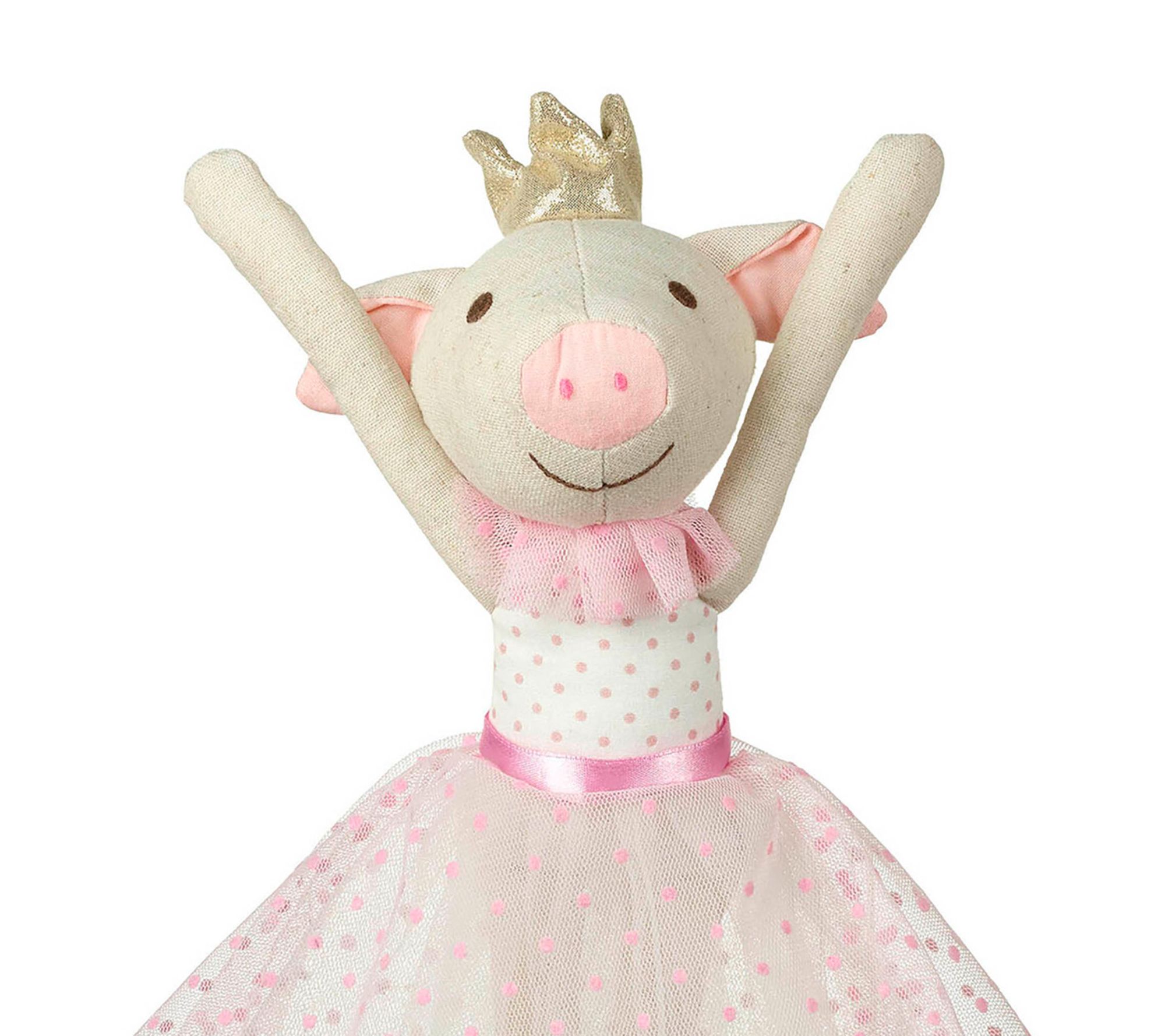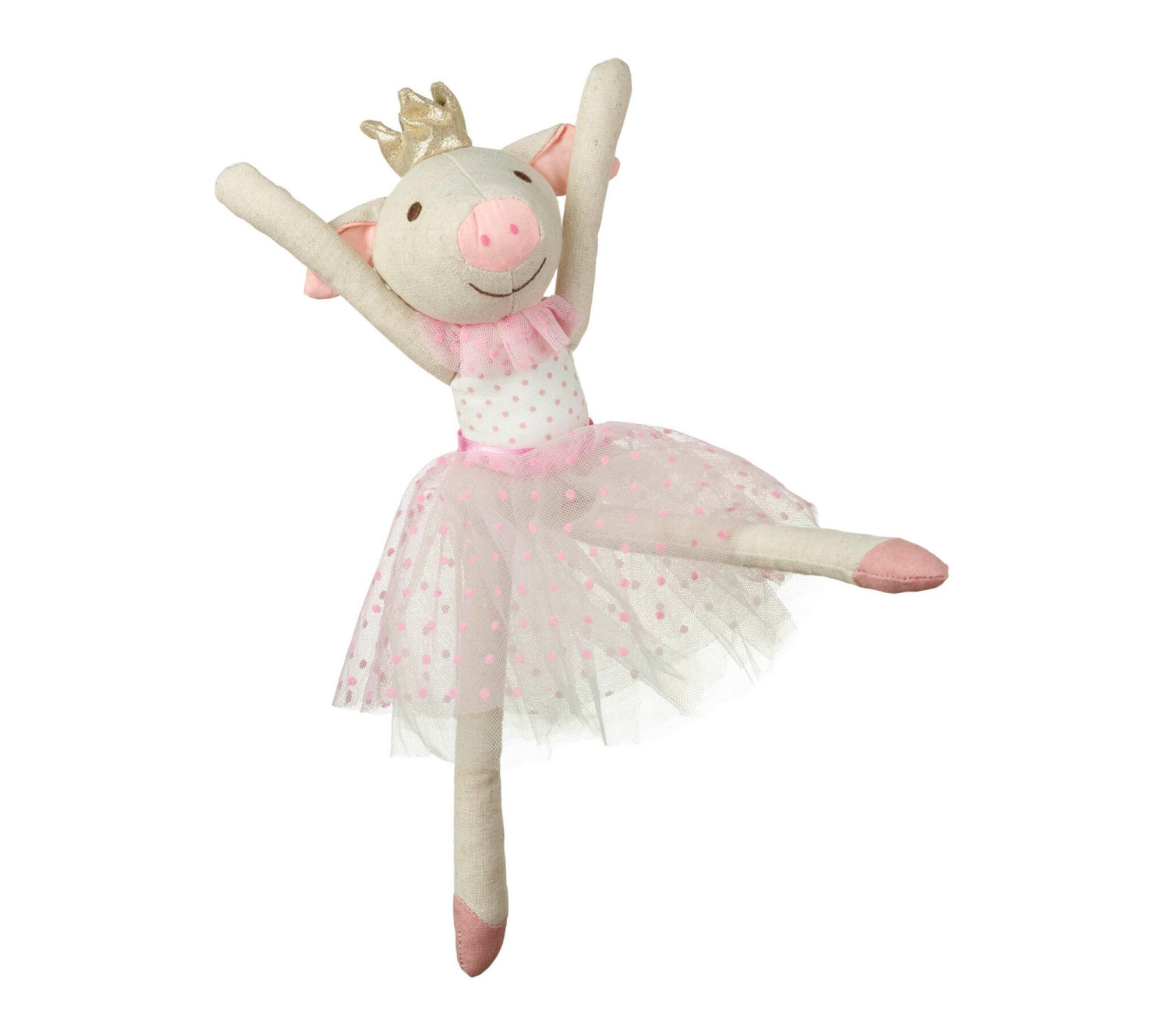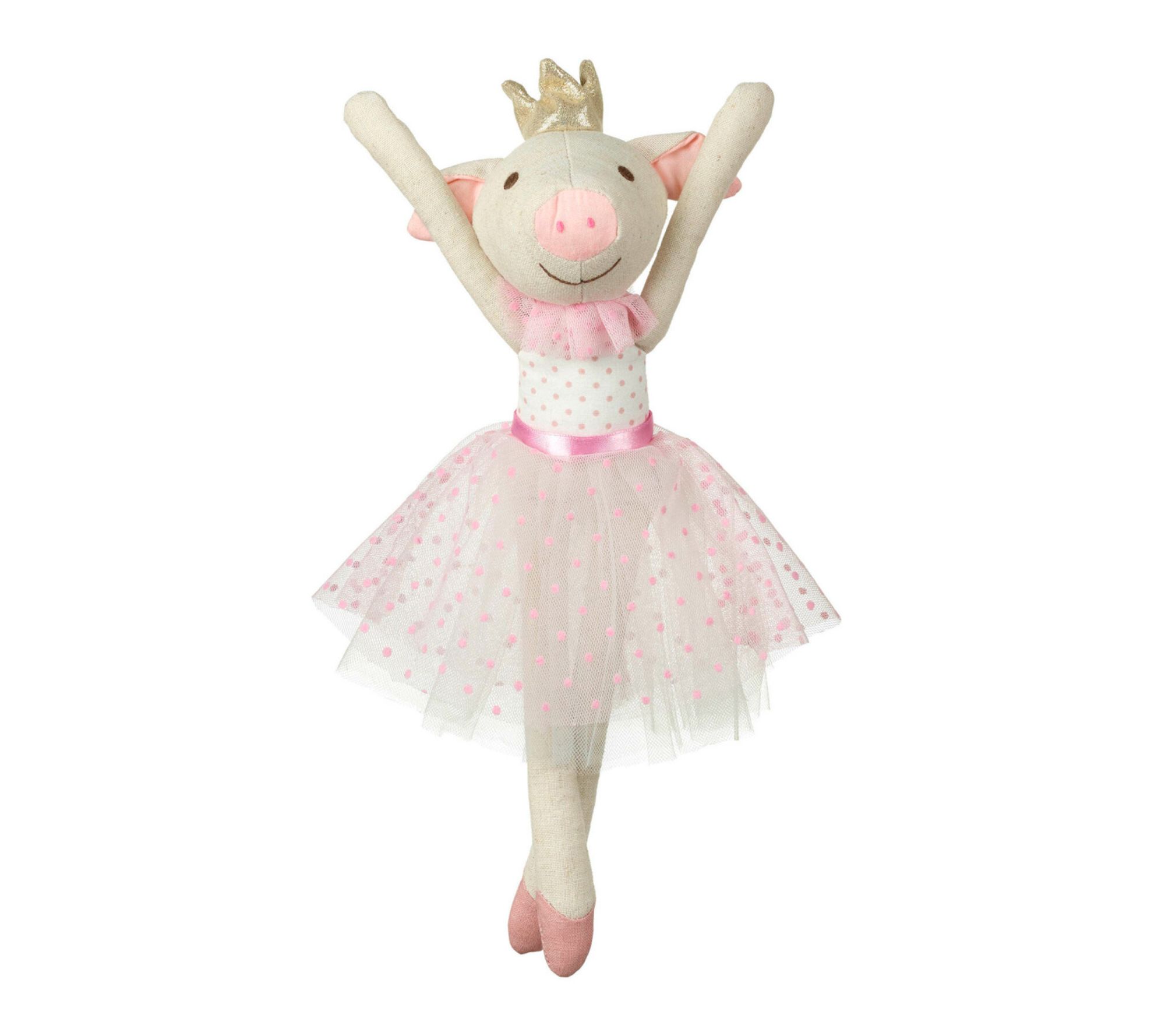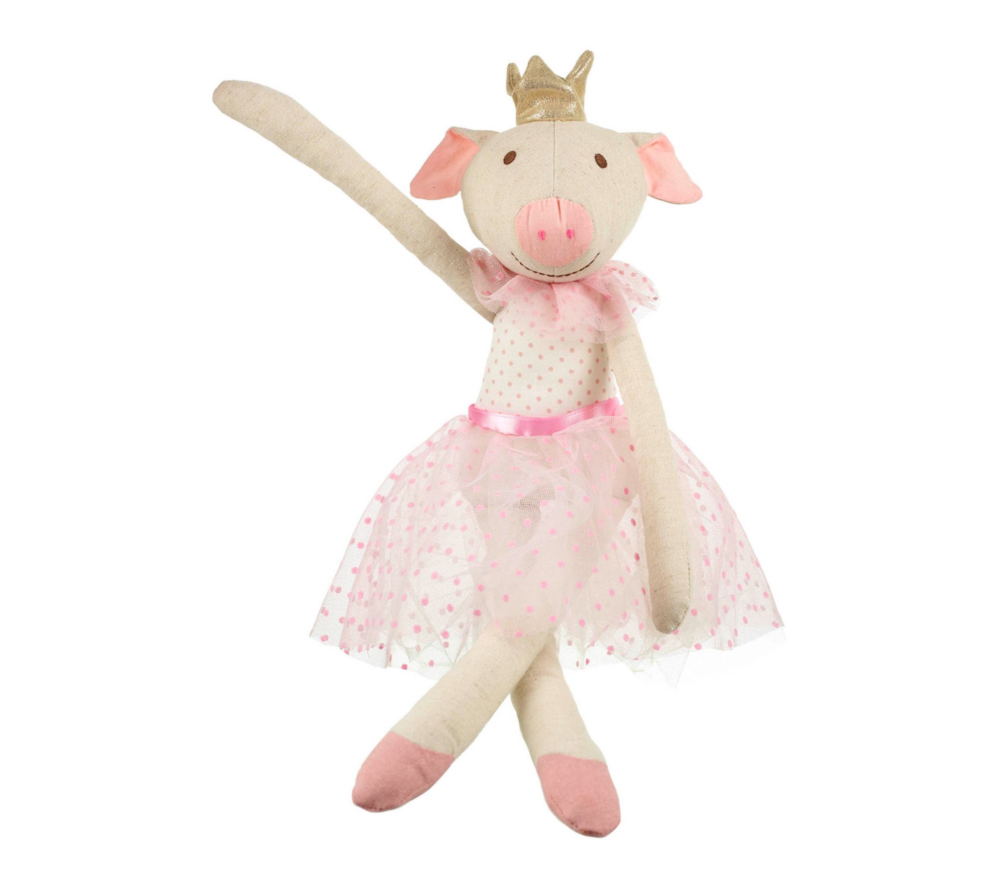 A whimsical companion awaits with this ballerina pig rag doll, dressed in a charming pink polka dot bodice, layered net skirt, and twinkling golden crown. Whether snuggled at naptime or joining in imaginative play, this plush friend brings comfort and a touch of ballet-inspired magic to every moment. From Orange Tree Toys.