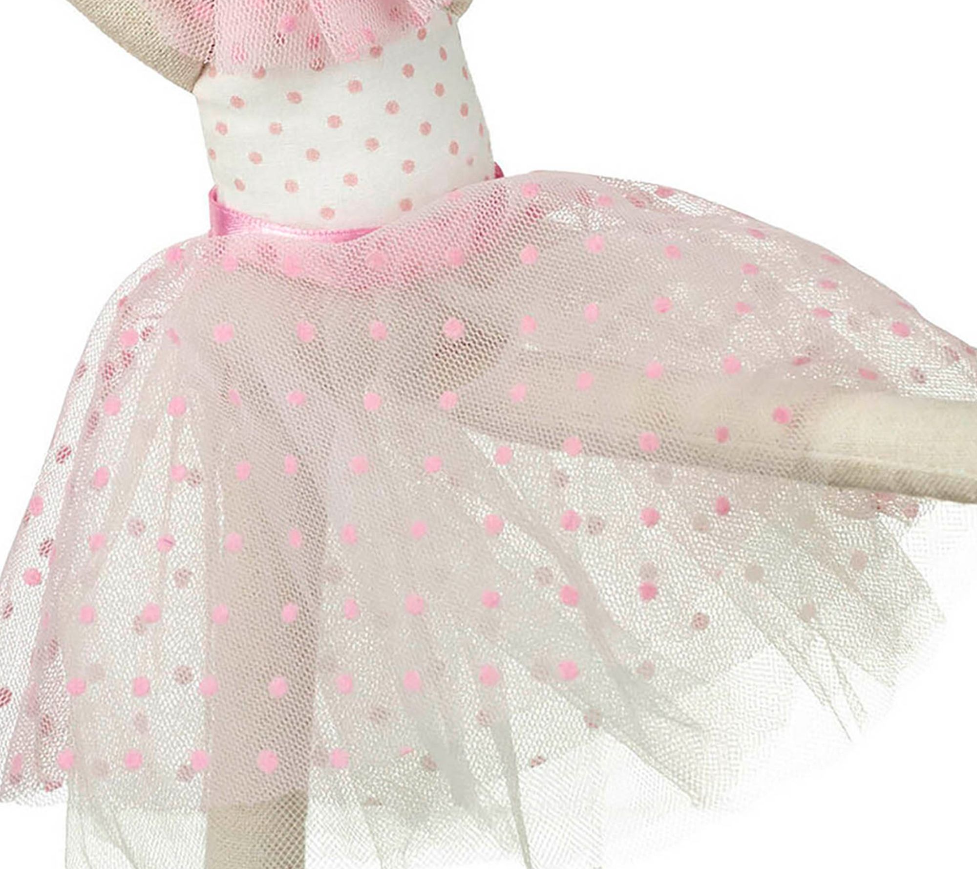 • Calico construction with pink cotton lining on ears, pink and white polka dot bodice with neck detailing and ribbon waistband, layered net skirt topped with pink polka dot fabric, goldtone crown