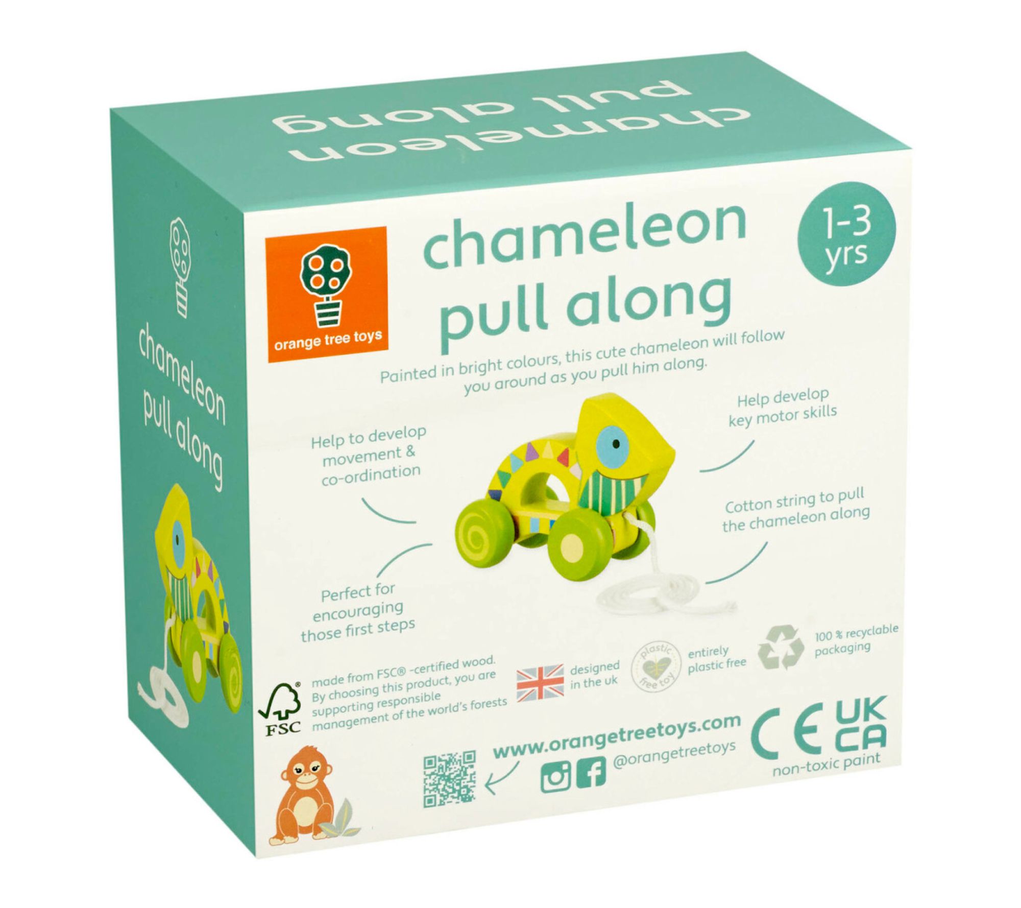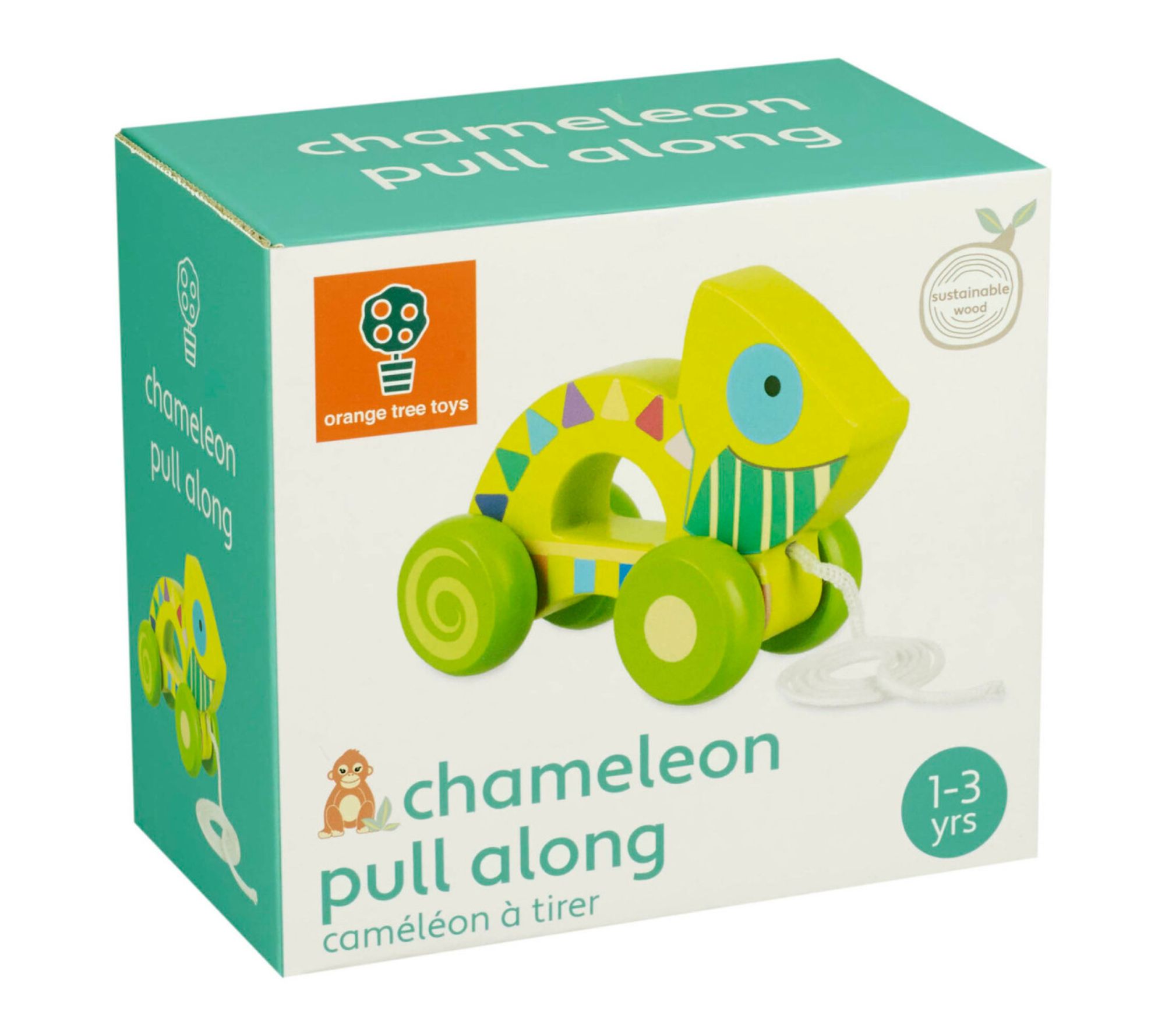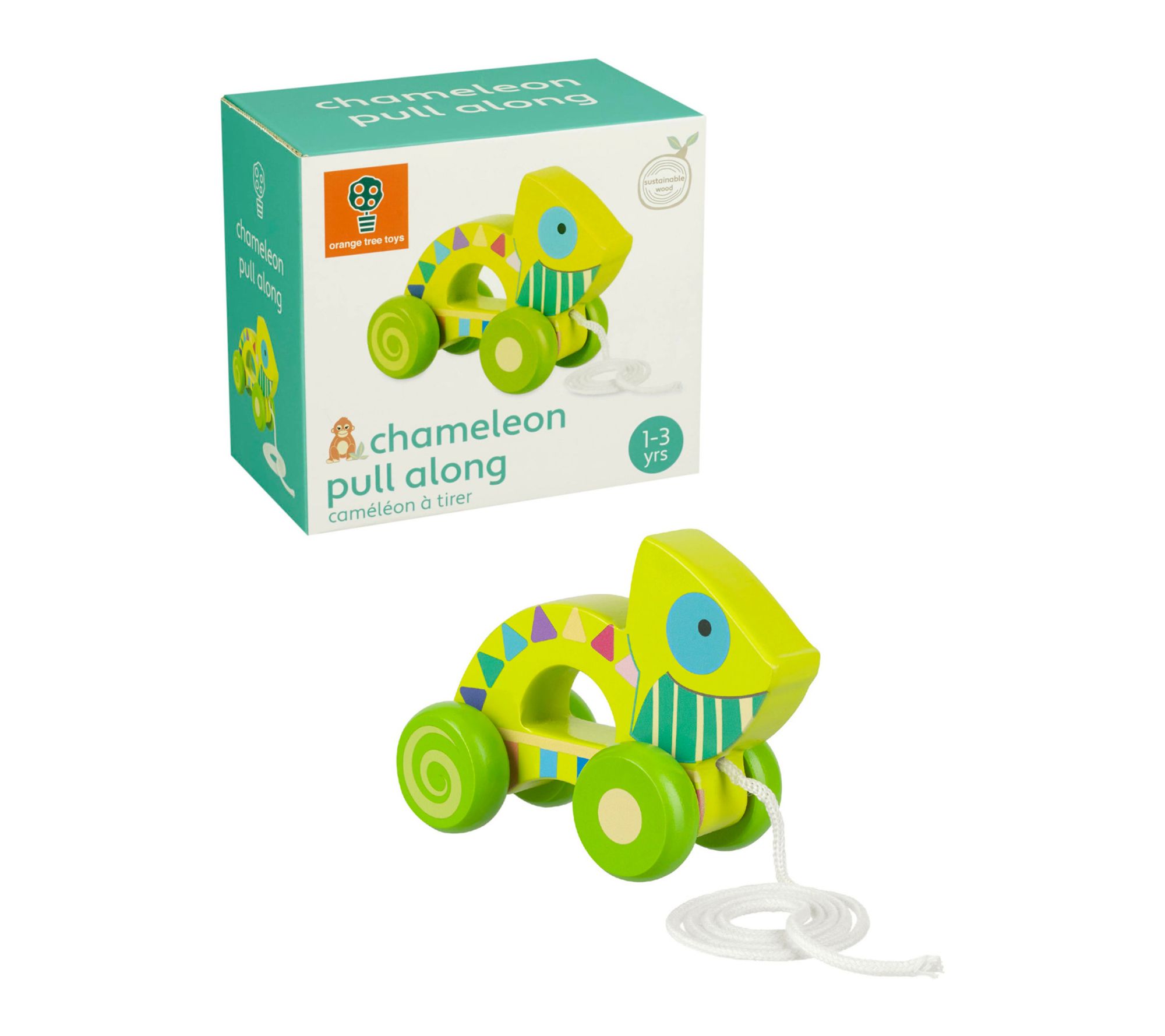 Brighten your toddler's early steps with this adorable wooden pull-along chameleon, painted in cheerful colors to spark curiosity and encourage movement. Watch as little ones delight in having their playful companion glide smoothly alongside them -- perfect for indoor or outdoor adventures that nurture coordination and confidence. From Orange Tree Toys.