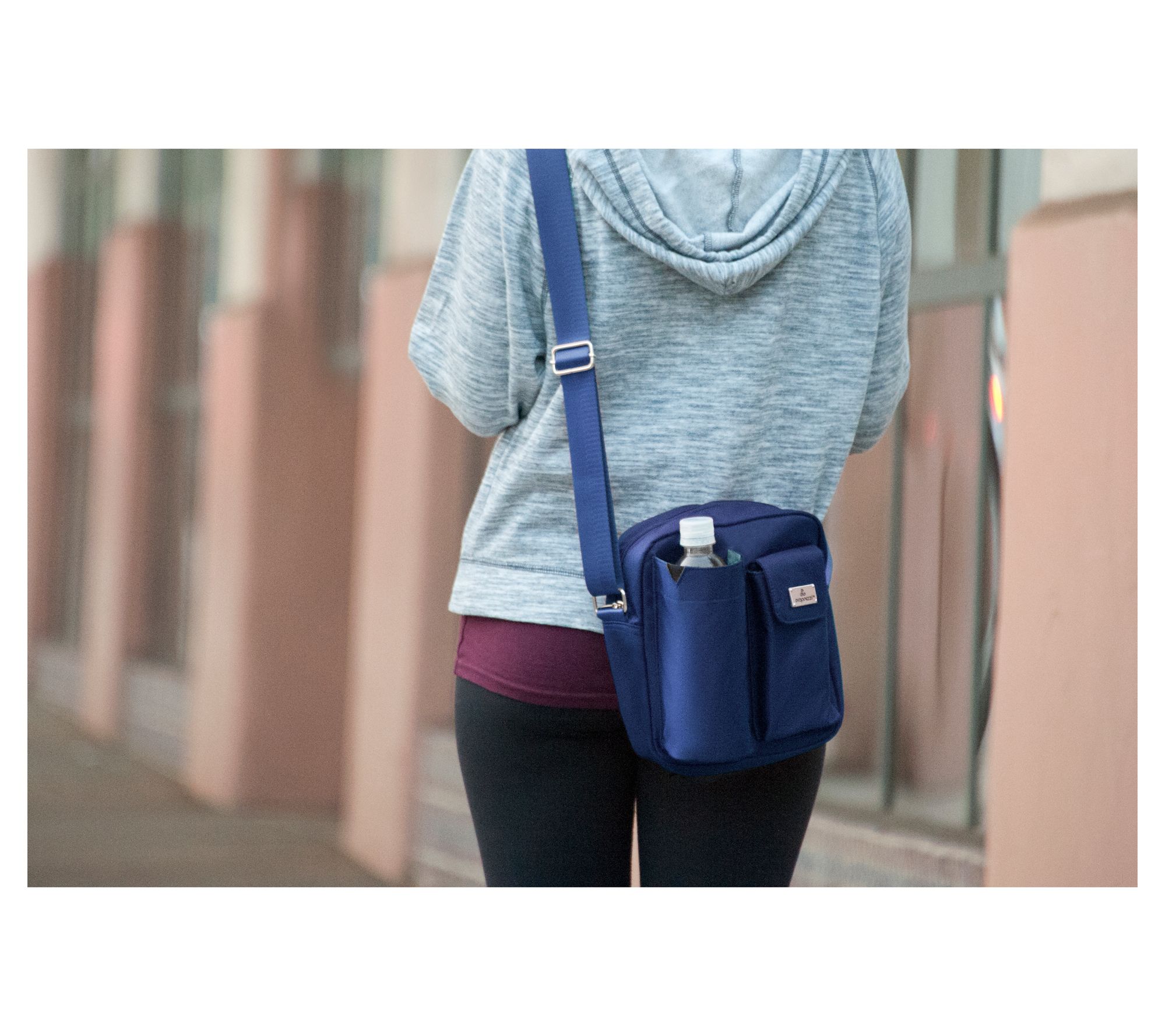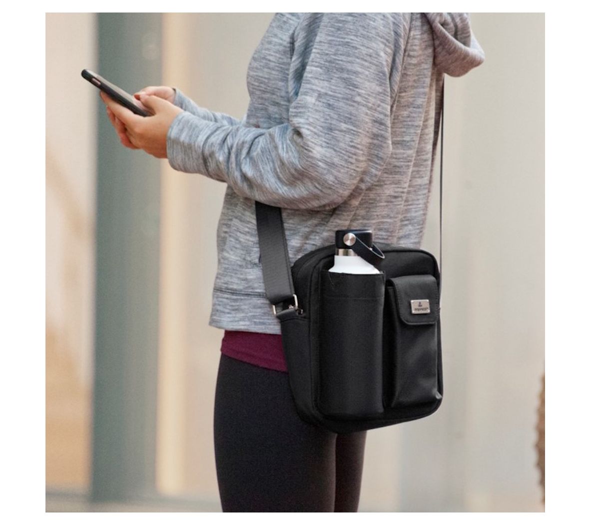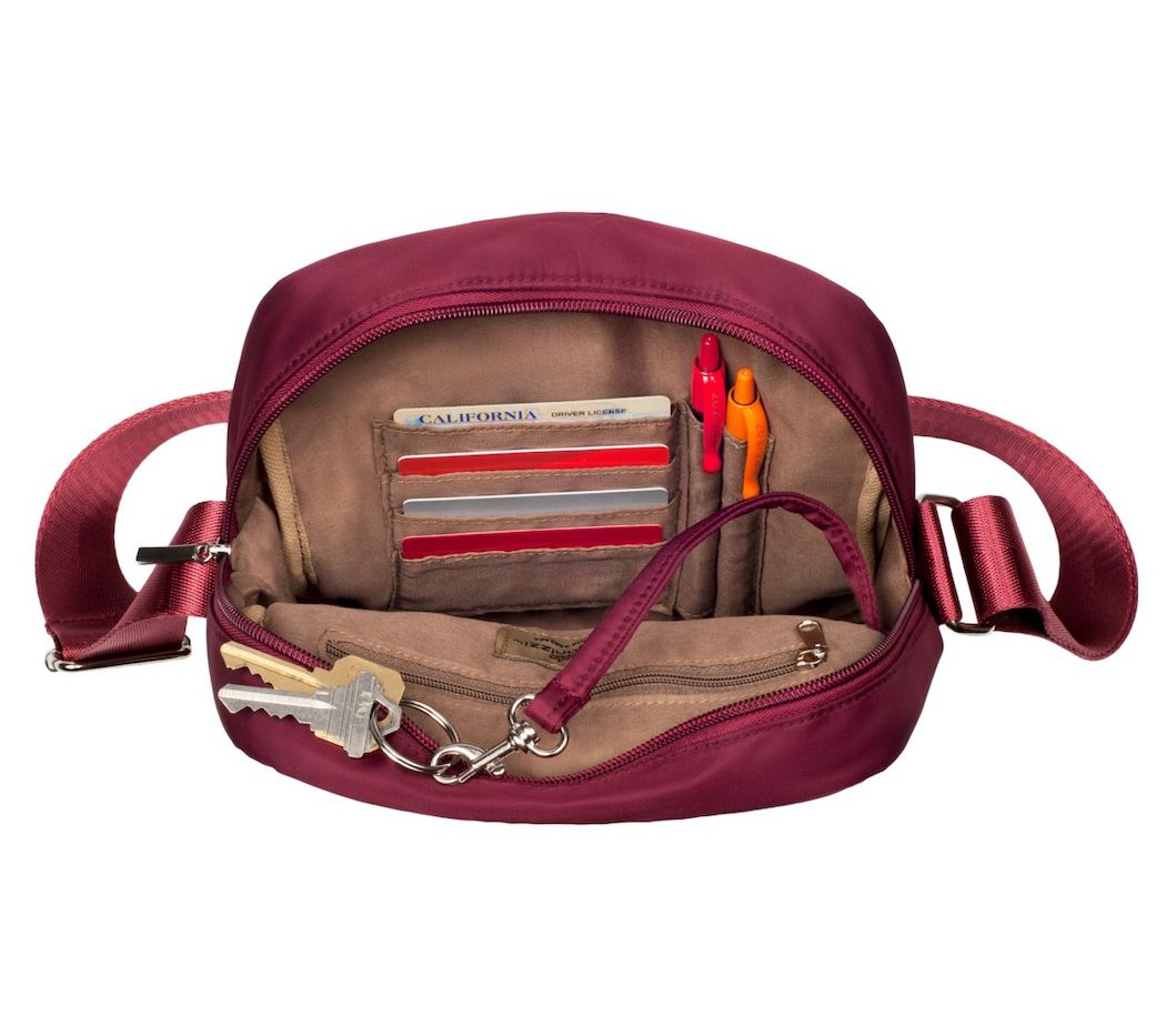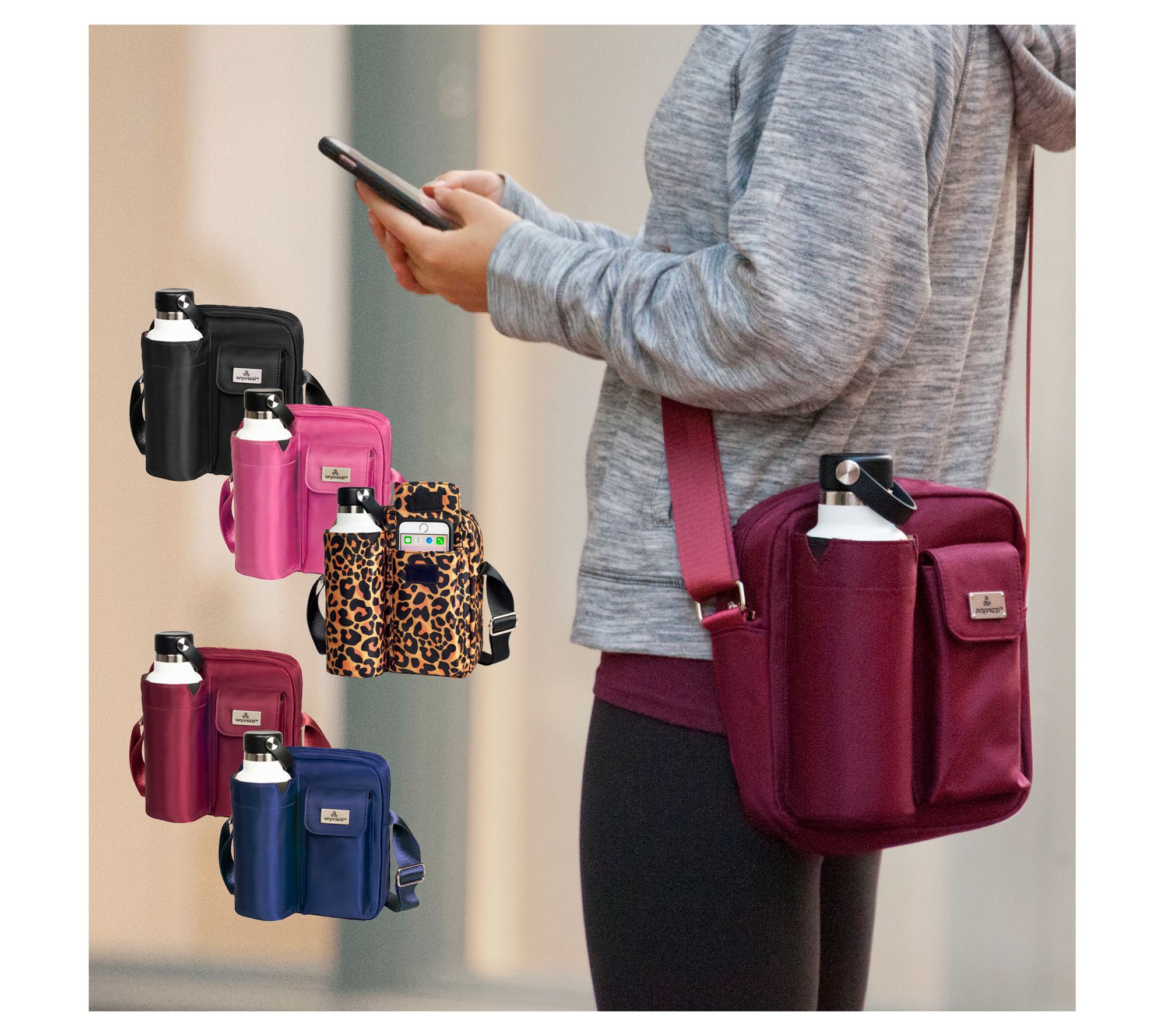 This stylish crossbody bag keeps your credit cards, ID, and money organized and secure. It features a water bottle pouch, phone pocket, and a large zippered compartment with pockets inside. From Organizzi.