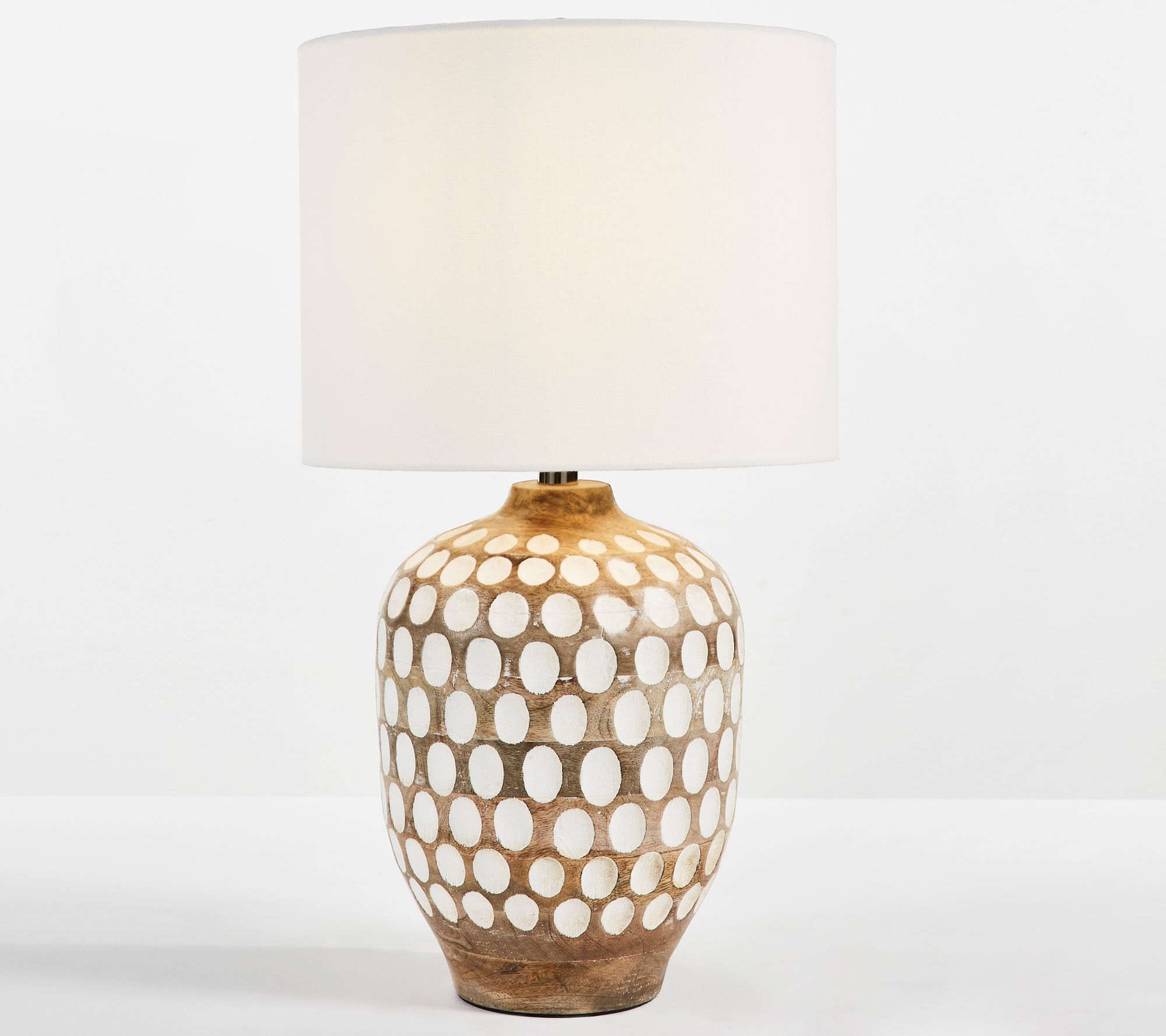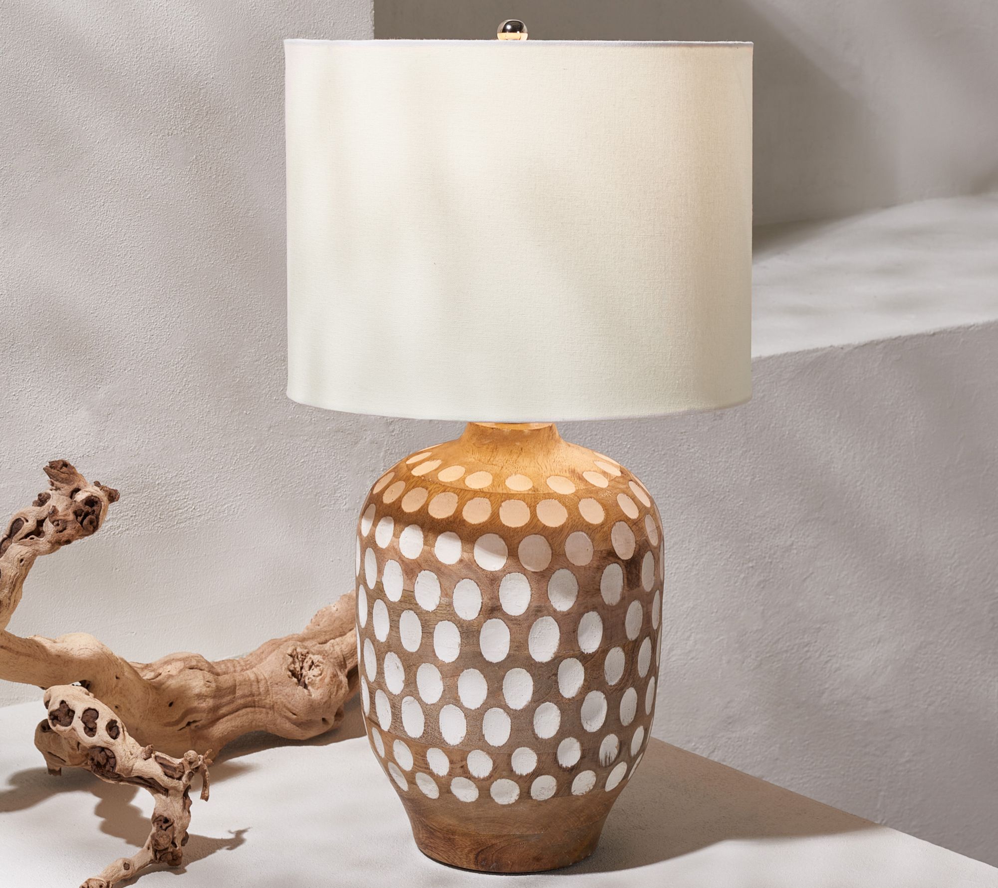 Accent your home with the artistic sophistication of this modern table lamp featuring a textured wood base and fabric drum shade. From Safavieh.