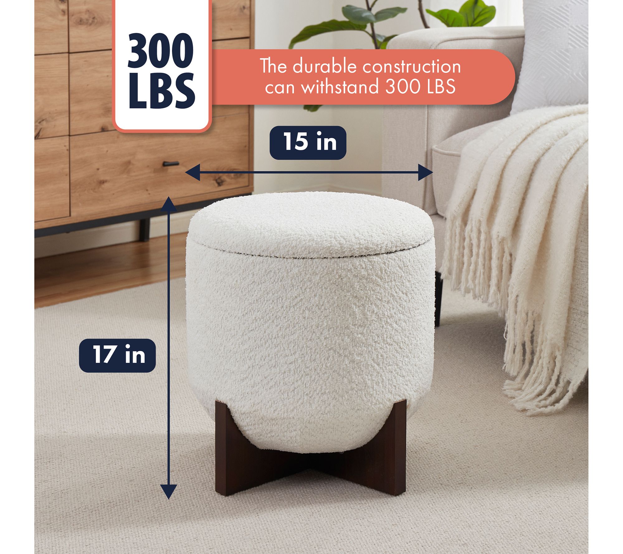 • Measures 15"D x 15"W x 17"H; supports up to 300 lbs
