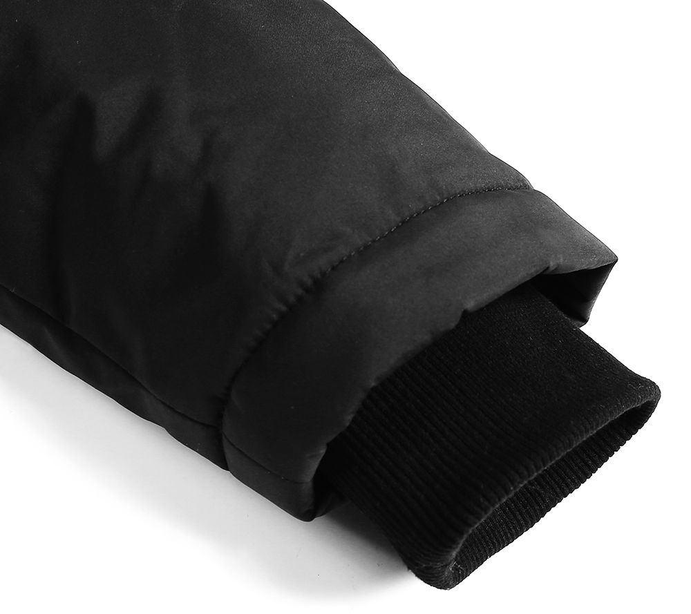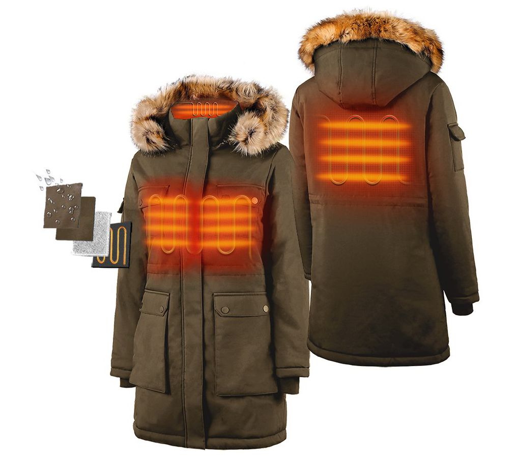 Features: four heat zones at left and right chest, upper back, and collar bone, three adjustable heat settings, hidden power button, detachable faux fur-lined hood, durable water-repellant finish