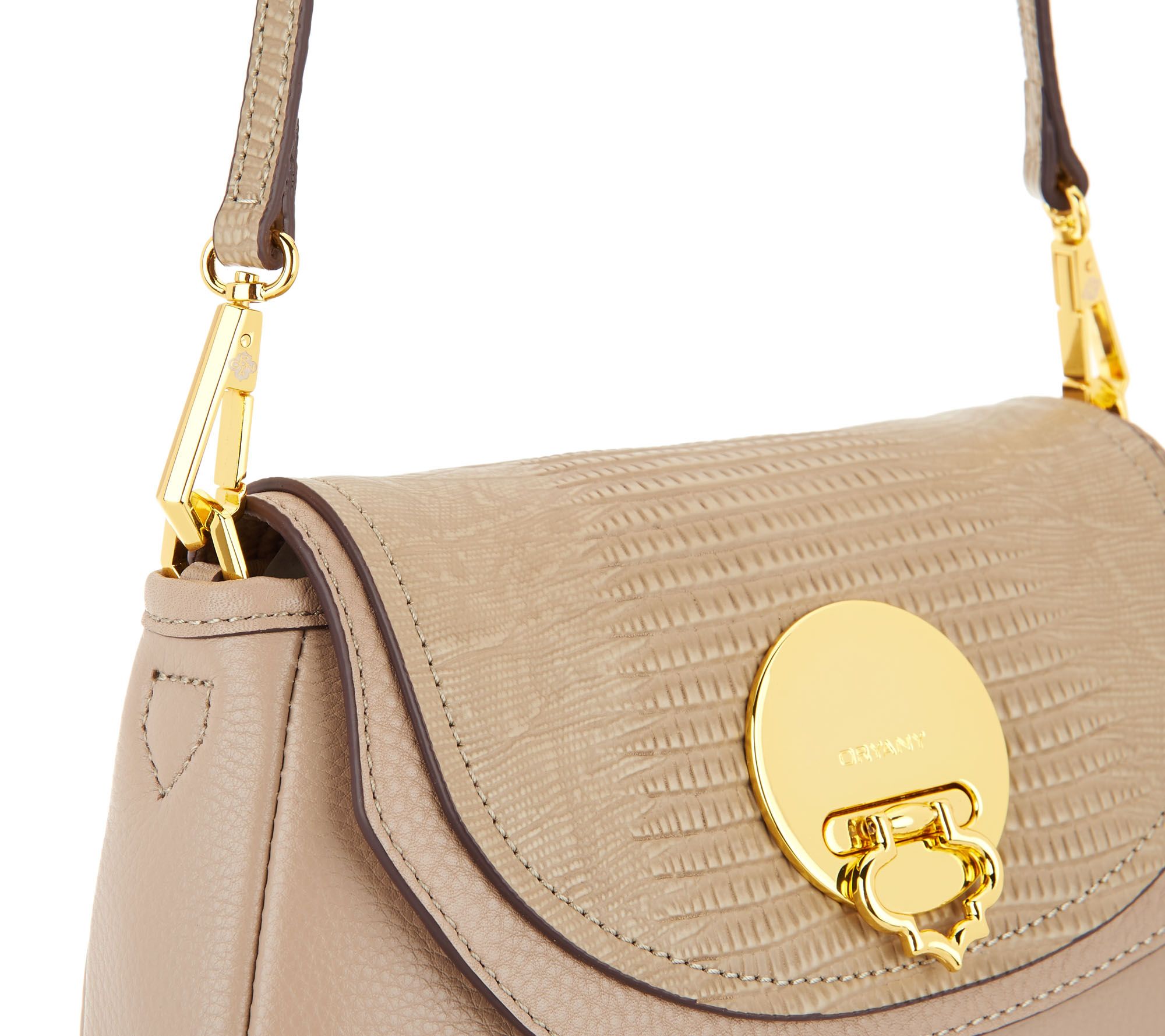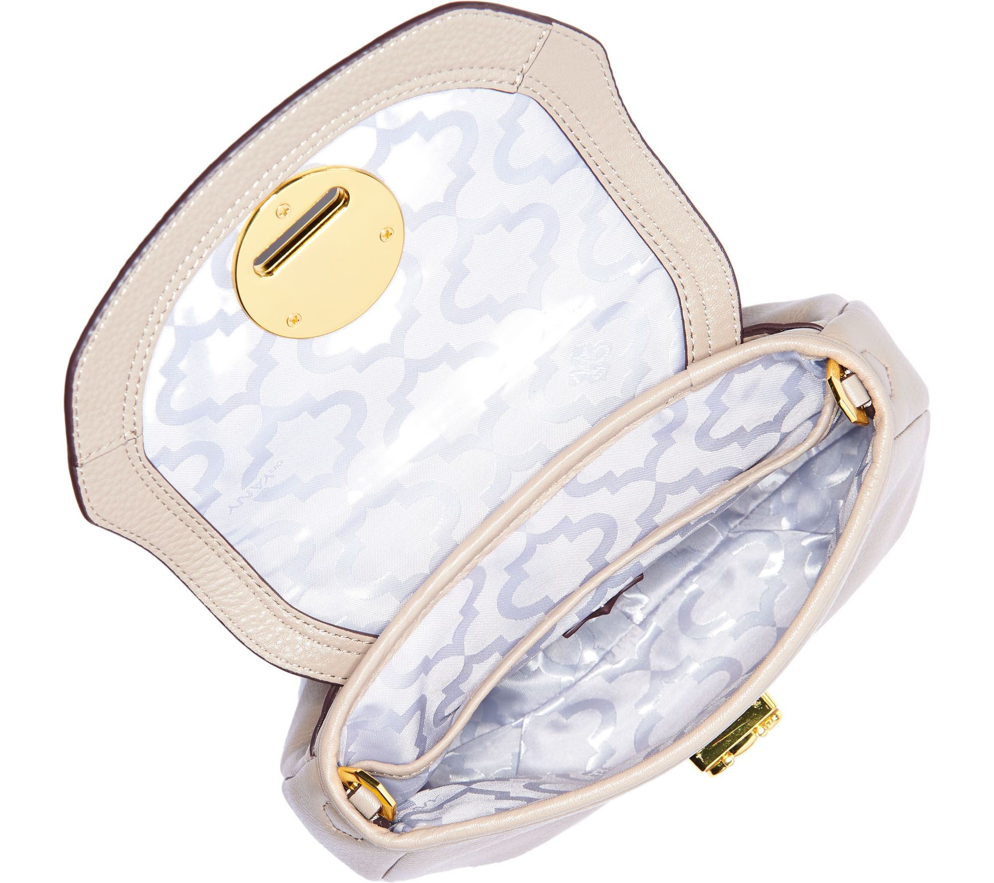 This pretty crossbody bag is a real attention-grabber with a signature lock and goldtone hardware. From orYANY.