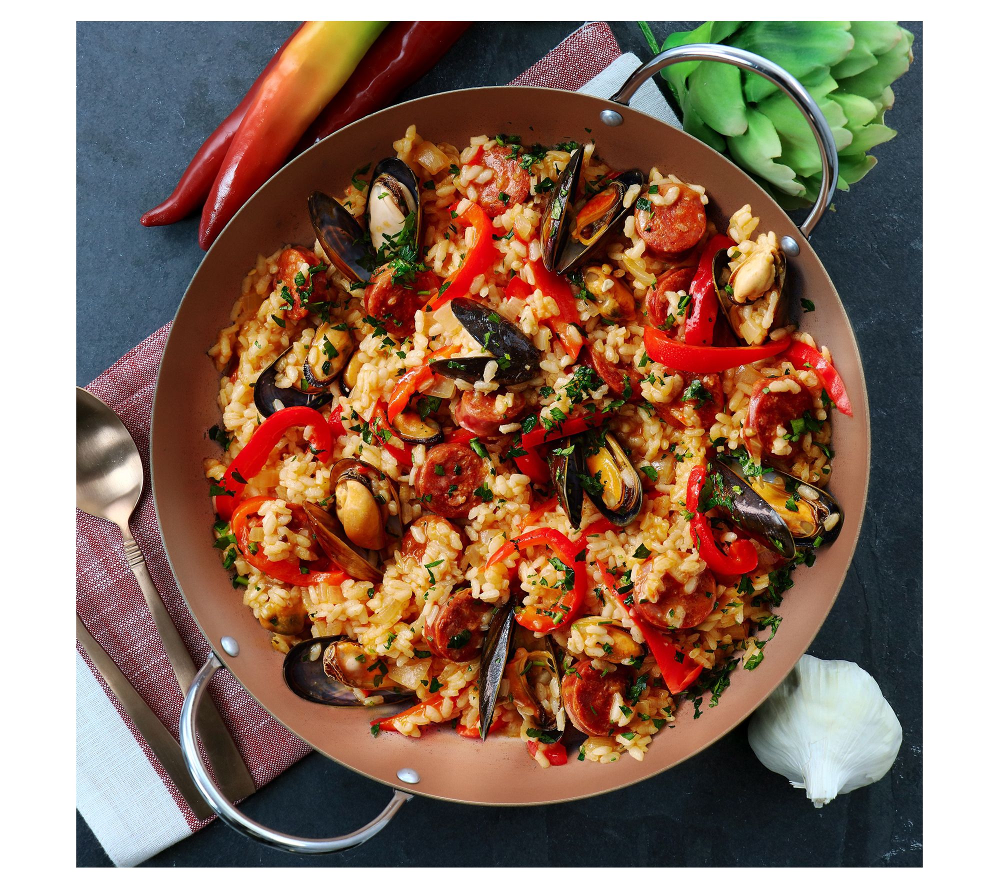 Create unique dishes and wonderful dining memories with this 11" paella pan with copper-finish interior. It's shaped just right to maximize the heating area, and the nonstick surface allows for easy food release. From Oster.