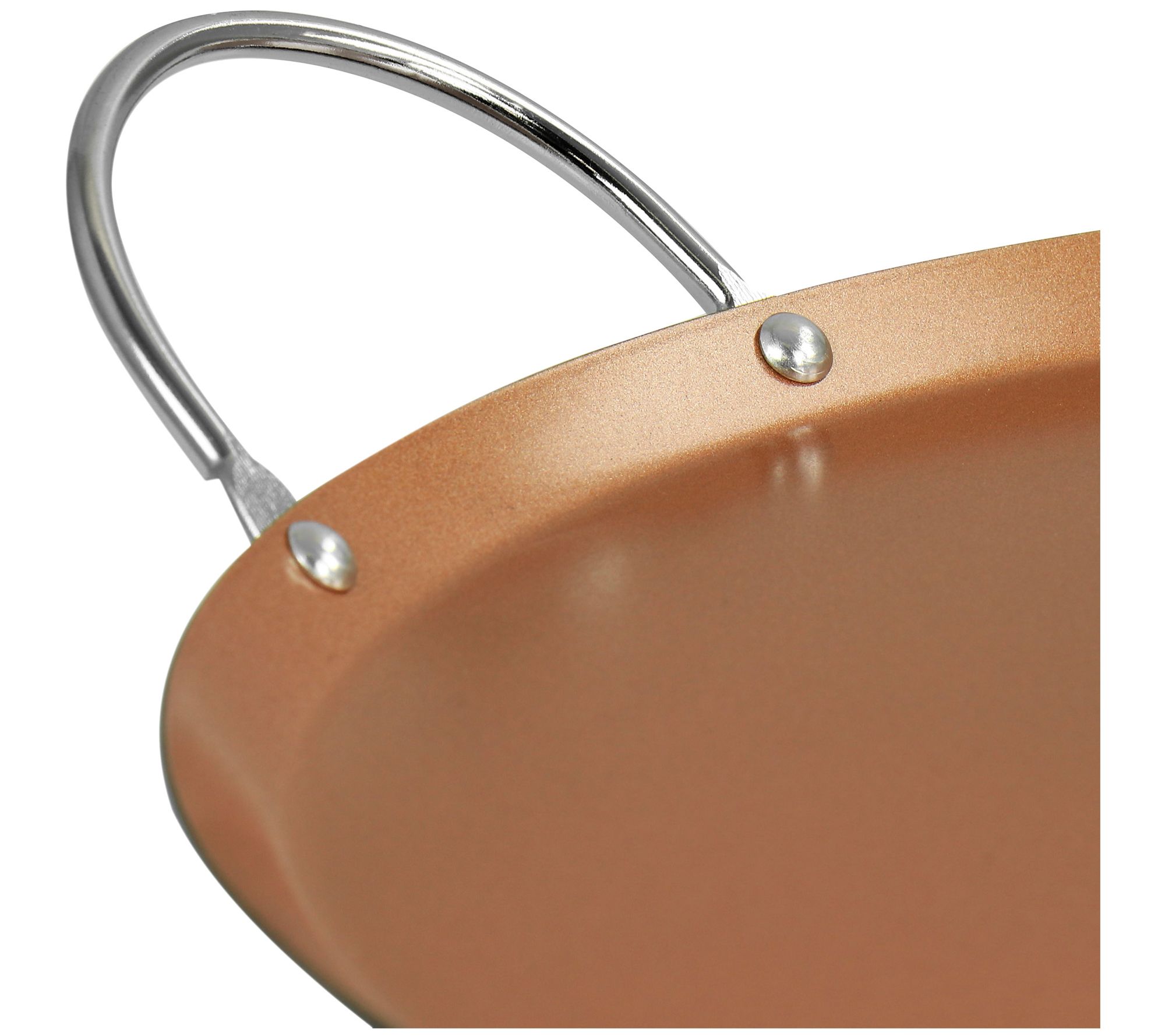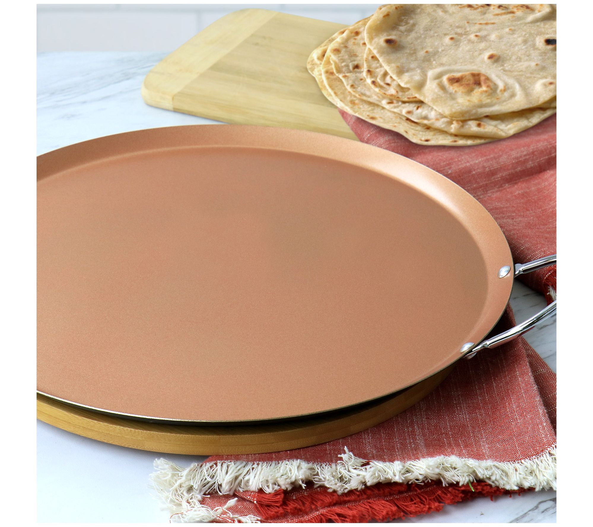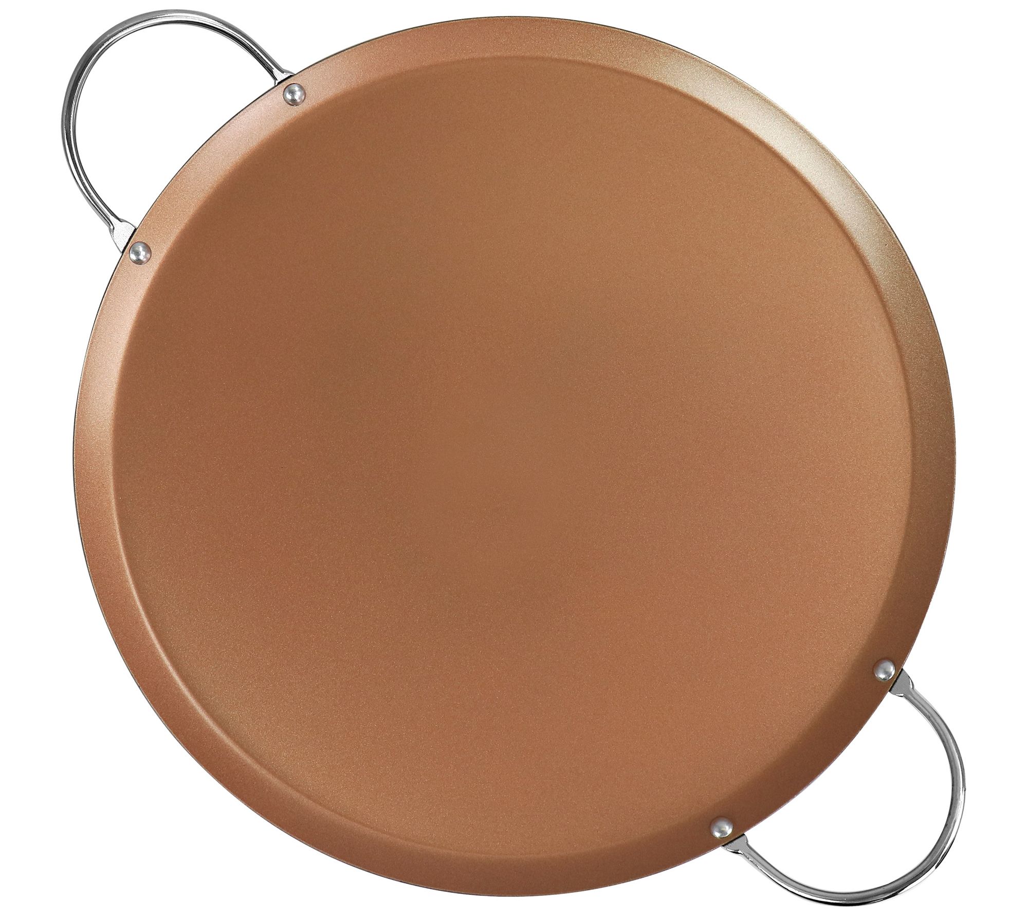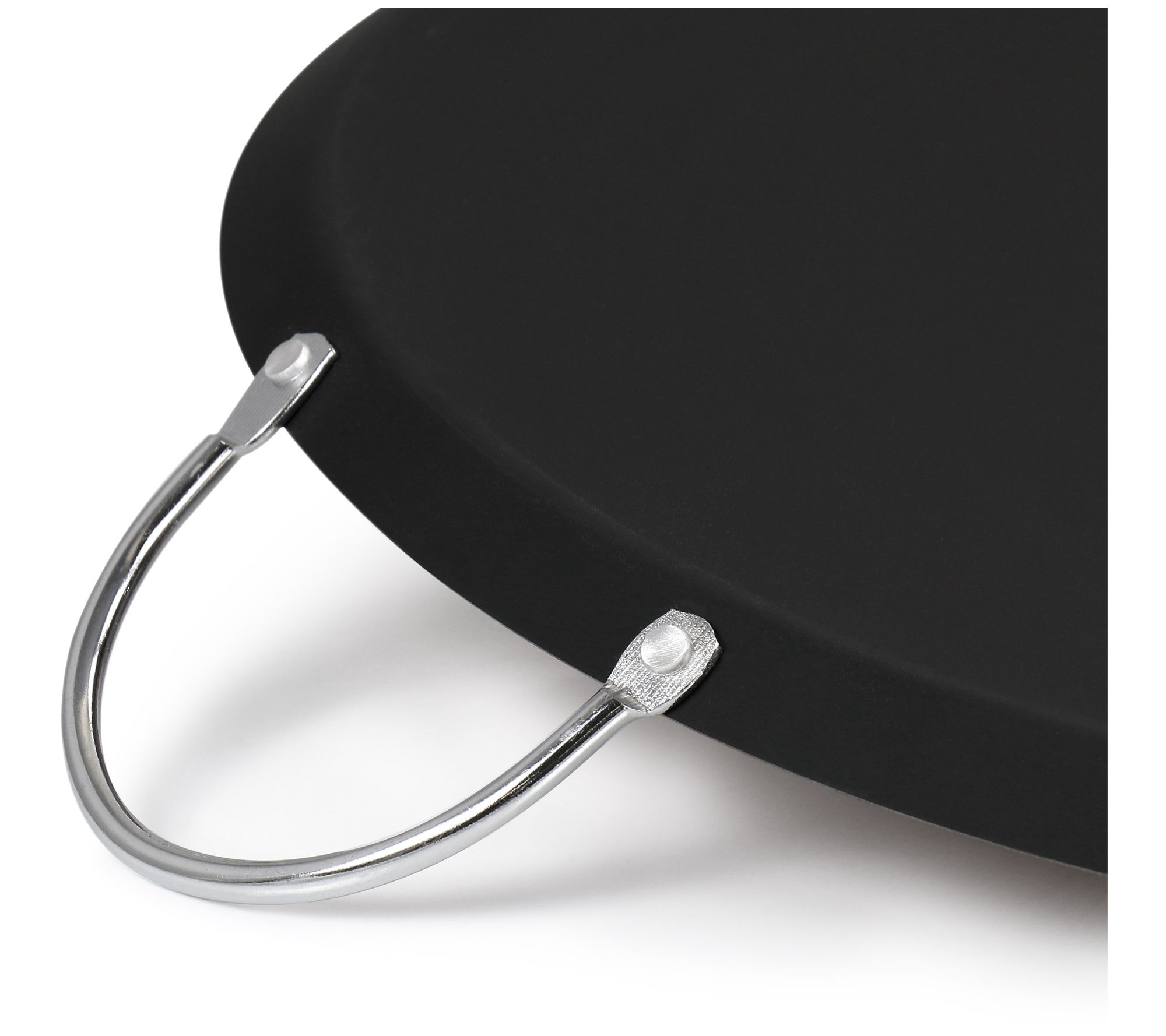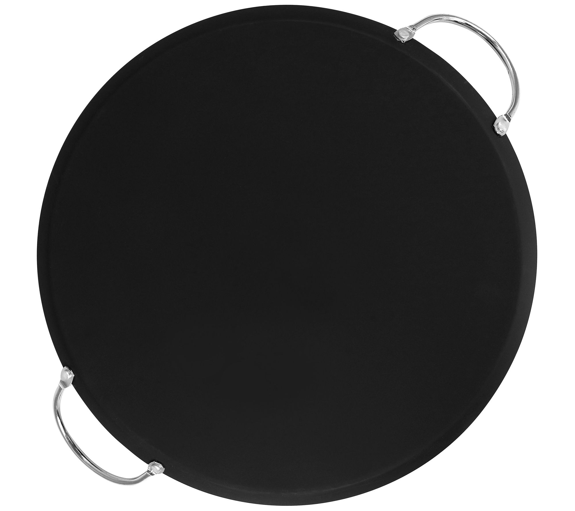 The Oster 14inch stonefire comal pan is constructed with durable carbon steel material for long lasting use. This pan has a non stick surface coating, allowing you to cook without using as much oil and making clean up a breeze. Two metal side handles make this pan easy to move from stove to countertop. Use this non stick comal to heat tortillas, cook meats, brown veggies, reheat meals, and more! With a large diameter surface of 14in, you can do some multi tasking and make more than one food at once.;One 14" Comal