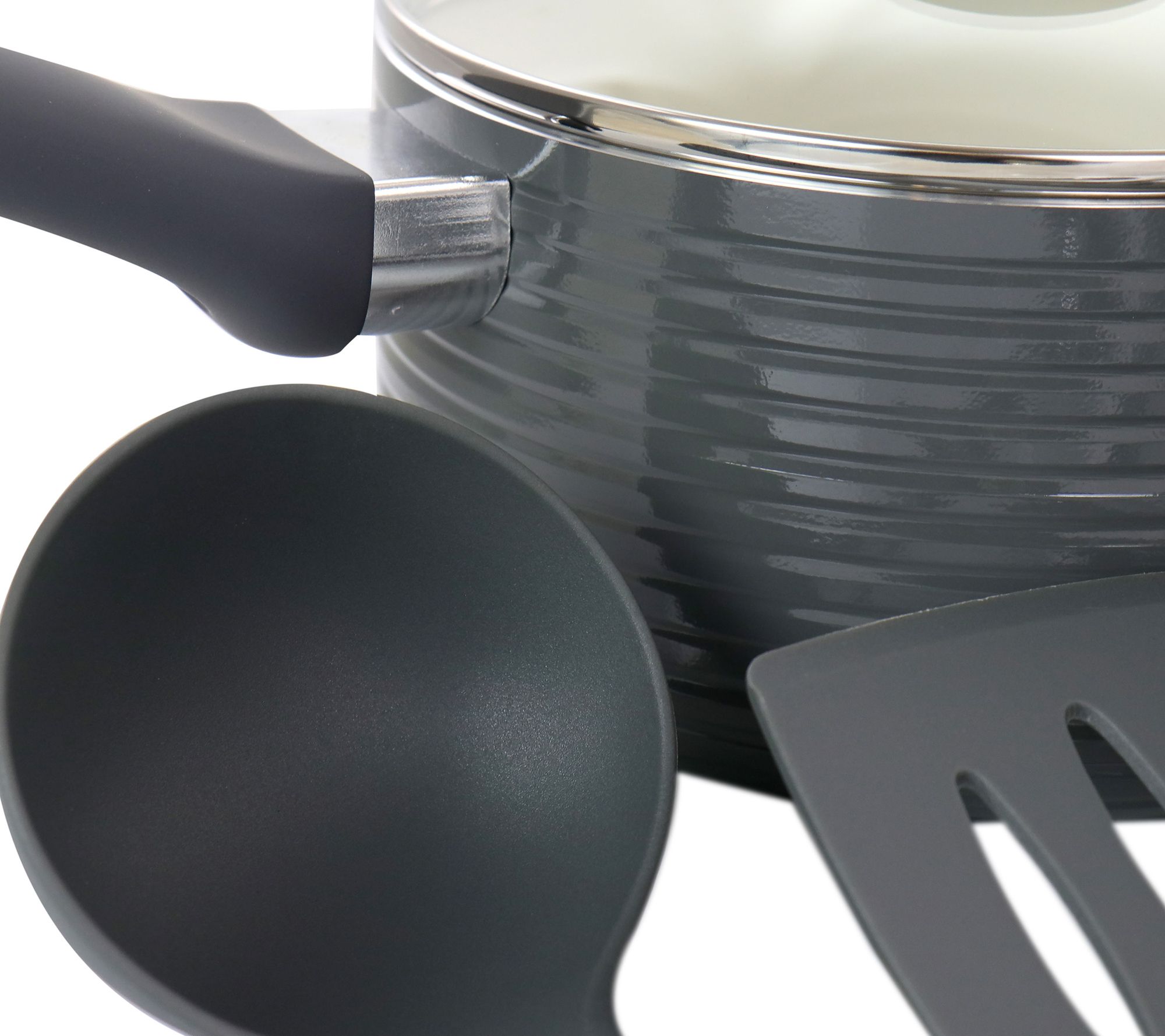 • Includes 6-qt covered Dutch oven, 2.5-qt covered saucepan, 9.5'' frying pan, spoon, slotted spoon, and slotted turner