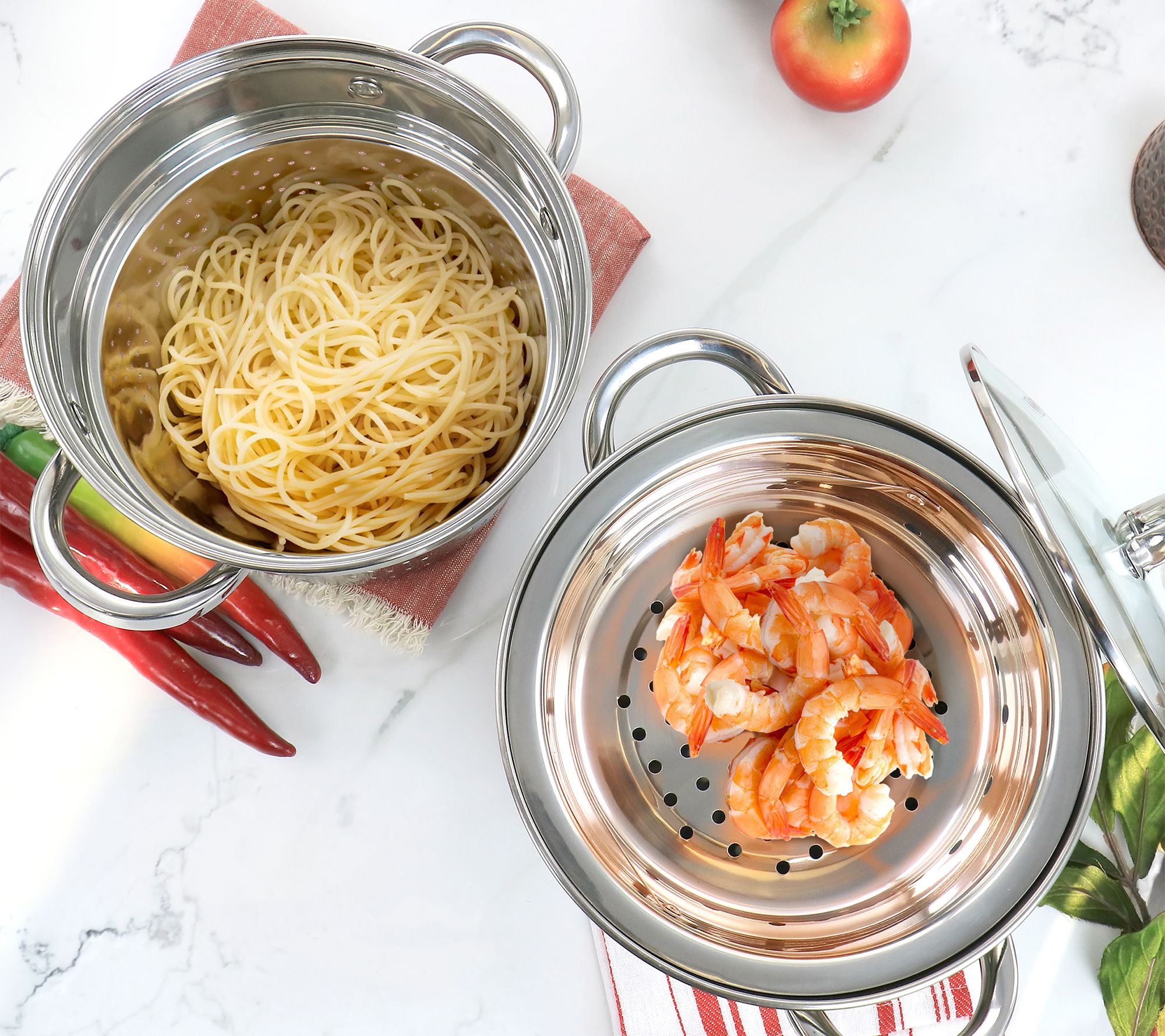 • Includes 5-qt covered pasta pot, steamer insert, and 1.3-qt steamer basket