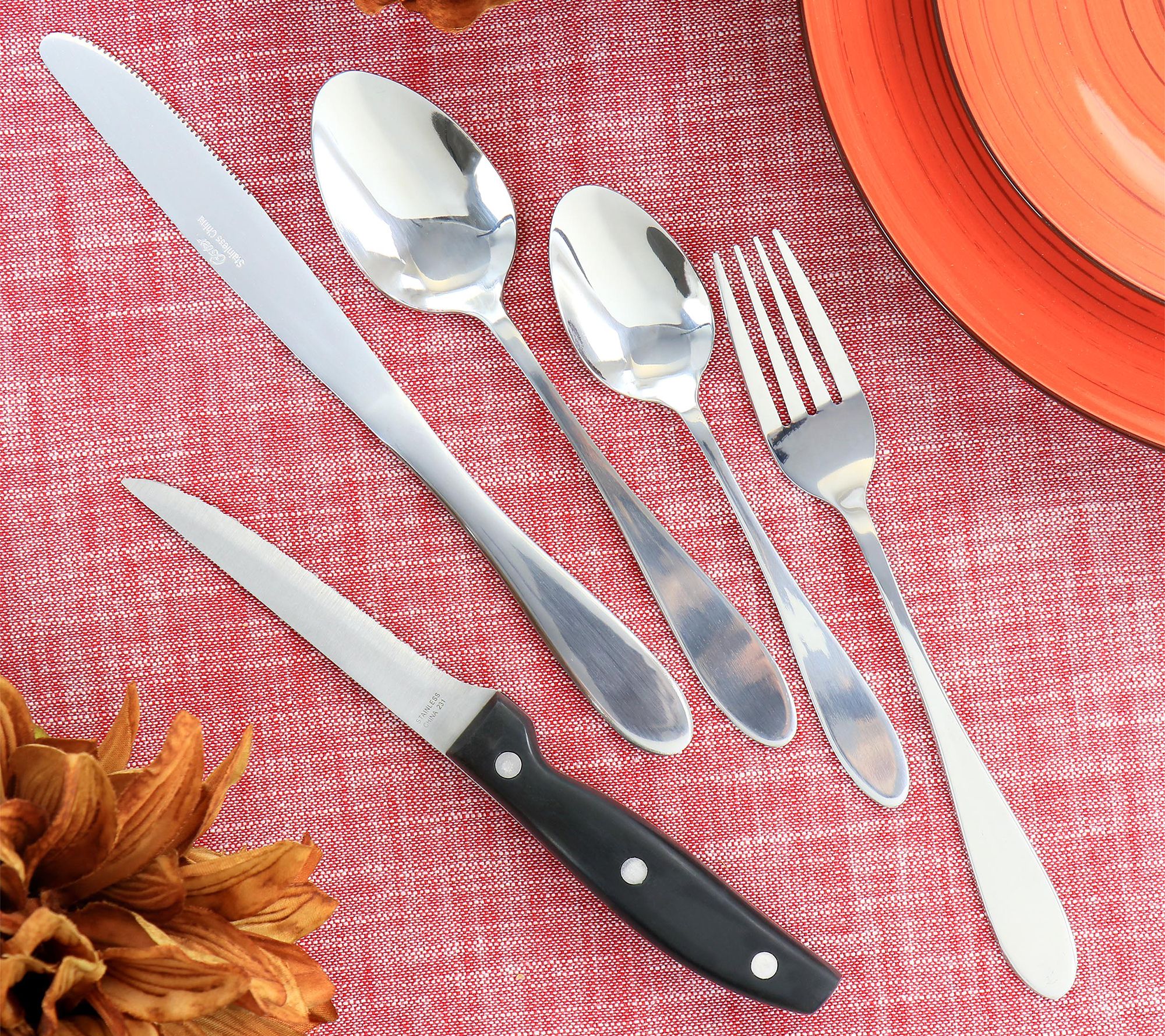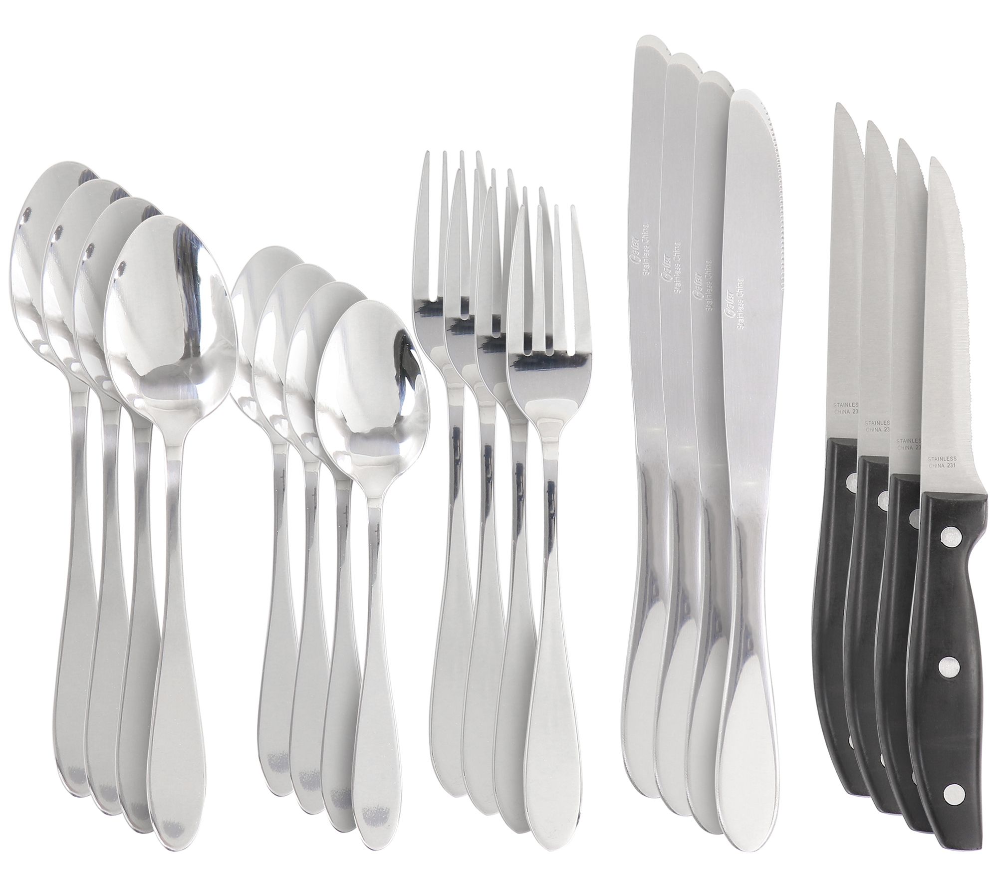 • Includes four dinner forks, four dinner knives, four dinner spoons, four teaspoons, and four steak knives