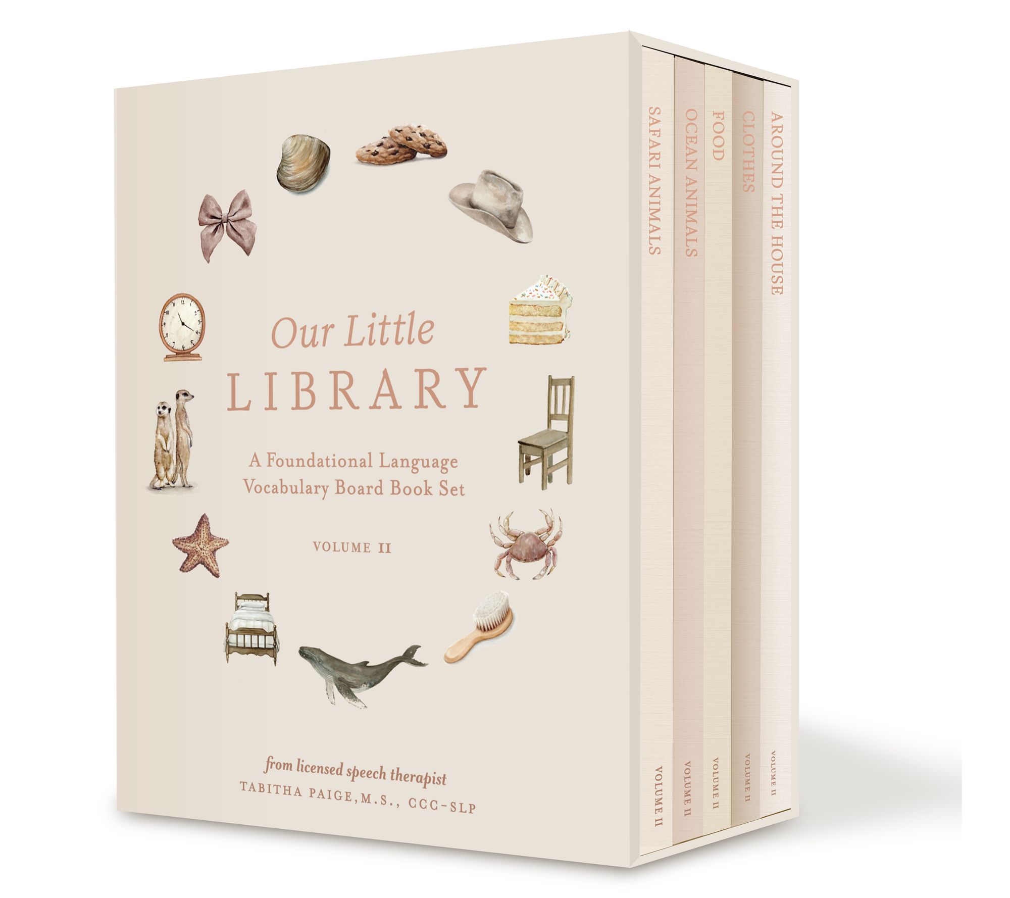 Transform your baby's vocabulary journey into a delightful adventure with Our Little Library Vol. 2. This set, designed by Tabitha Paige, combines professional watercolor artistry with her expertise as a speech therapist. Perfectly sized for tiny hands, each board book explores everyday themes like ocean animals and food and drink through captivating illustrations and seek-and-find activities. A thoughtful addition to any nursery, these durable books are an ideal shower gift or newborn surprise.