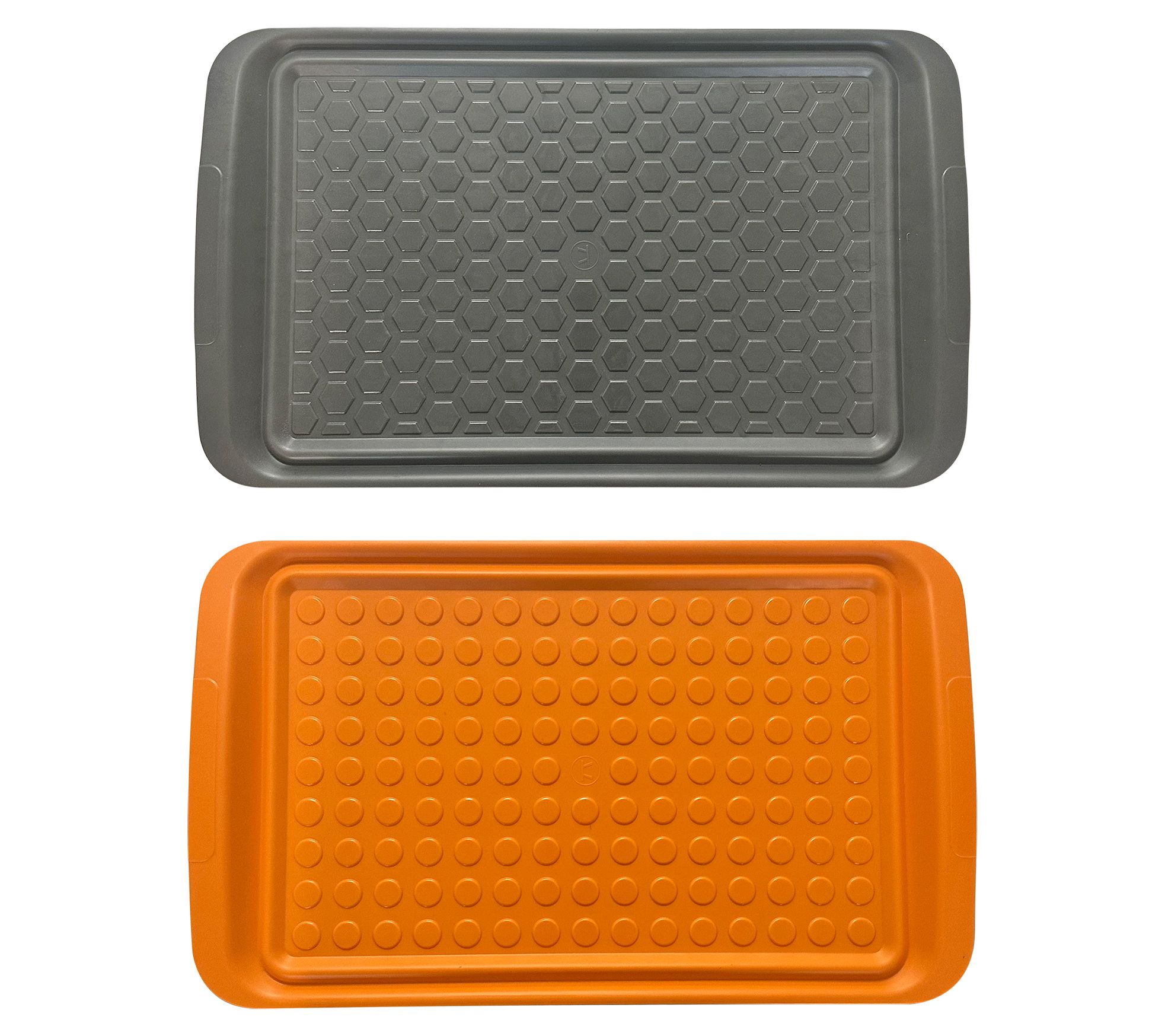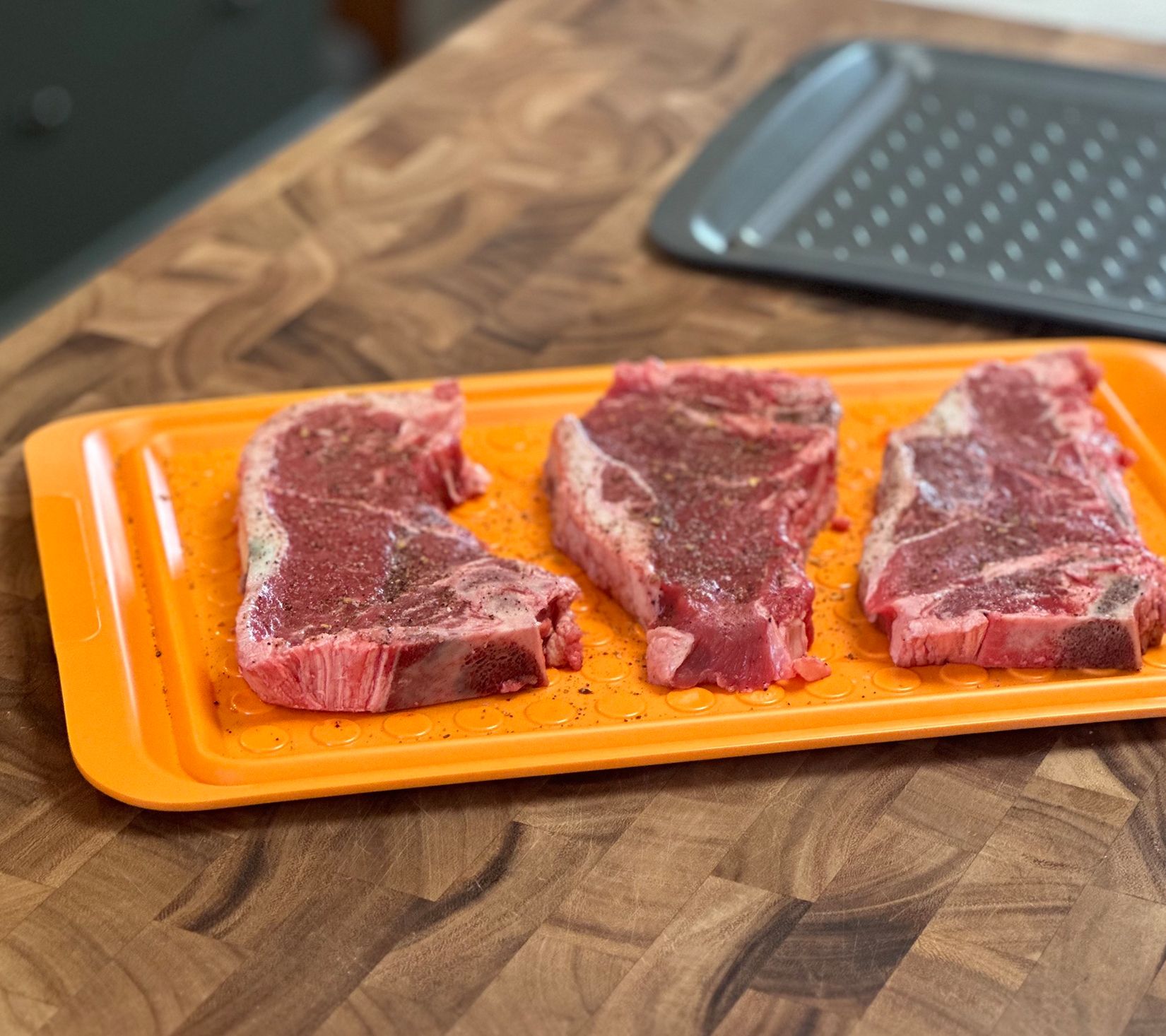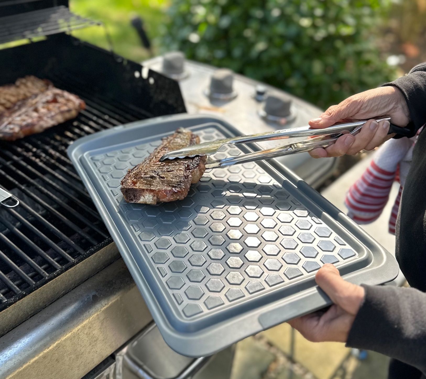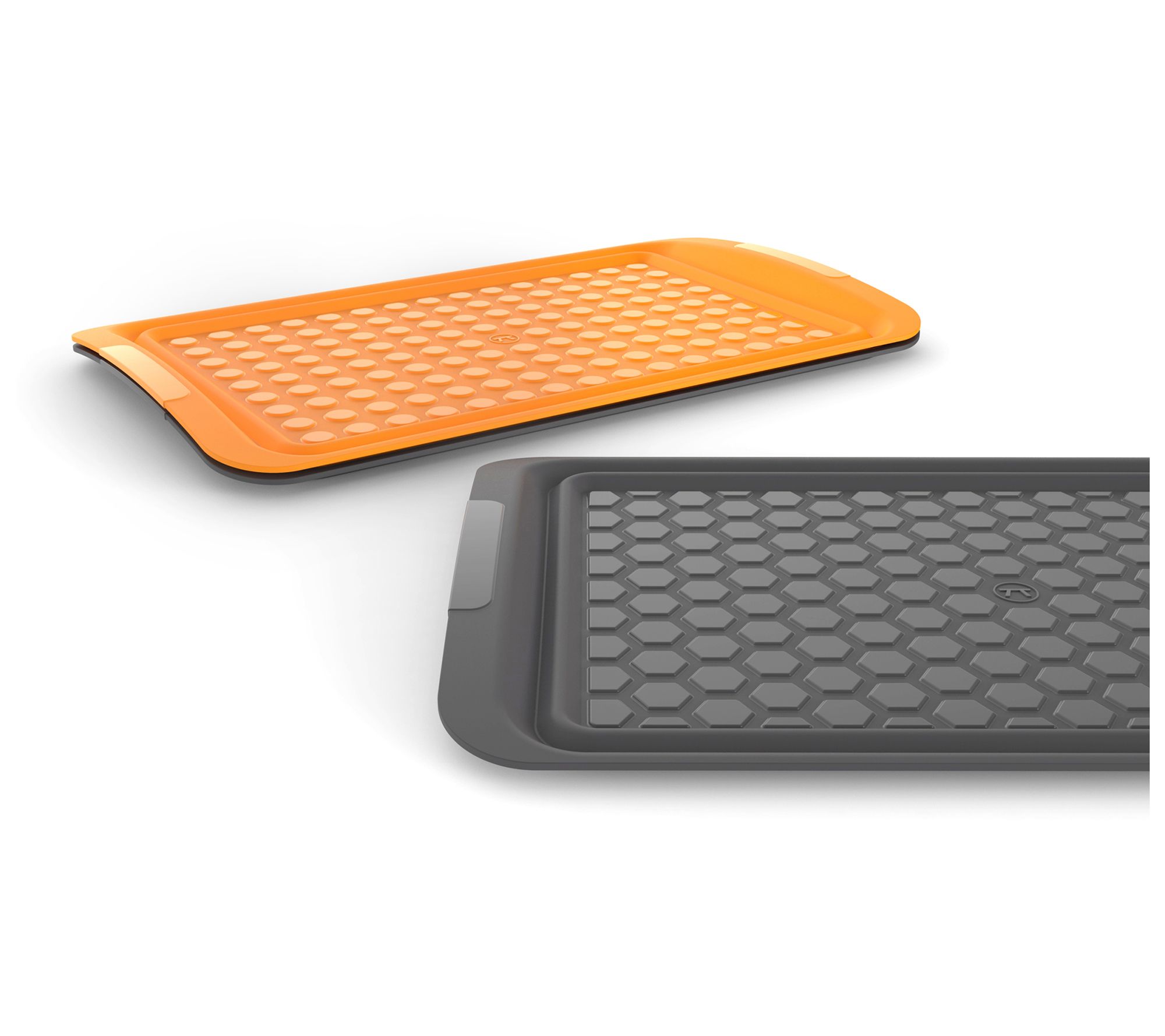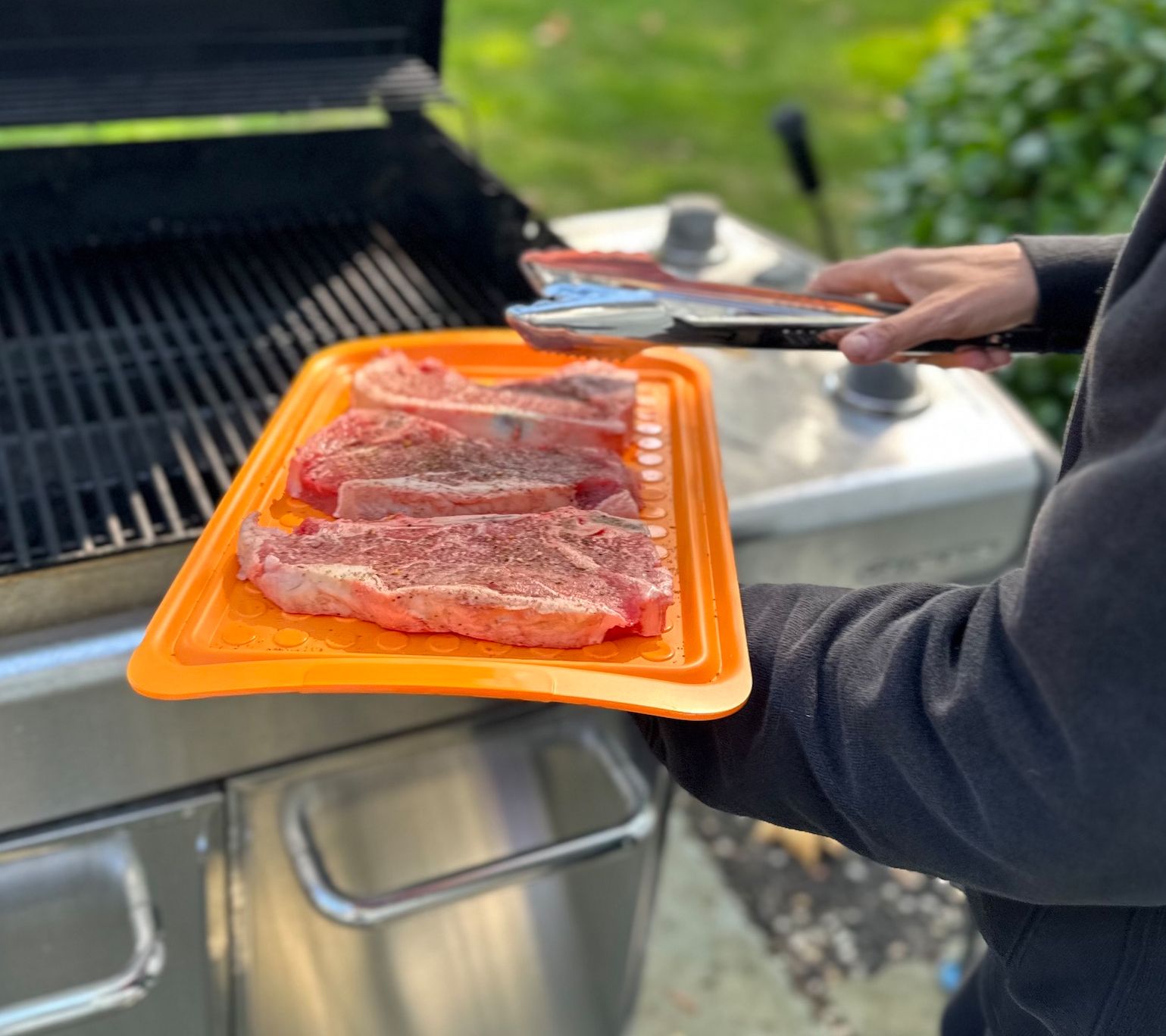 Elevate your grilling game with the Outset large prep trays. These color-coded trays, one in grey and one in orange, help you keep raw and cooked meats separate to prevent cross-contamination. The textured base ensures your food stays put while carrying, while the lightweight melamine construction makes them easy to transport. From Outset.